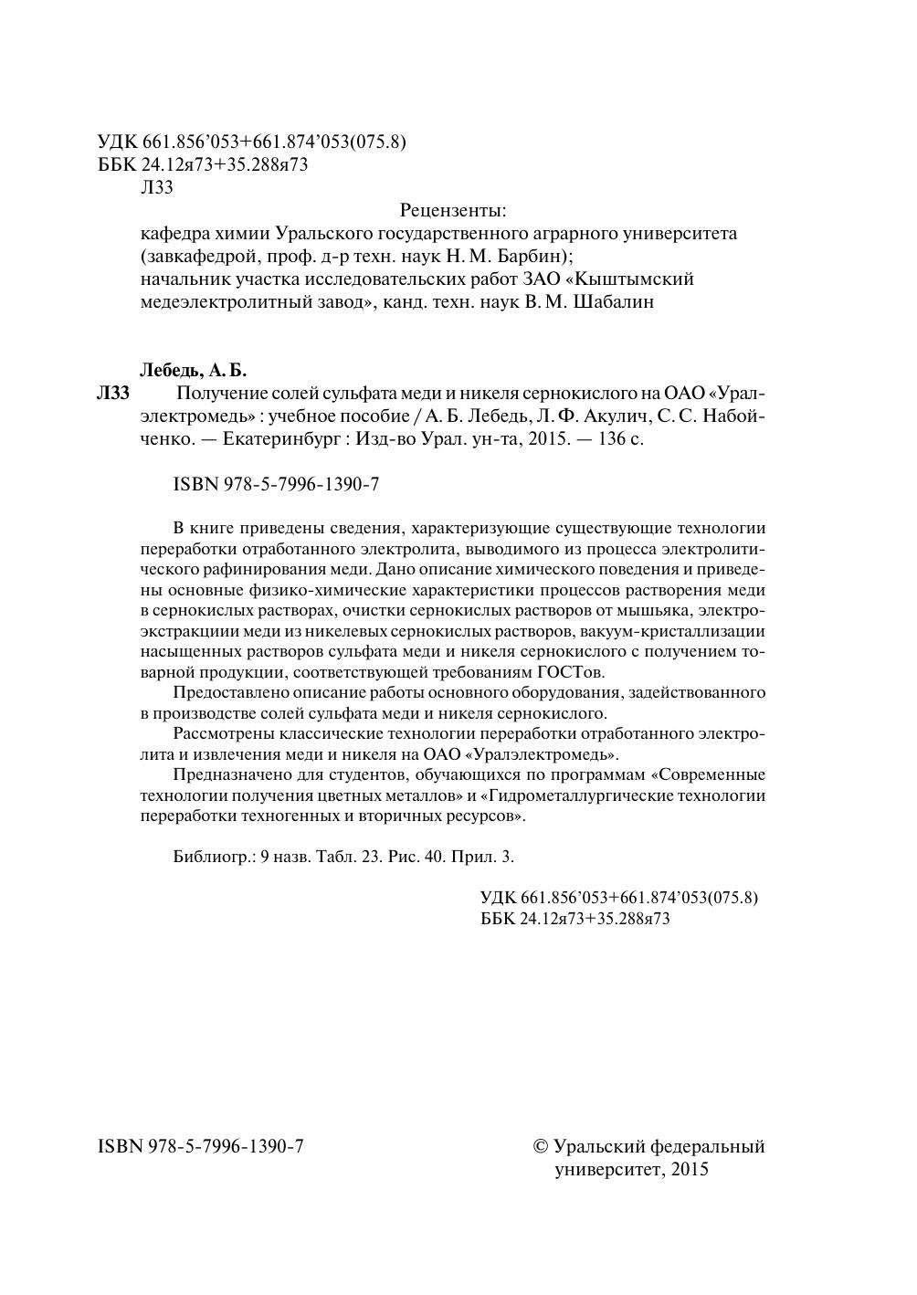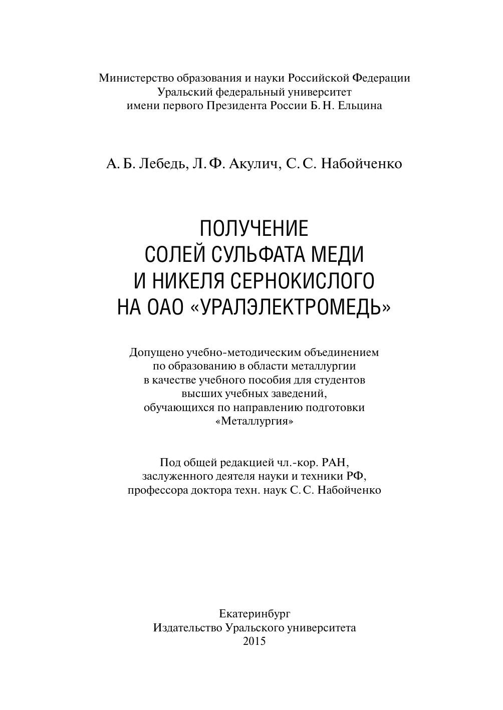 Получениесолей сульфата меди и никеля сернокислого на ОАО «Уралэлектромедь» : учебное пособие