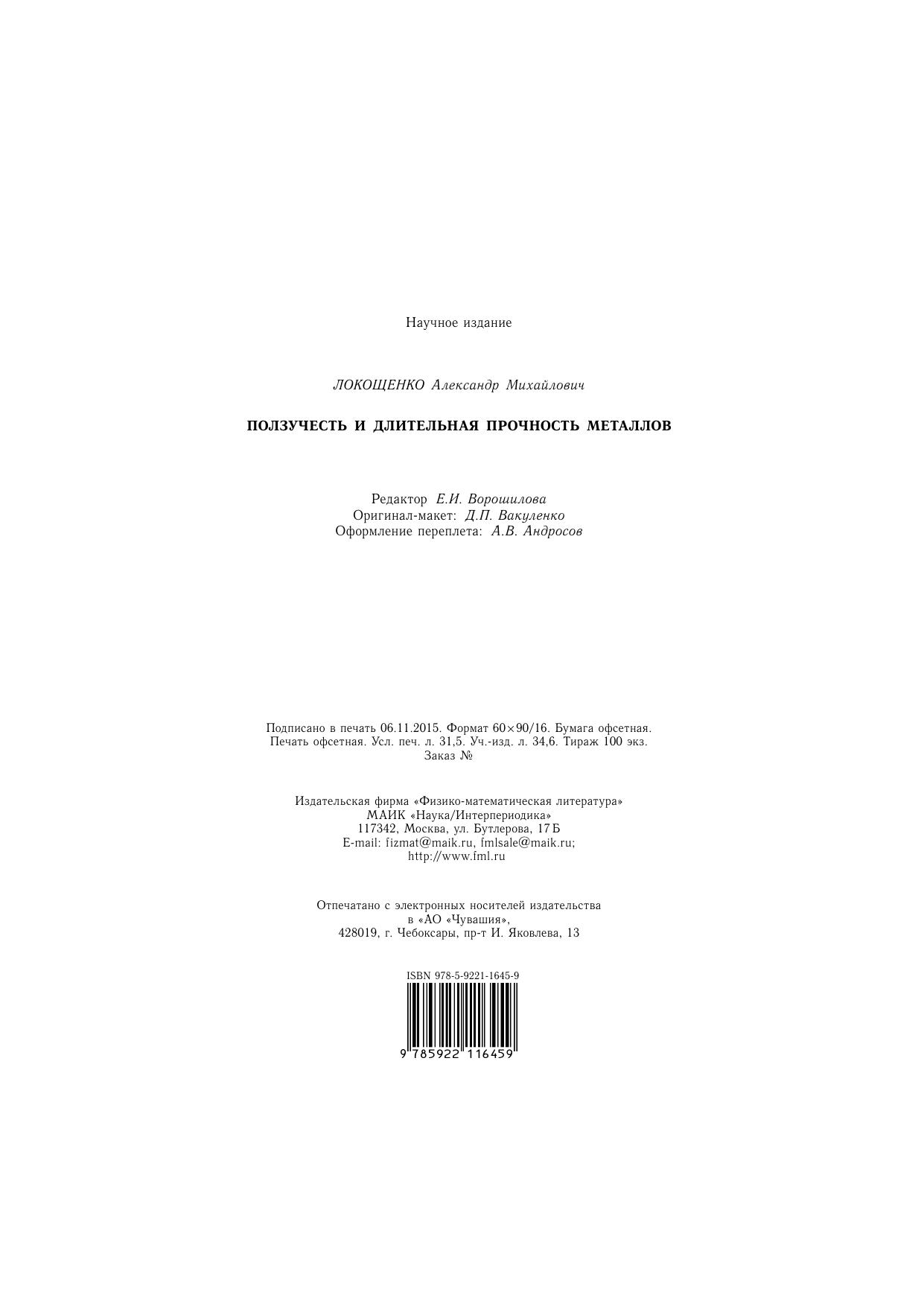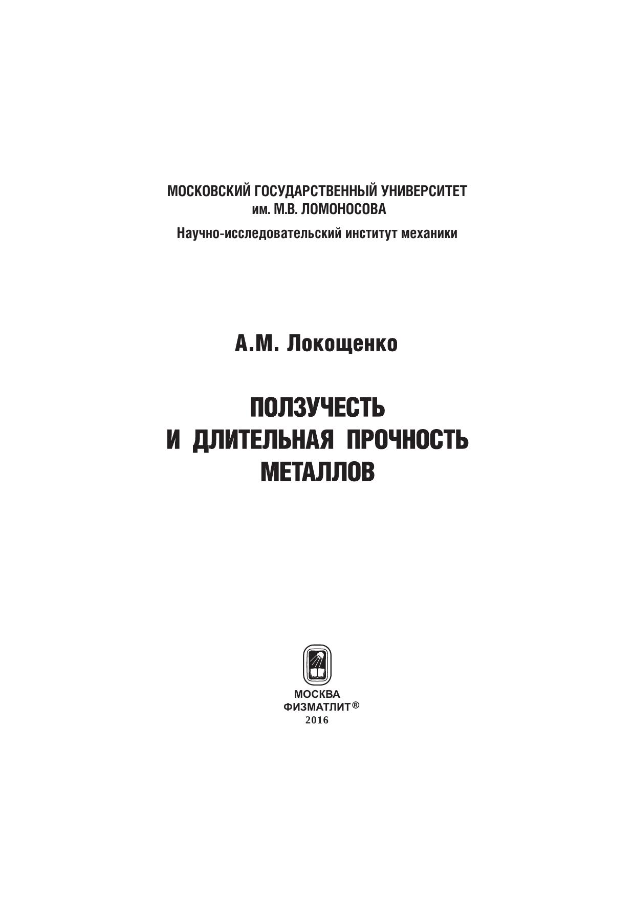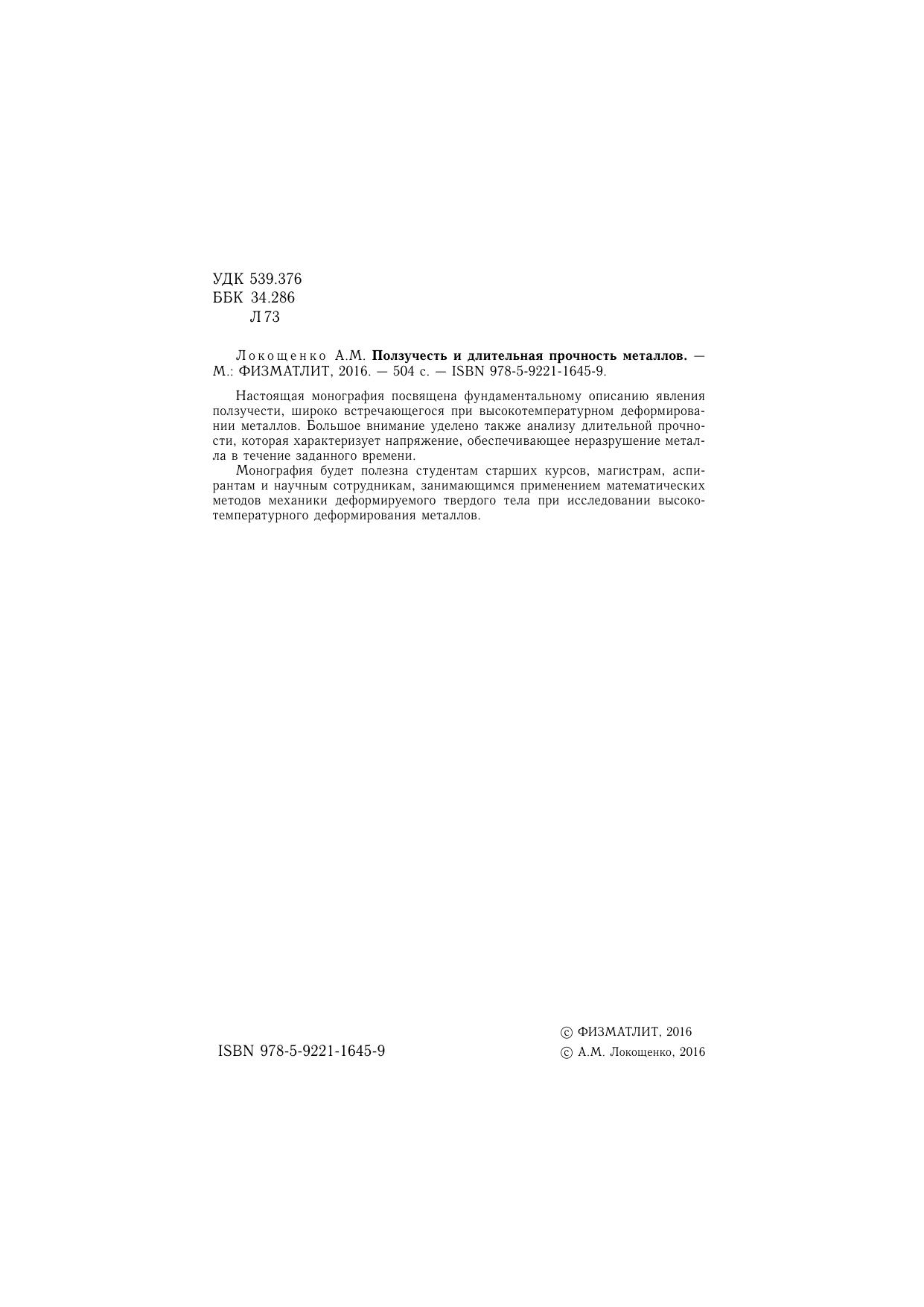 Настоящая монография посвящена фундаментальному описанию явления ползучести, широко встречающегося при высокотемпературном деформировании металлов. Большое внимание уделено также анализу длительной прочности, которая характеризует напряжение, обеспечивающее неразрушение металла в течение заданного времени.