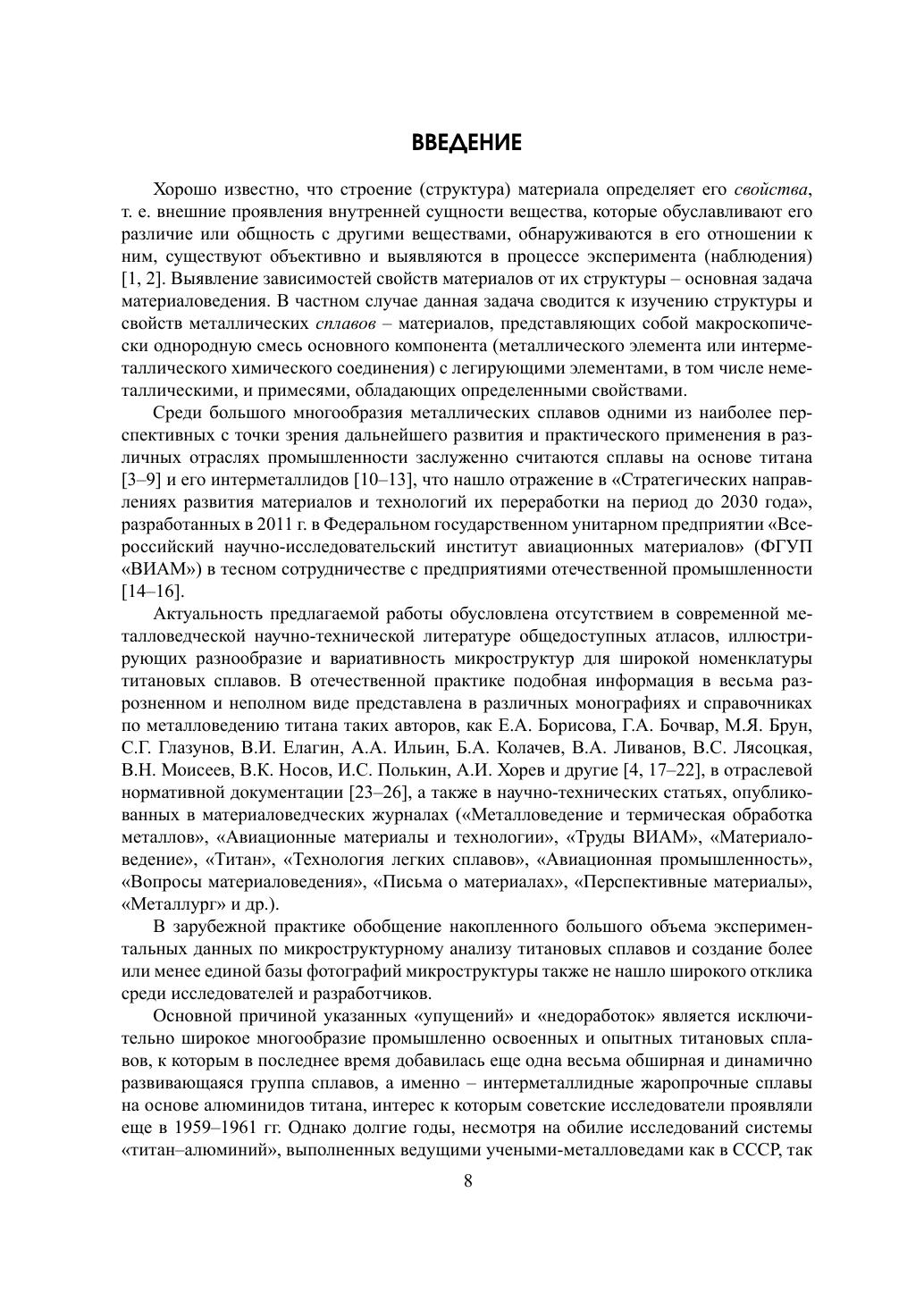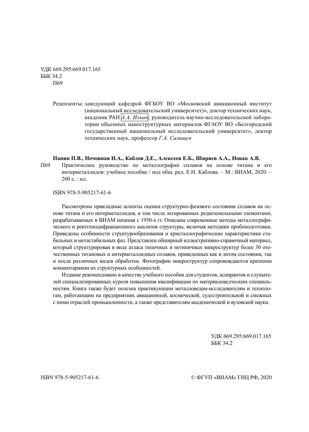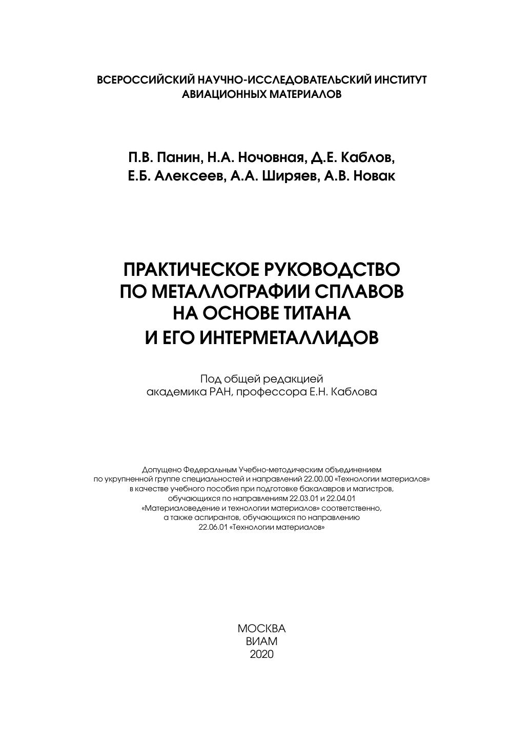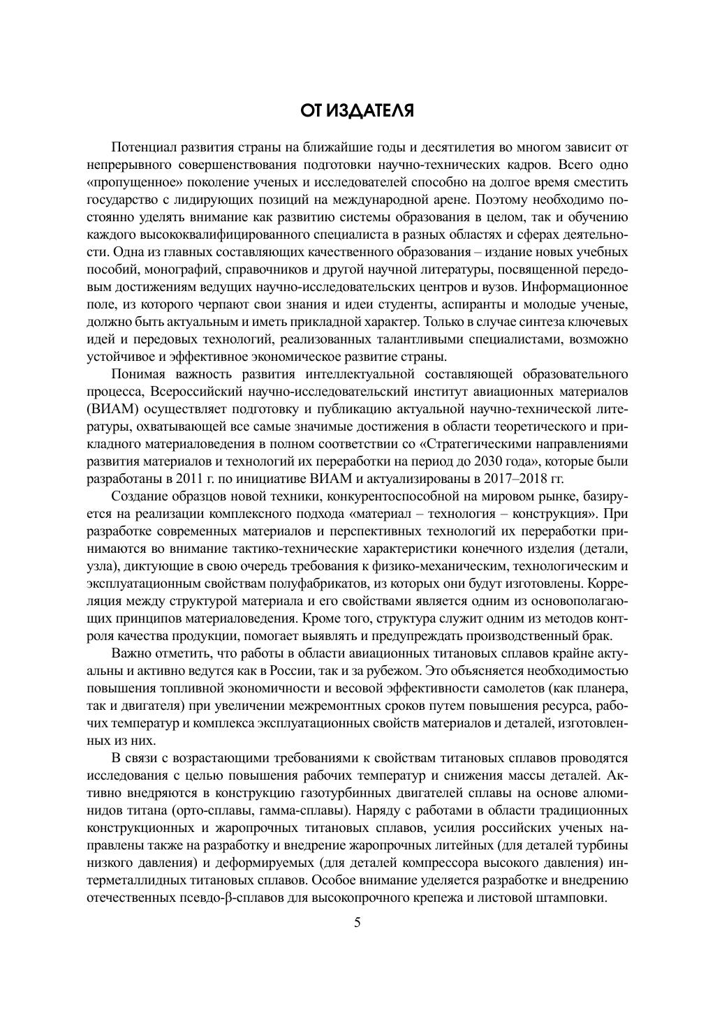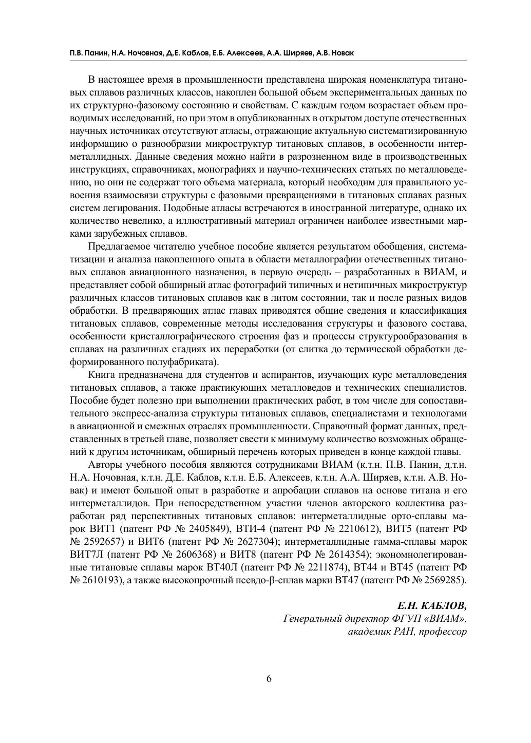 Рассмотрены прикладные аспекты оценки структурно-фазового состояния сплавов на основе титана и его интерметаллидов, в том числе легированных редкоземельными элементами, разрабатываемых в ВИАМ начиная с 1950-х гг. Описаны современные методы металлографического и рентгенодифракционного анализов структуры, включая методики пробоподготовки. Приведены особенности структурообразования и кристаллографические характеристики стабильных и метастабильных фаз. Представлен обширный иллюстративно-справочный материал, который структурирован в виде атласа типичных и нетипичных микроструктур более 30 отечественных титановых и интерметаллидных сплавов, приведенных как в литом состоянии, так и после различных видов обработки. Фотографии микроструктур сопровождаются краткими комментариями их структурных особенностей. Издание рекомендовано в качестве учебного пособия для студентов, аспирантов и слушателей специализированных курсов повышения квалификации по материаловедческим специальностям. Книга также будет полезна практикующим металловедам-исследователям и технологам, работающим на предприятиях авиационной, космической, судостроительной и смежных с ними отраслей промышленности, а также представителям академической и вузовской науки.