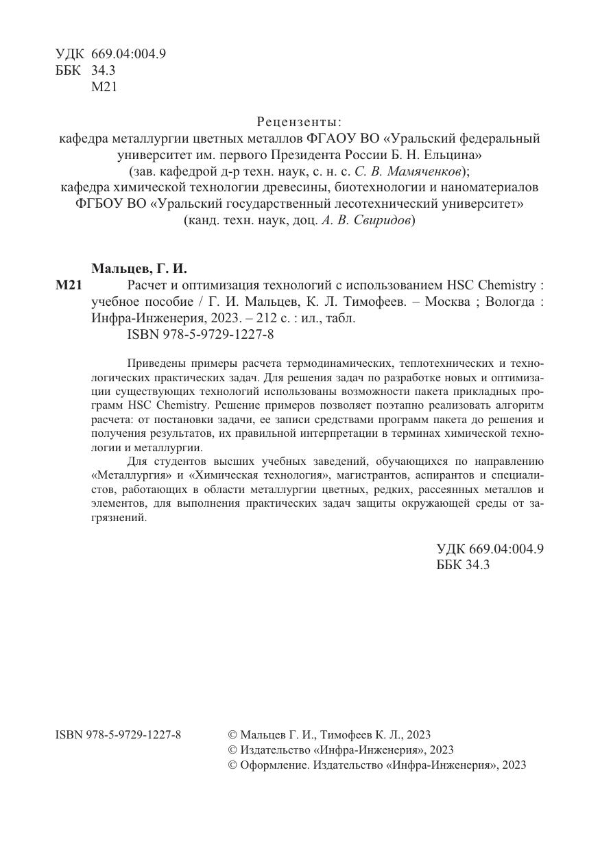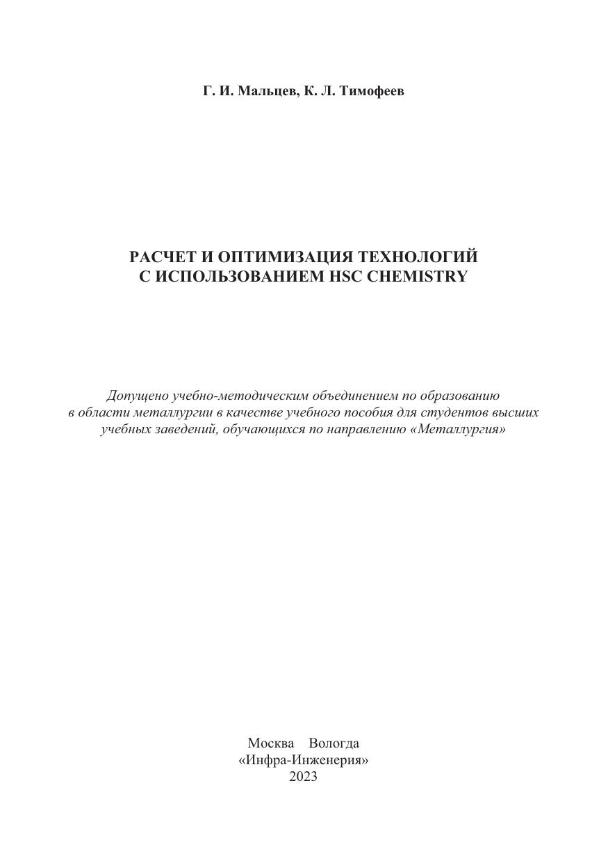 Приведены примеры расчета термодинамических, теплотехнических и технологических практических задач. Для решения задач по разработке новых и оптимизации существующих технологий использованы возможности пакета прикладных программ HSC Chemistry. Решение примеров позволяет поэтапно реализовать алгоритм расчета: от постановки задачи, ее записи средствами программ пакета до решения и получения результатов, их правильной интерпретации в терминах химической технологии и металлургии.