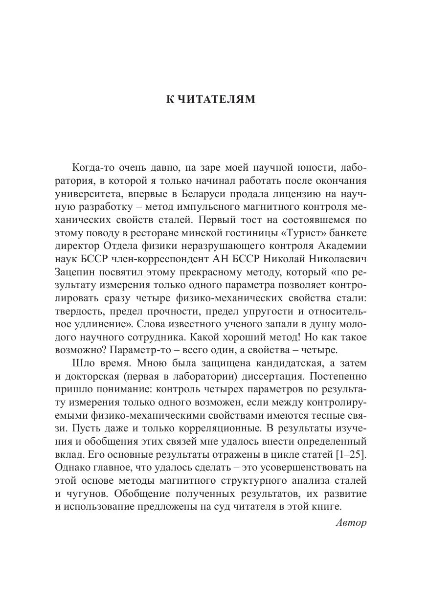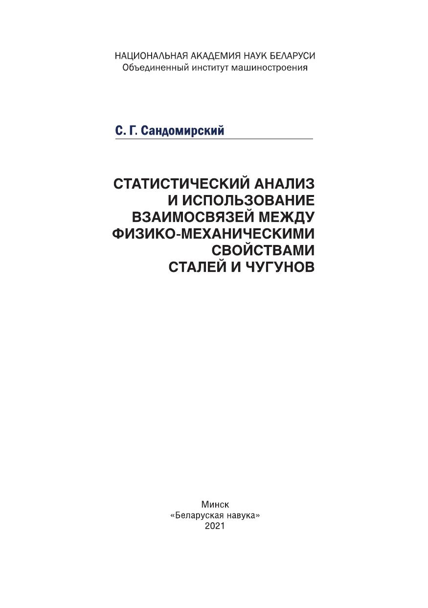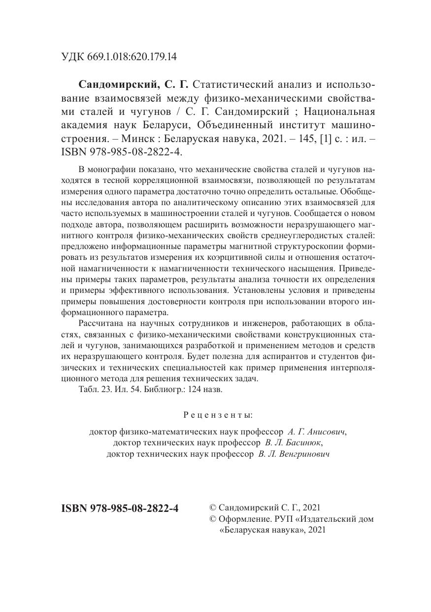 В монографии показано, что механические свойства сталей и чугунов находятся в тесной корреляционной взаимосвязи, позволяющей по результатам измерения одного параметра достаточно точно определить остальные. Обобщены исследования автора по аналитическому описанию этих взаимосвязей для часто используемых в машиностроении сталей и чугунов. Сообщается о новом подходе автора, позволяющем расширить возможности неразрушающего магнитного контроля физико-механических свойств среднеуглеродистых сталей: предложено информационные параметры магнитной структуроскопии формировать из результатов измерения их коэрцитивной силы и отношения остаточной намагниченности к намагниченности технического насыщения. Приведены примеры таких параметров, результаты анализа точности их определения и примеры эффективного использования. Установлены условия и приведены примеры повышения достоверности контроля при использовании второго информационного параметра.