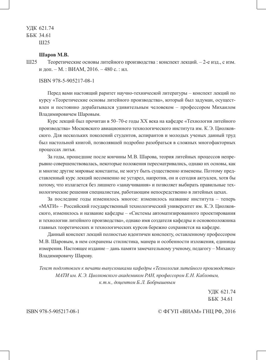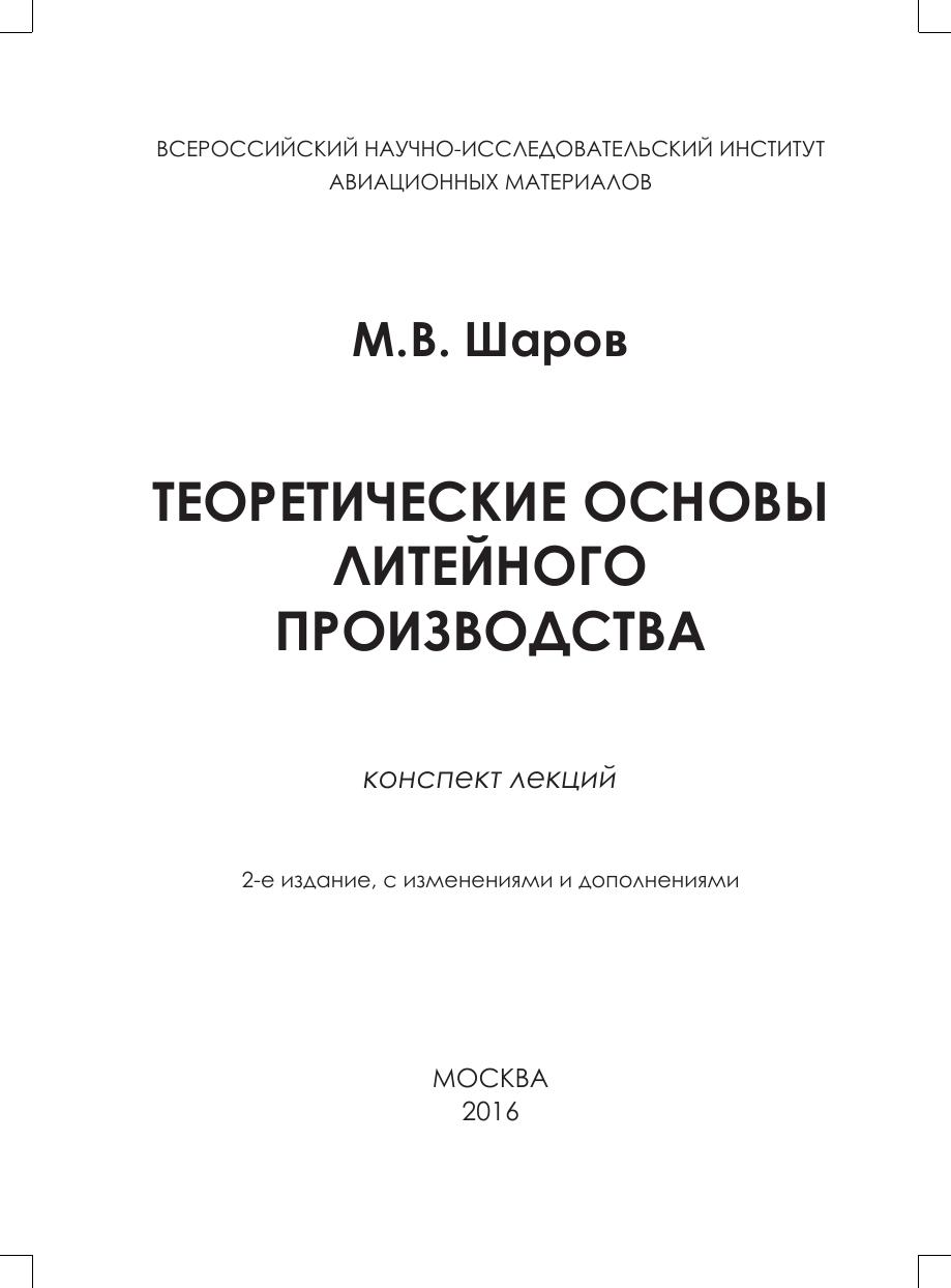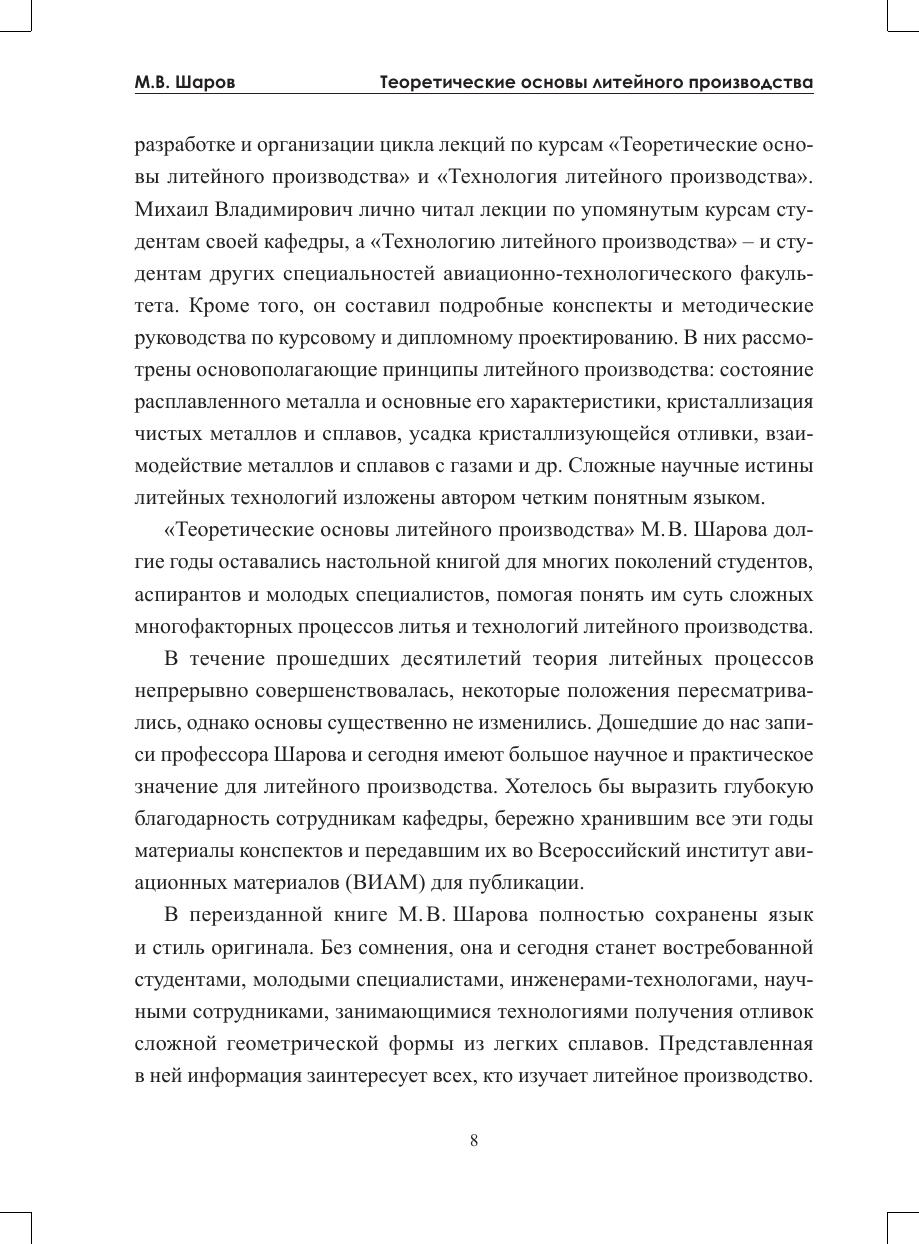 За годы, прошедшие после кончины М. В. Шарова, теория литейных процессов непрерывно совершенствовалась, некоторые положения пересматривались, однако их основы, как и многие другие мировые константы, не могут быть существенно изменены. Поэтому представленный курс лекций несомненно не устарел, напротив, он и сегодня актуален, хотя бы потому, что излагается без лишнего «занаучивания» и позволяет выбирать правильные технологические решения специалистам, работающим непосредственно в литейных цехах.