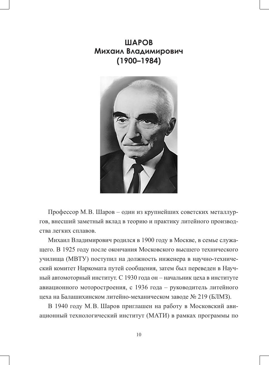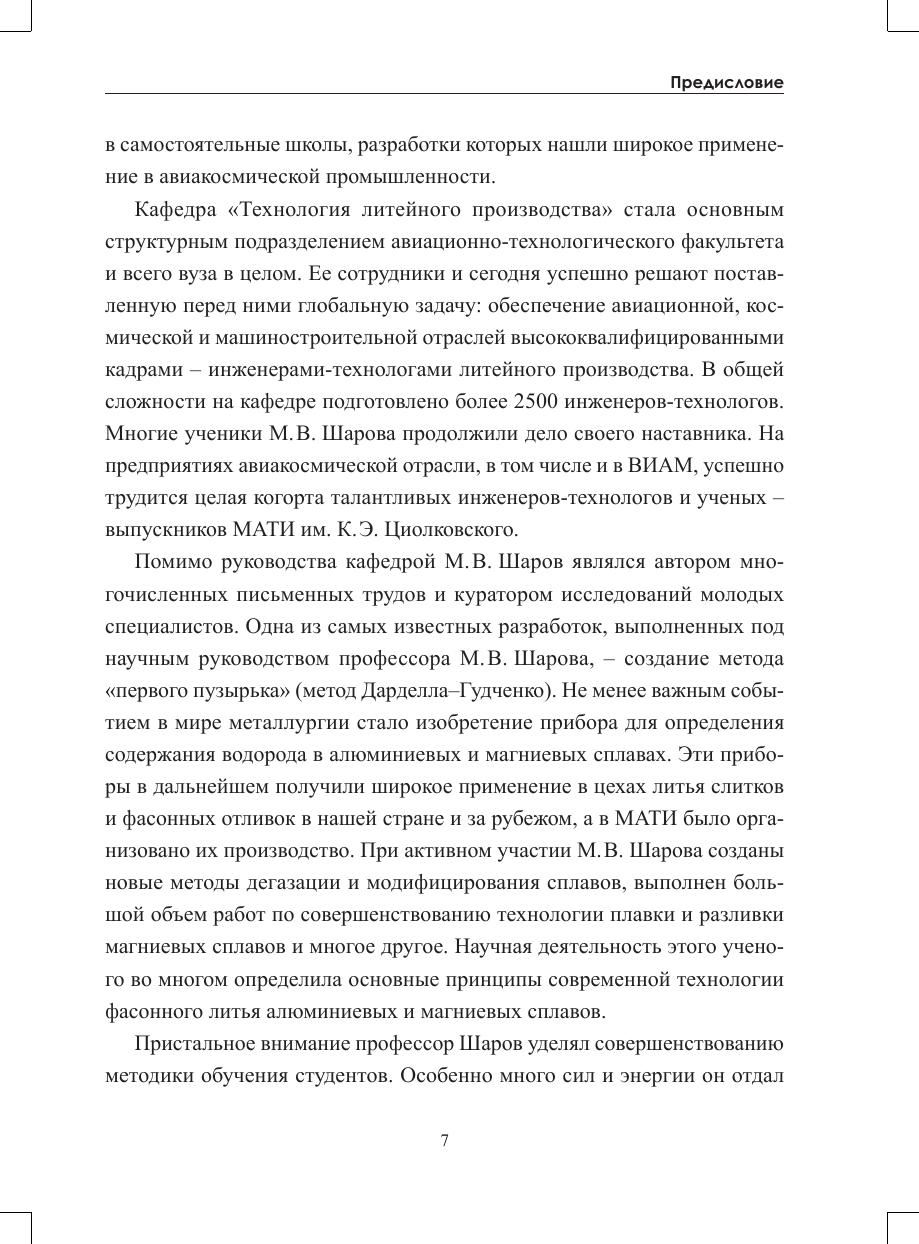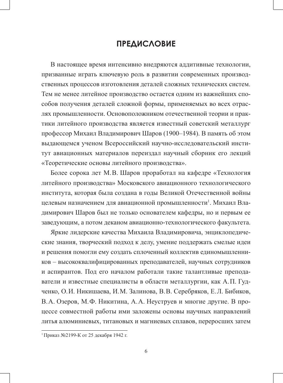 За годы, прошедшие после кончины М. В. Шарова, теория литейных процессов непрерывно совершенствовалась, некоторые положения пересматривались, однако их основы, как и многие другие мировые константы, не могут быть существенно изменены. Поэтому представленный курс лекций несомненно не устарел, напротив, он и сегодня актуален, хотя бы потому, что излагается без лишнего «занаучивания» и позволяет выбирать правильные технологические решения специалистам, работающим непосредственно в литейных цехах.