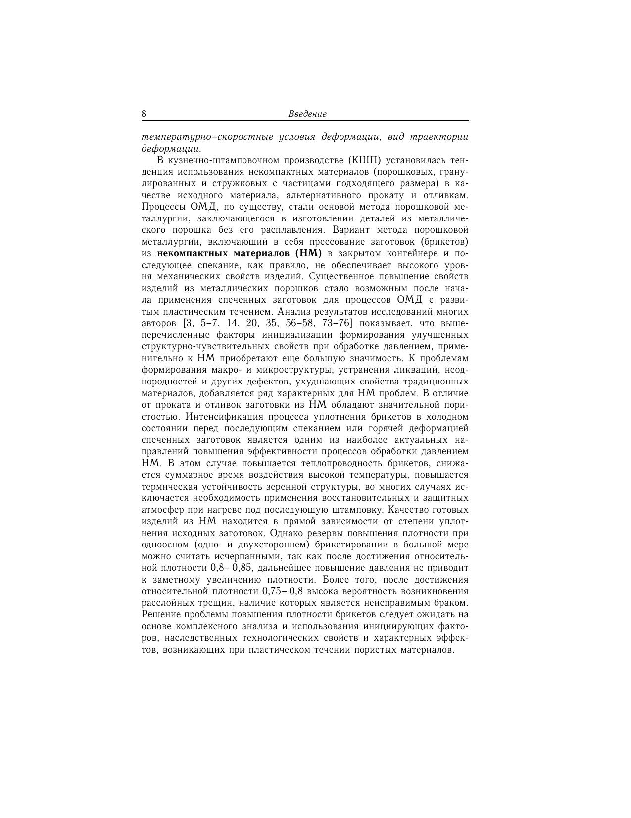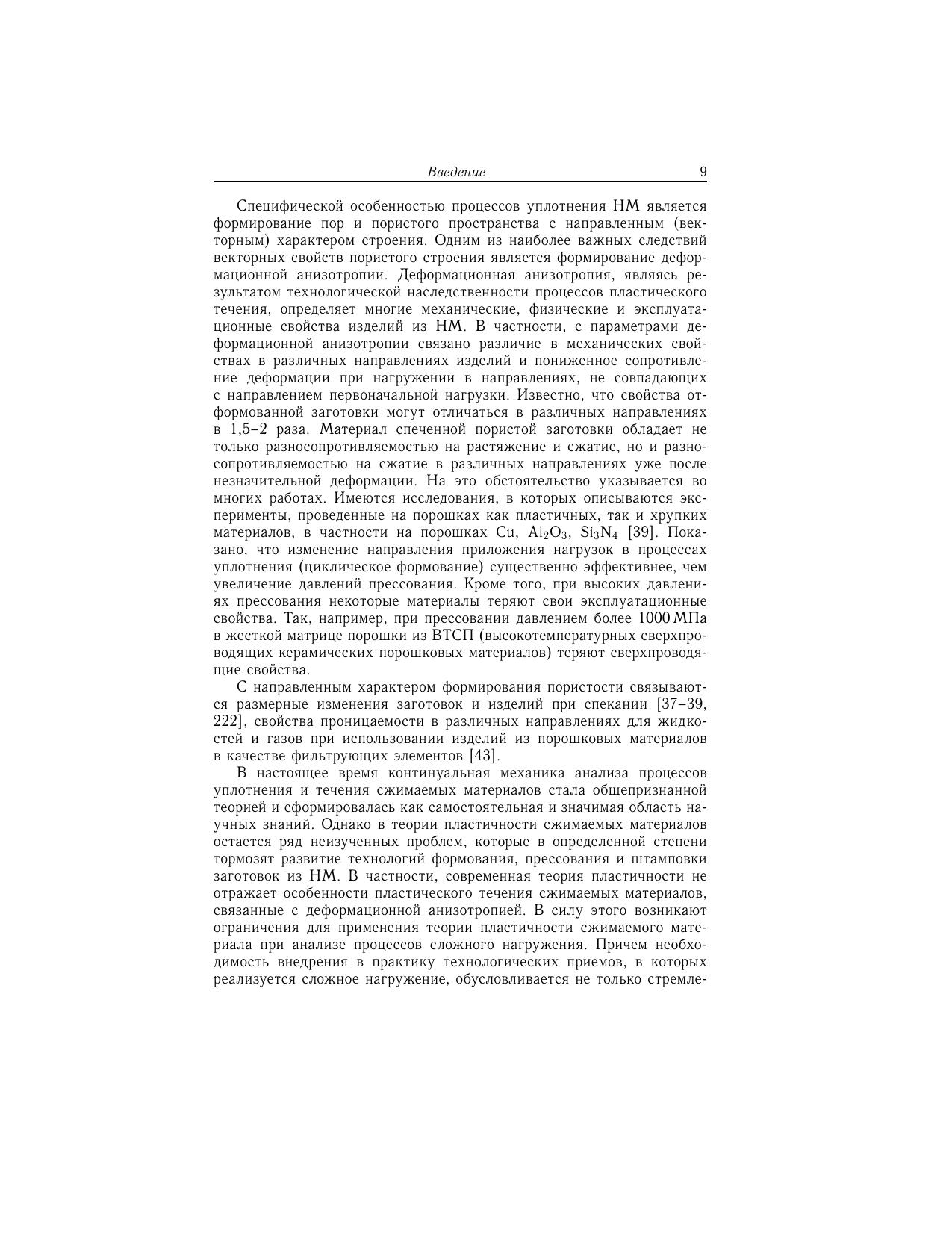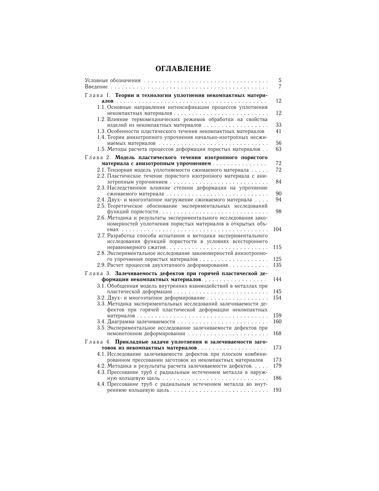 Изложены модели уплотнения, консолидации и разрушения при деформации пористых спеченных материалов. На основе тензорных представлений об уплотнении создана теория технологической наследственности, связанной с формированием деформационной анизотропии при обработке материалов с необратимой сжимаемостью. Рассмотрены экспериментальные методы определения материальных функций, описывающих реологические свойства пористых материалов. Приведены примеры расчета уплотняемости пористых материалов при деформировании по двухзвенным траекториям деформации, содержащего два этапа простого нагружения. На основе феноменологического подхода созданы теоретические положения консолидации некомпактных материалов и приведены результаты экспериментальных исследований прессования профилей и трубных изделий из стружковых заготовок. Книга предназначена специалистам в области обработки металлов давлением, может быть полезна аспирантам и студентам, обучающимся по направлению "Машиностроительные технологии и оборудование" по специальности "Машины и технология обработки металлов давлением".