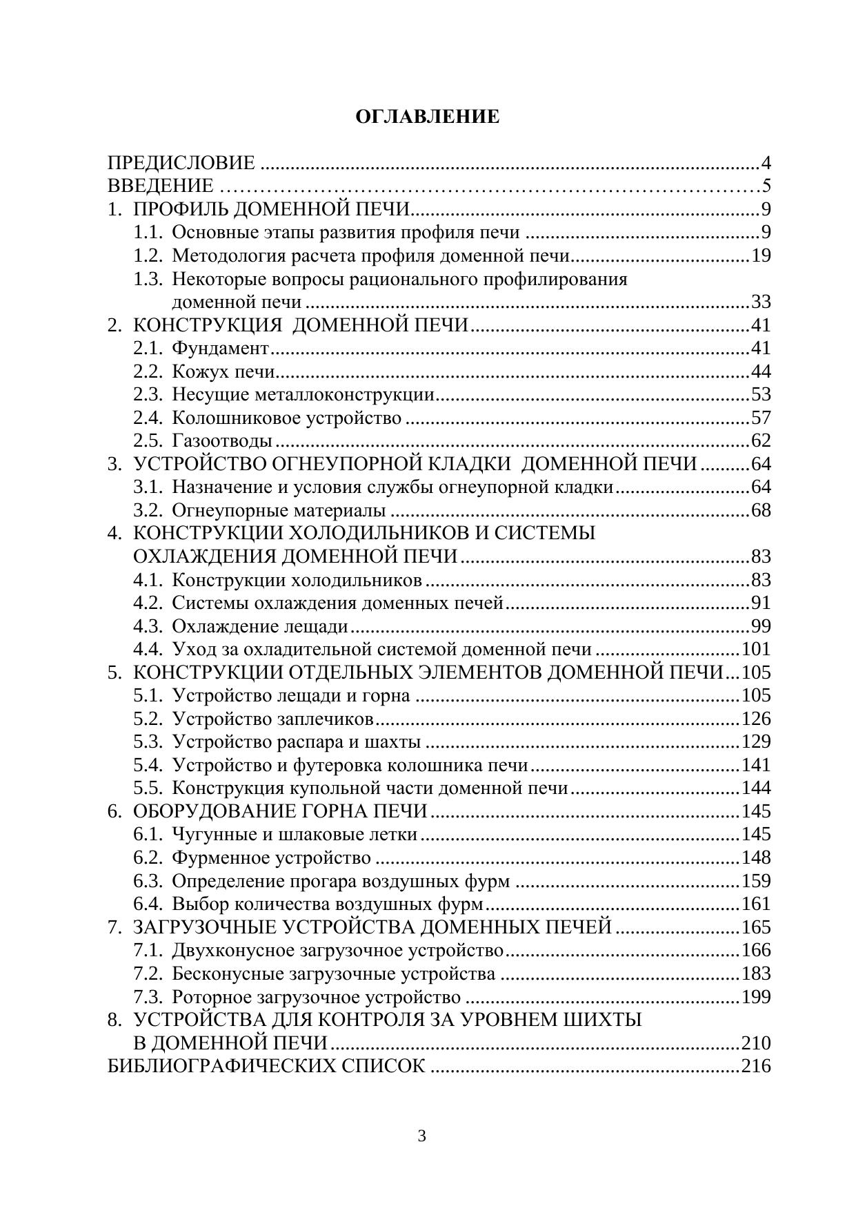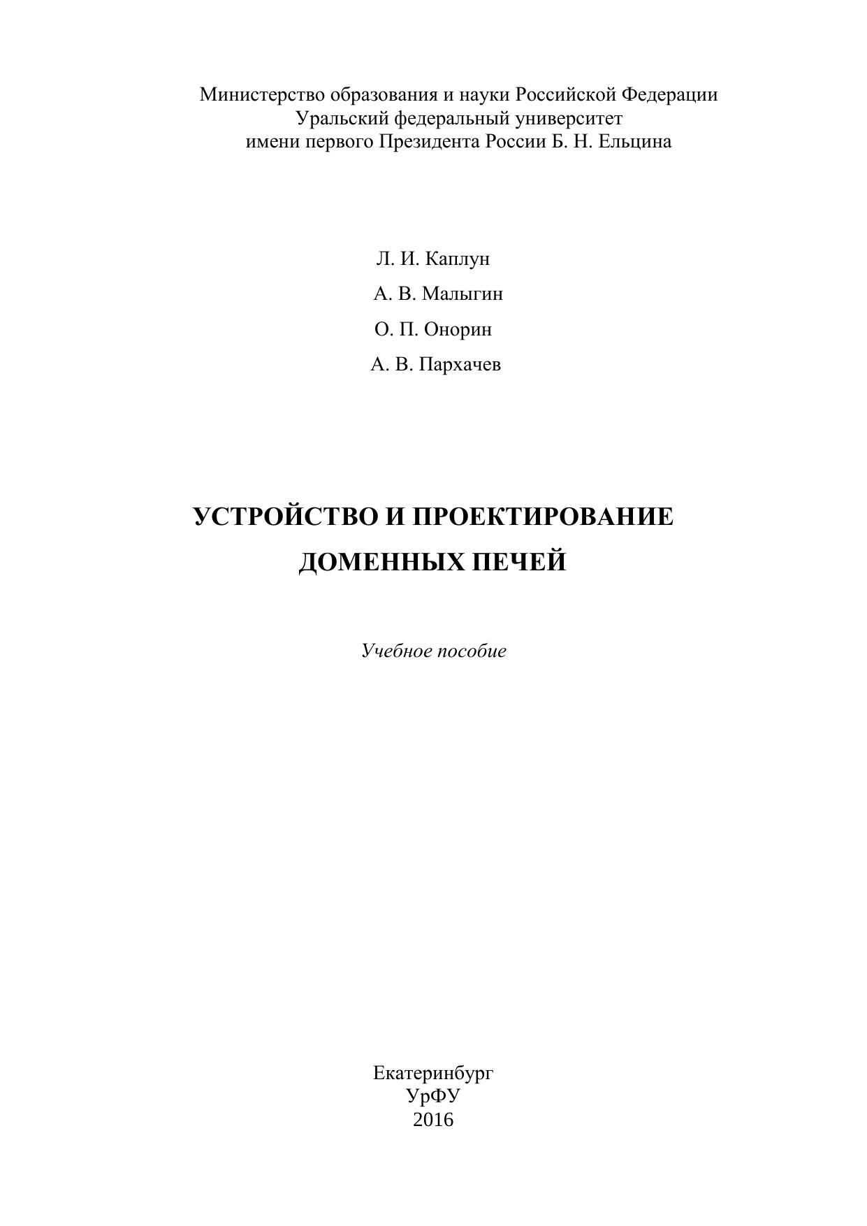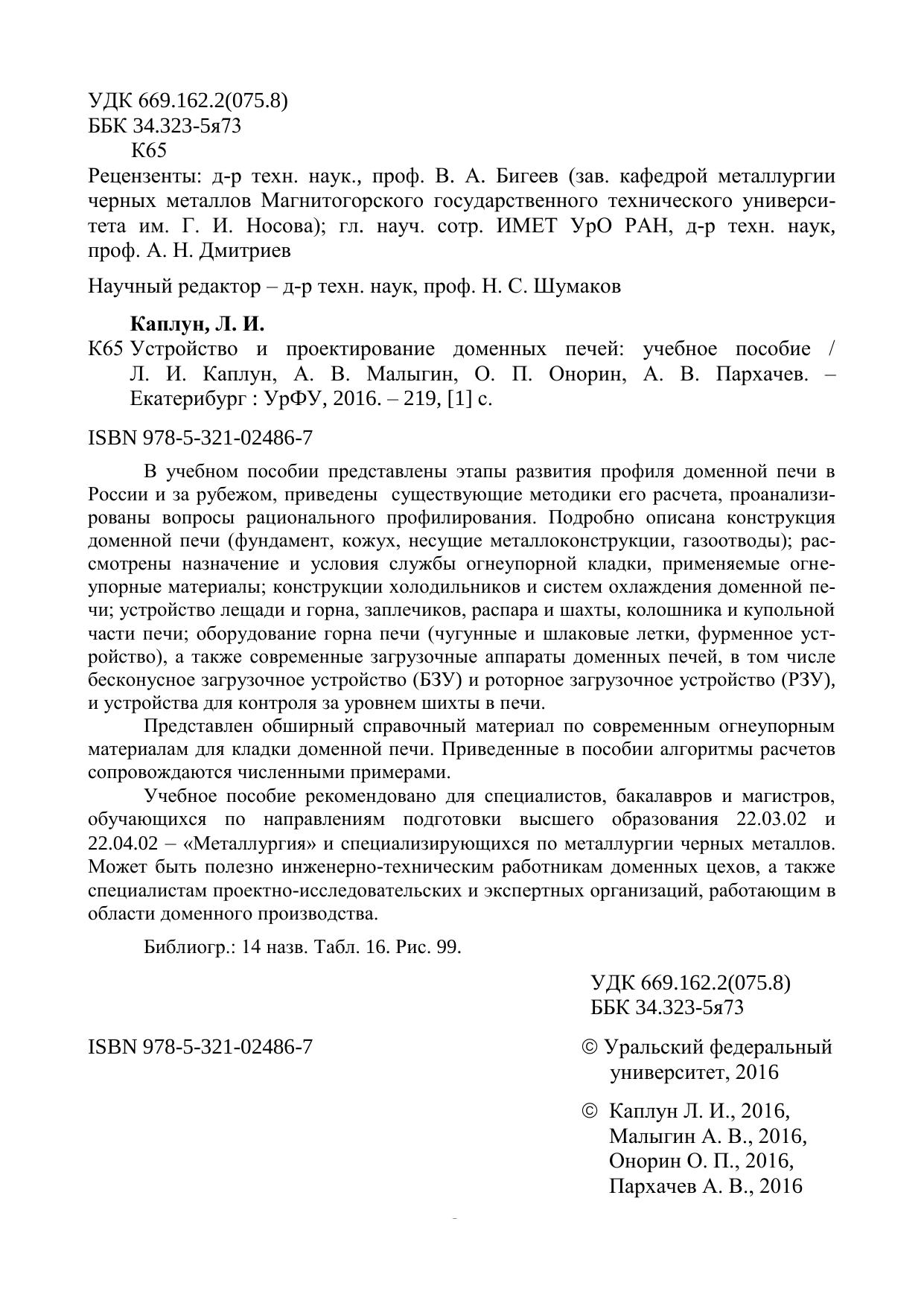 В учебном пособии представлены этапы развития профиля доменной печи в России и за рубежом, приведены существующие методики его расчета, проанализированы вопросы рационального профилирования. Подробно описана конструкция доменной печи (фундамент, кожух, несущие металлоконструкции, газоотводы); рассмотрены назначение и условия службы огнеупорной кладки, применяемые огнеупорные материалы; конструкции холодильников и систем охлаждения доменной печи; устройство лещади и горна, заплечиков, распара и шахты, колошника и купольной части печи; оборудование горна печи (чугунные и шлаковые летки, фурменное устройство), а также современные загрузочные аппараты доменных печей, в том числе бесконусное загрузочное устройство (БЗУ) и роторное загрузочное устройство (РЗУ), и устройства для контроля за уровнем шихты в печи. Представлен обширный справочный материал по современным огнеупорным материалам для кладки доменной печи. Приведенные в пособии алгоритмы расчетов сопровождаются численными примерами. Учебное пособие рекомендовано для специалистов, бакалавров и магистров, обучающихся по направлениям подготовки высшего образования 22.03.02 и 22.04.02 – «Металлургия» и специализирующихся по металлургии черных металлов. Может быть полезно инженерно-техническим работникам доменных цехов, а также специалистам проектно-исследовательских и экспертных организаций, работающим в области доменного производства.