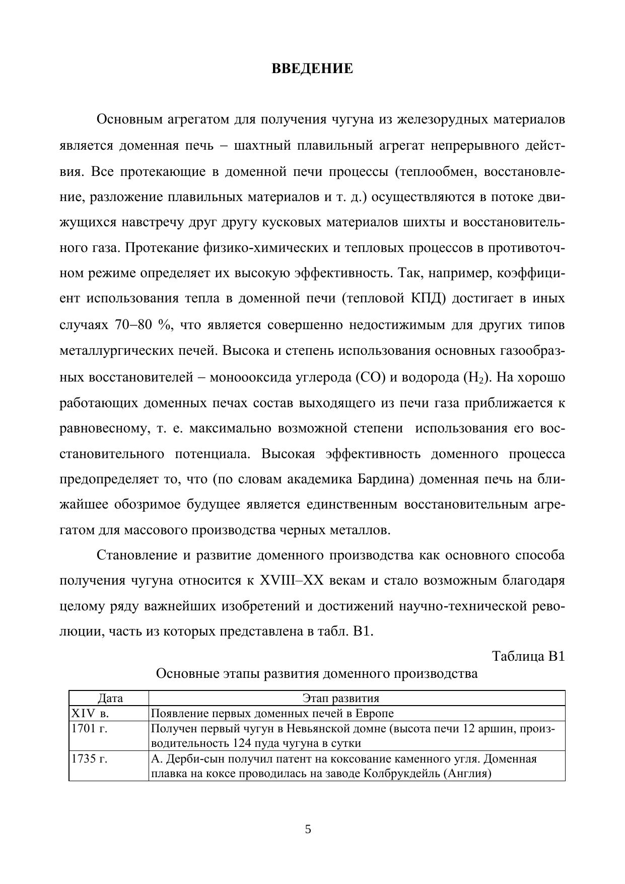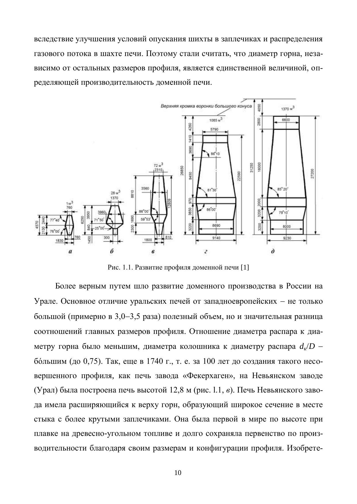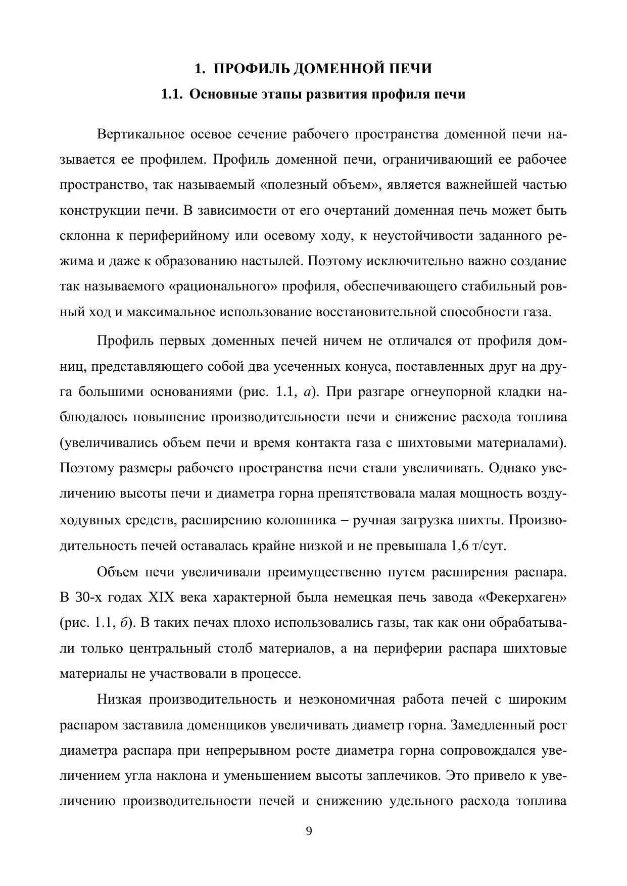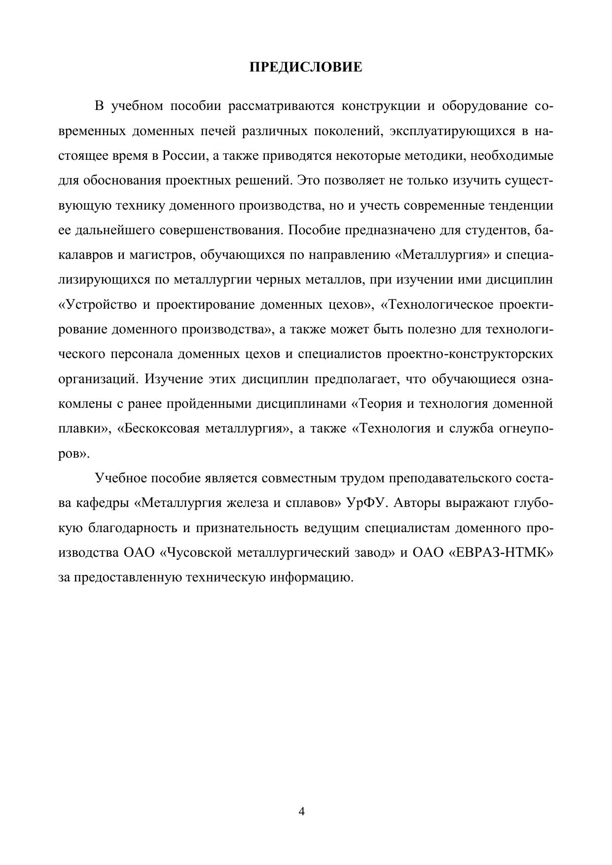 В учебном пособии представлены этапы развития профиля доменной печи в России и за рубежом, приведены существующие методики его расчета, проанализированы вопросы рационального профилирования. Подробно описана конструкция доменной печи (фундамент, кожух, несущие металлоконструкции, газоотводы); рассмотрены назначение и условия службы огнеупорной кладки, применяемые огнеупорные материалы; конструкции холодильников и систем охлаждения доменной печи; устройство лещади и горна, заплечиков, распара и шахты, колошника и купольной части печи; оборудование горна печи (чугунные и шлаковые летки, фурменное устройство), а также современные загрузочные аппараты доменных печей, в том числе бесконусное загрузочное устройство (БЗУ) и роторное загрузочное устройство (РЗУ), и устройства для контроля за уровнем шихты в печи. Представлен обширный справочный материал по современным огнеупорным материалам для кладки доменной печи. Приведенные в пособии алгоритмы расчетов сопровождаются численными примерами. Учебное пособие рекомендовано для специалистов, бакалавров и магистров, обучающихся по направлениям подготовки высшего образования 22.03.02 и 22.04.02 – «Металлургия» и специализирующихся по металлургии черных металлов. Может быть полезно инженерно-техническим работникам доменных цехов, а также специалистам проектно-исследовательских и экспертных организаций, работающим в области доменного производства.