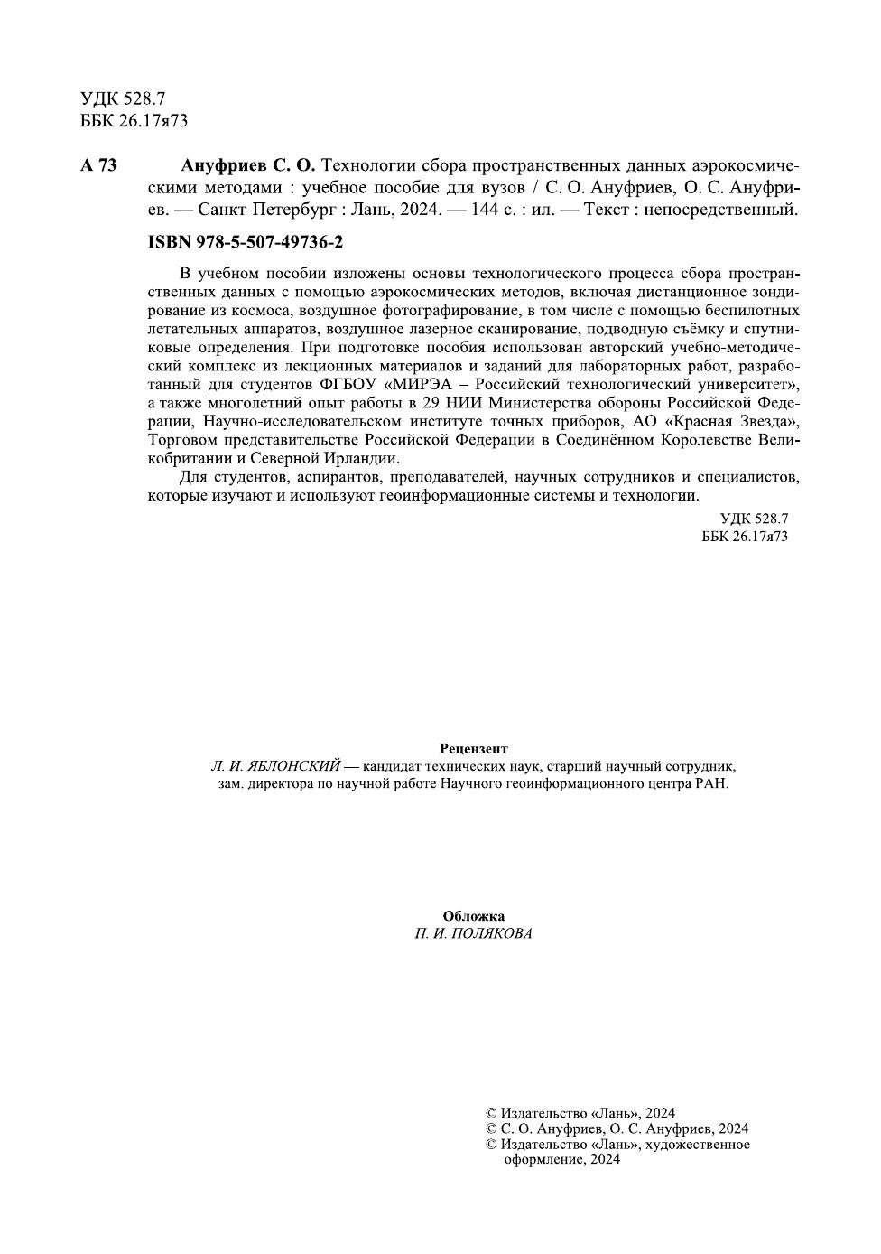 В учебном пособии изложены основы технологического процесса сбора пространственных данных с помощью аэрокосмических методов, включая дистанционное зондирование из космоса, воздушное фотографирование, в том числе с помощью беспилотных летательных аппаратов, воздушное лазерное сканирование, подводную съёмку и спутниковые определения. При подготовке пособия использован авторский учебно-методический комплекс из лекционных материалов и заданий для лабораторных работ, разработанный для студентов ФГБОУ «МИРЭА — Российский технологический университет», а также многолетний опыт работы в 29 НИИ Министерства обороны Российской Федерации, Научно-исследовательском институте точных приборов, АО «Красная Звезда», Торговом предста-вительстве Российской Федерации в Соединённом Королевстве Великобритании и Север-ной Ирландии. Для студентов, аспирантов, преподавателей, научных сотрудников и специалистов, которые изучают и используют геоинформационные системы и технологии.