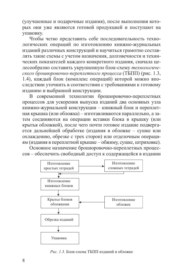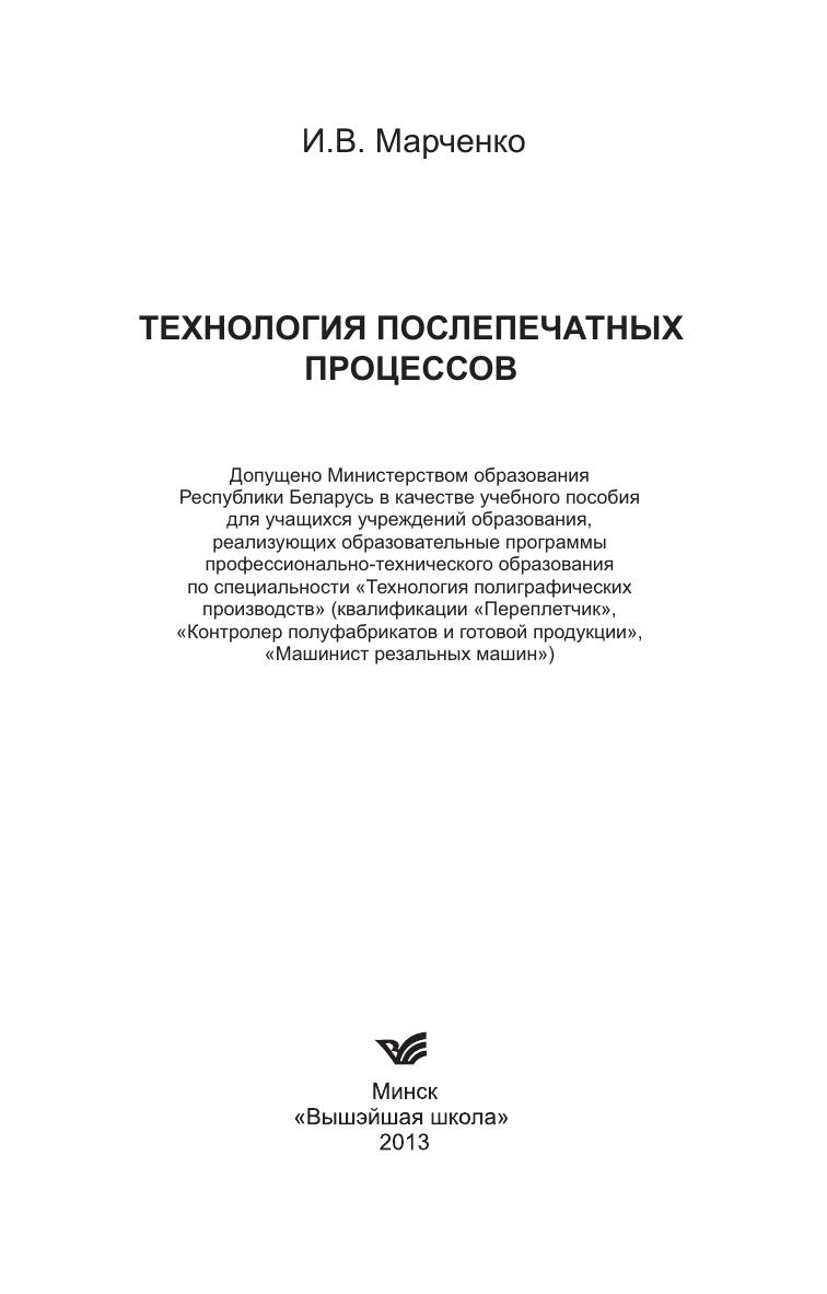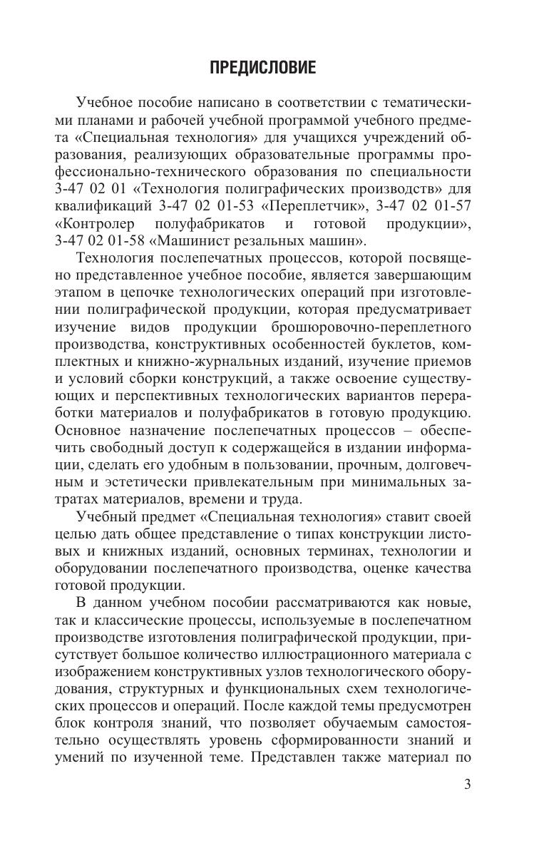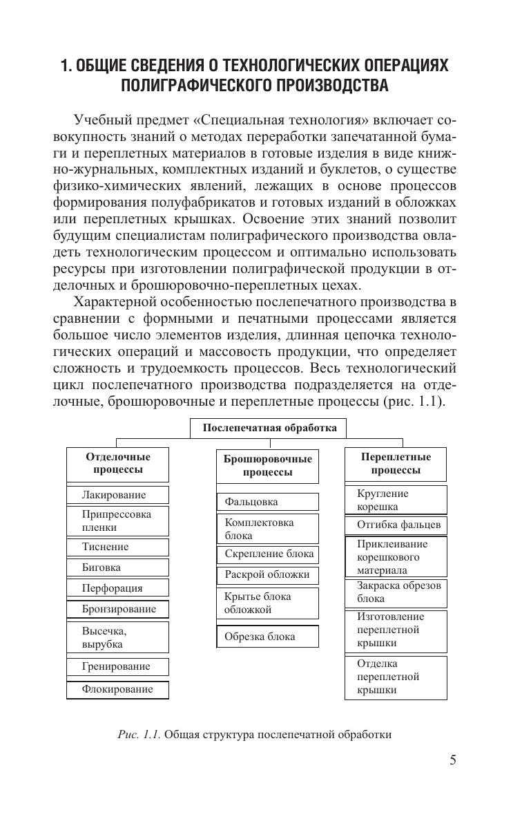 Приведены общие сведения о послепечатном производстве. Освещены вопросы отделочных, брошюровочных и переплетных процессов. Рассмотрены технологические операции по изготовлению изданий в обложке и переплетной крышке, материалы и оборудование, используемые при выполнении брошюровочно-переплетных работ. Предусматривает закрепление теоретических знаний по основным темам учебного предмета "Специальная технология", входящим в состав специальности "Технология полиграфических производств". Для учащихся ПТО по специальности "Технология полиграфических производств" (квалификации "Переплетчик", "Контролер полуфабрикатов и готовой продукции", "Машинист резальных машин"). Может быть полезно учащимся ССУЗов и студентов вузов по направлению образо