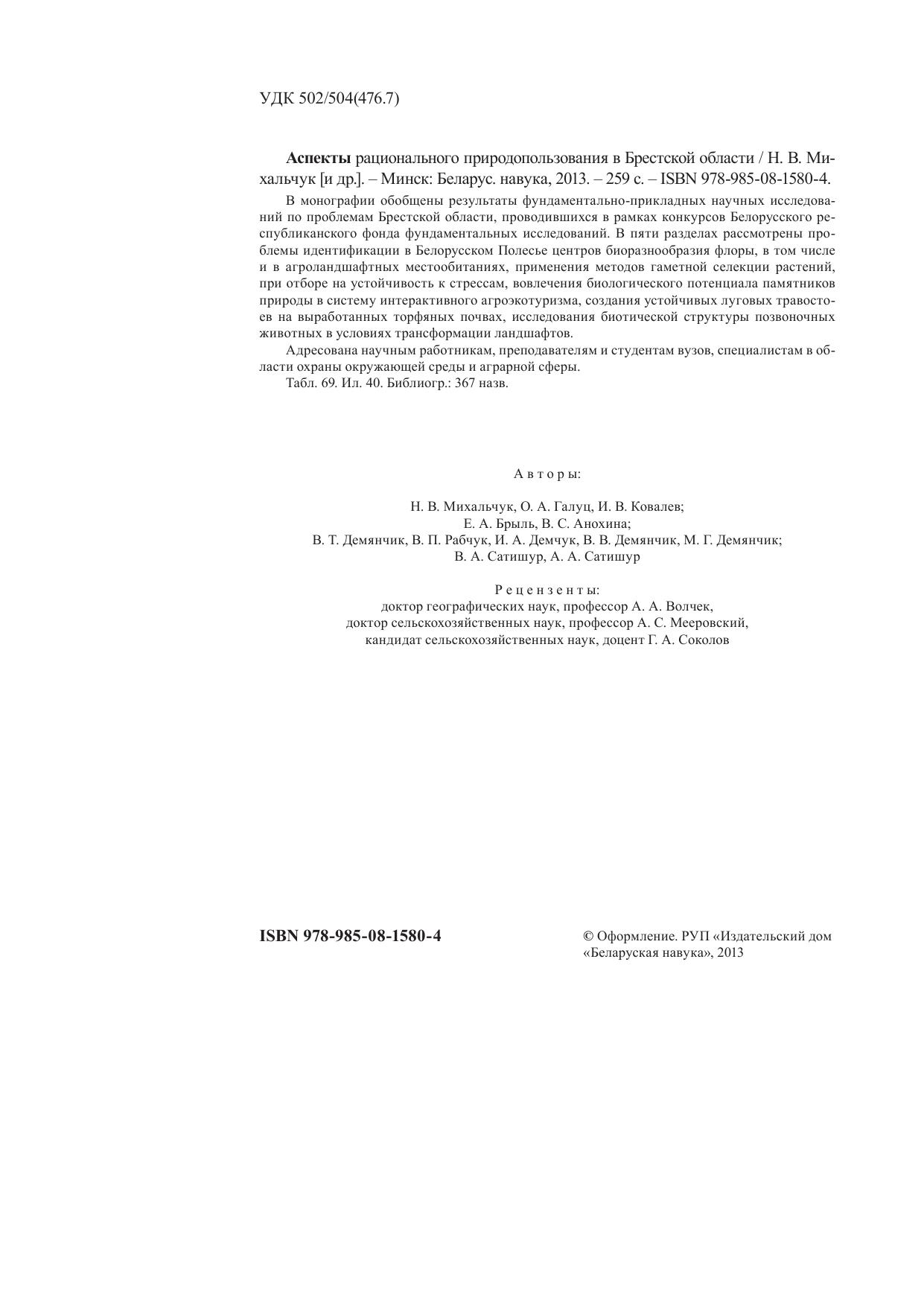 В монографии обобщены результаты фундаментальноприкладных научных исследований по проблемам Брестской области, проводившихся в рамках конкурсов Белорусского республиканского фонда фундаментальных исследований. В пяти разделах рассмотрены проблемы идентификации в Белорусском Полесье центров биоразнообразия флоры, в том числе и в агроландшафтных местообитаниях, применения методов гаметной селекции растений, при отборе на устойчивость к стрессам, вовлечения биологического потенциала памятников природы в систему интерактивного агроэкотуризма, создания устойчивых луговых травостоев на выработанных торфяных почвах, исследования биотической структуры позвоночных животных в условиях трансформации ландшафтов. Адресована научным работникам, преподавателям и студентам вузов, специалистам в области охраны окружающей среды и аграрной сферы.