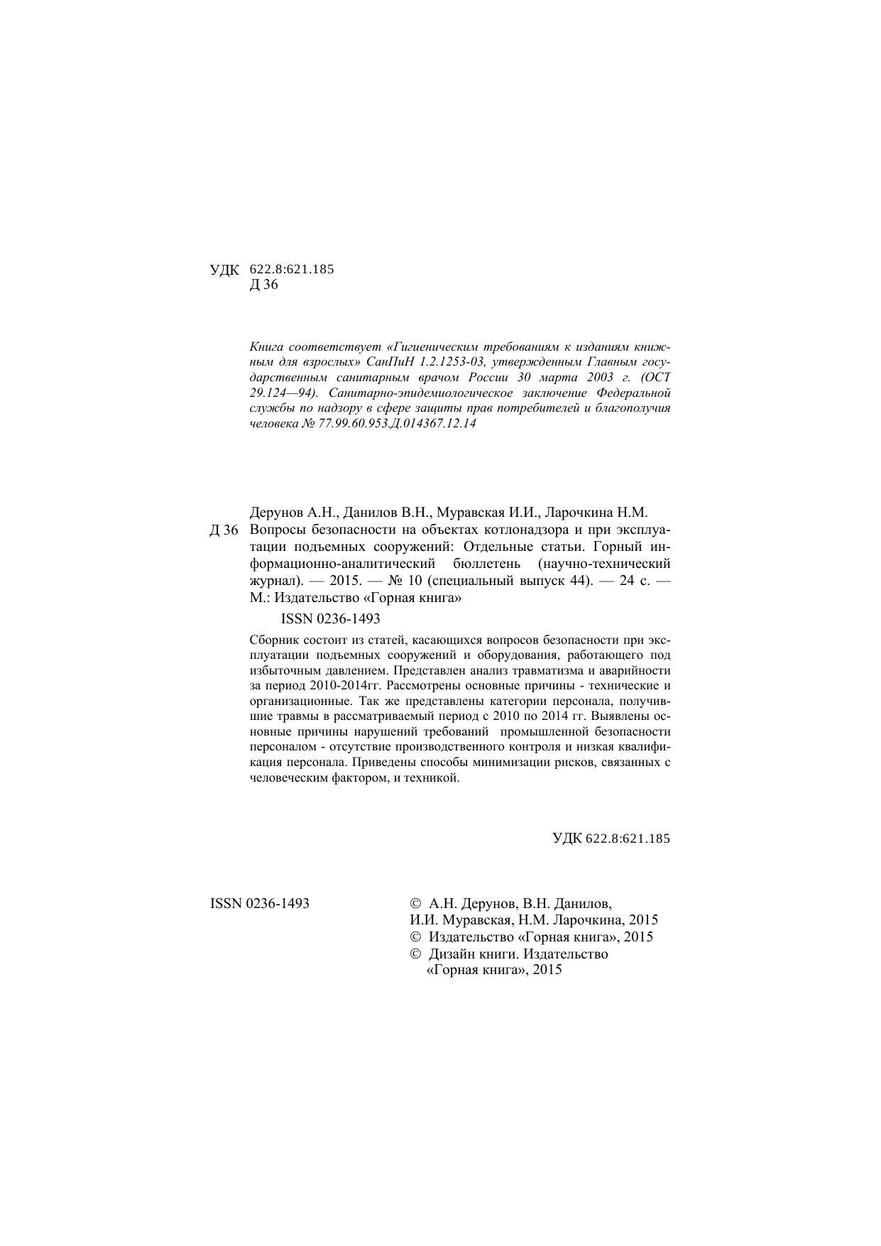 Сборник состоит из статей, касающихся вопросов безопасности при эксплуатации подъемных сооружений и оборудования, работающего под избыточным давлением. Представлен анализ травматизма и аварийности за период 2010-2014гг. Рассмотрены основные причины - технические и организационные. Так же представлены категории персонала, получившие травмы в рассматриваемый период с 2010 по 2014 гг. Выявлены основные причины нарушений требований промышленной безопасности