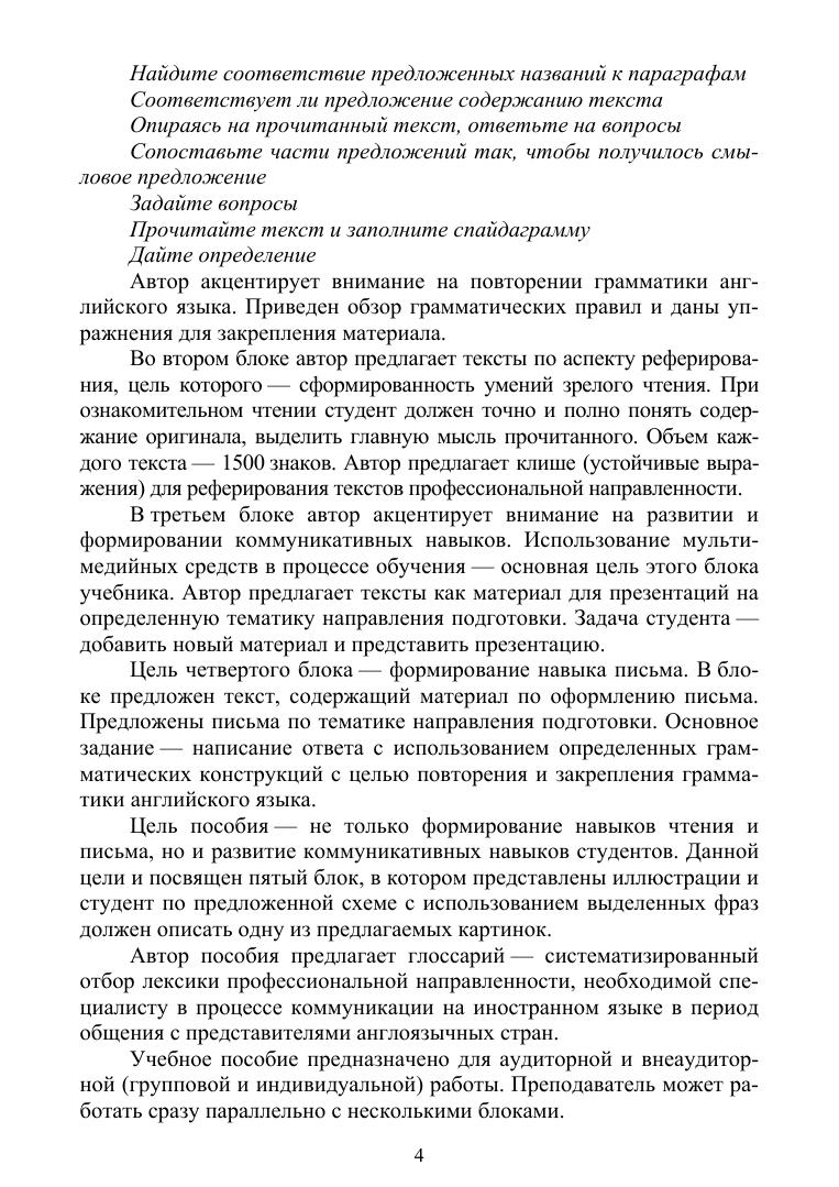 В пособии предлагаются различные виды творческих, коммуникативных заданий, направленных на формирование профессионально-ориентированной коммуникативной компетенции обучающихся в сфере будущей профессиональной деятельности, которые знакомят их с различными аспектами в международном профессиональном сообществе.