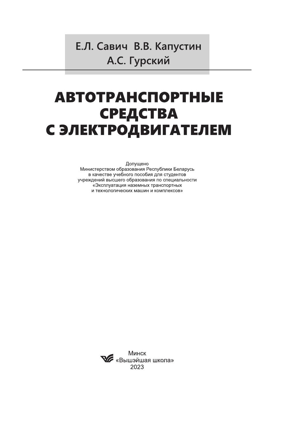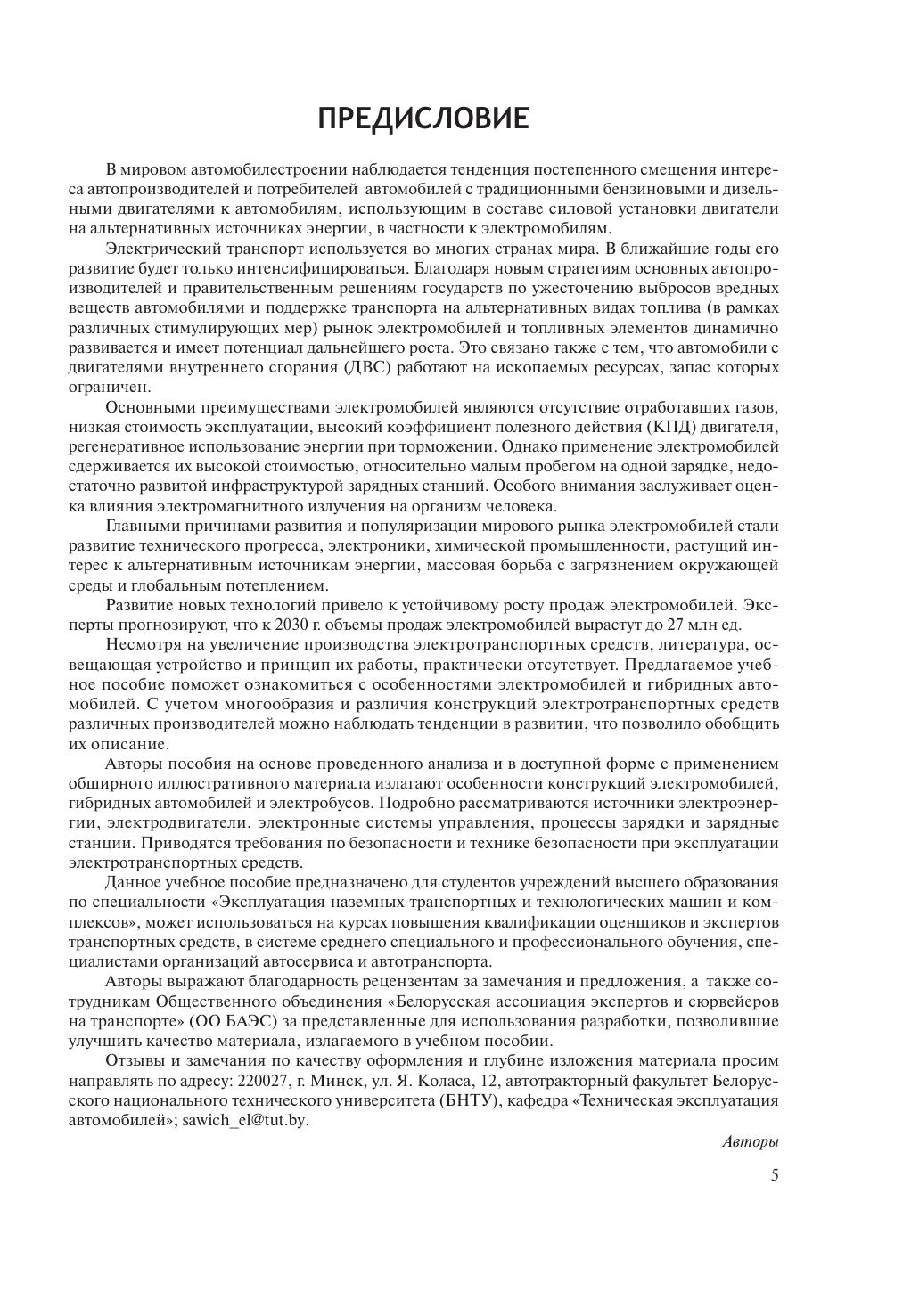 Приведены история развития и особенности конструкций электромобилей, гибридных автомобилей и электробусов различных стран и производителей. Подробно описываются источники электроэнергии – суперконденсаторы, высоковольтные и низковольтные аккумуляторные батареи, электродвигатели, электронные системы управления, процессы зарядки и зарядные станции. Анализируются конструкции кузовов электромобилей и утилизация электротранспортных средств. Изложены требования по безопасности и охране техники безопасности при эксплуатации электротранспортных средств. Для студентов учреждений высшего образования по специальности «Эксплуатация наземных транспортных и технологических машин и комплексов». Может быть полезно слушателям курсов повышения квалификации оценщиков и экспертов транспортных средств, а также учащимся в системе среднего специального и профессионального обучения по техническому обслуживанию и ремонту транспортных средств, специалистам организаций автосервиса.