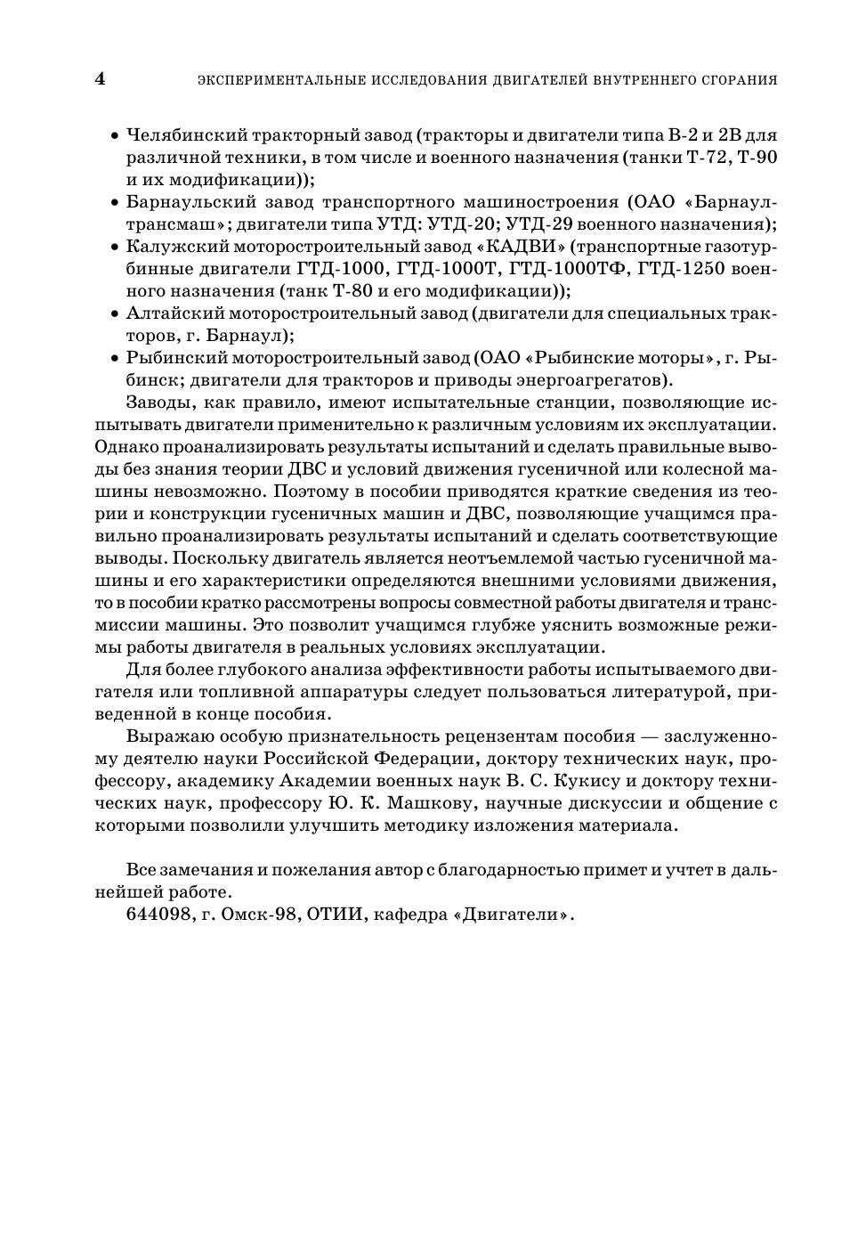 В пособии отражены вопросы теории ДВС, организации и проведения измерительного эксперимента и обработки экспериментальных данных. Раскрываются принципы измерения физических величин. Даны описания стендов для испытания двигателей внутреннего сгорания и применяемой измерительной техники. Подробно рассмотрены вопросы испытания современных транспортных газотурбинных двигателей, применяемых в специальной военной и гражданской технике, и их характеристики. Приведены некоторые направления совершенствования быстроходных транспортных ДВС и показано их влияние на тяговые свойства гусеничных машин. Учебное пособие предназначено для студентов (курсантов) вузов, изучающих курсы «Теория двигателей», «Конструкция силовых установок многоцелевых гусеничных и колесных машин» и «Испытания многоцелевых гусеничных и колесных машин», и может использоваться преподавательским составом и аспирантами вузов, а также сотрудниками соответствующих конструкторских бюро в качестве справочного пособия. Будет полезным также при изучении вопросов теории движения гусеничных и колесных машин.