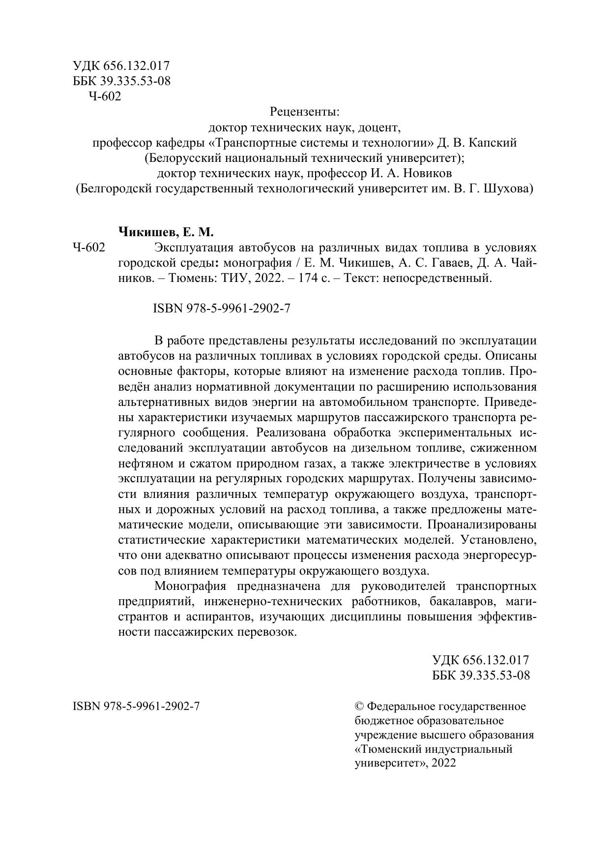 В работе представлены результаты исследований по эксплуатации автобусов на различных топливах в условиях городской среды. Описаны основные факторы, которые влияют на изменение расхода топлив. Проведён анализ нормативной документации по расширению использования альтернативных видов энергии на автомобильном транспорте. Приведены характеристики изучаемых маршрутов пассажирского транспорта регулярного сообщения. Реализована обработка экспериментальных исследований эксплуатации автобусов на дизельном топливе, сжиженном нефтяном и сжатом природном газах, а также электричестве в условиях эксплуатации на регулярных городских маршрутах. Получены зависимости влияния различных температур окружающего воздуха, транспортных и дорожных условий на расход топлива, а также предложены математические модели, описывающие эти зависимости. Проанализированы статистические характеристики математических моделей. Установлено, что они адекватно описывают процессы изменения расхода энергоресурсов под влиянием температуры окружающего воздуха. Монография предназначена для руководителей транспортных предприятий, инженерно-технических работников, бакалавров, магистрантов и аспирантов, изучающих дисциплины повышения эффективности пассажирских перевозок.