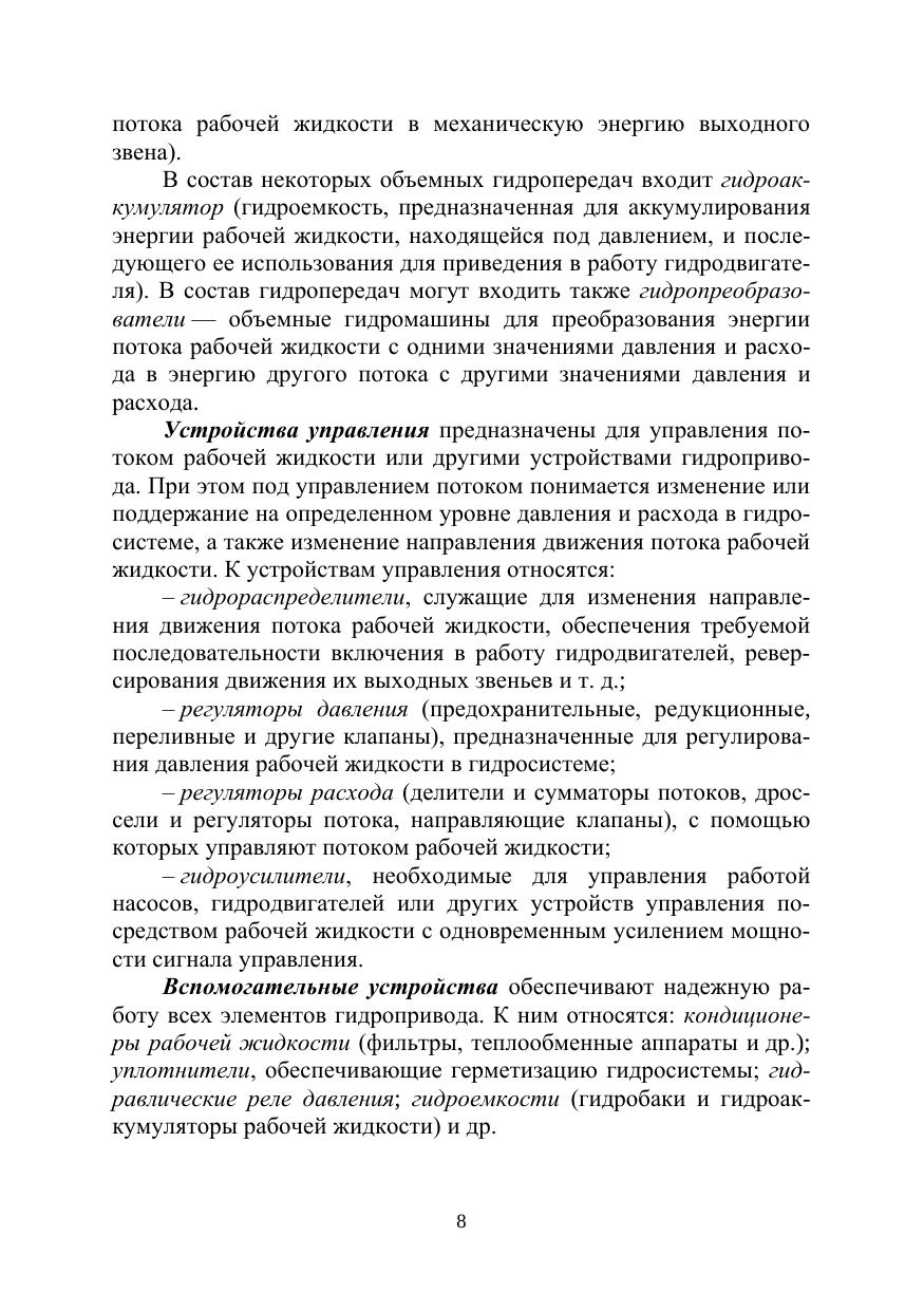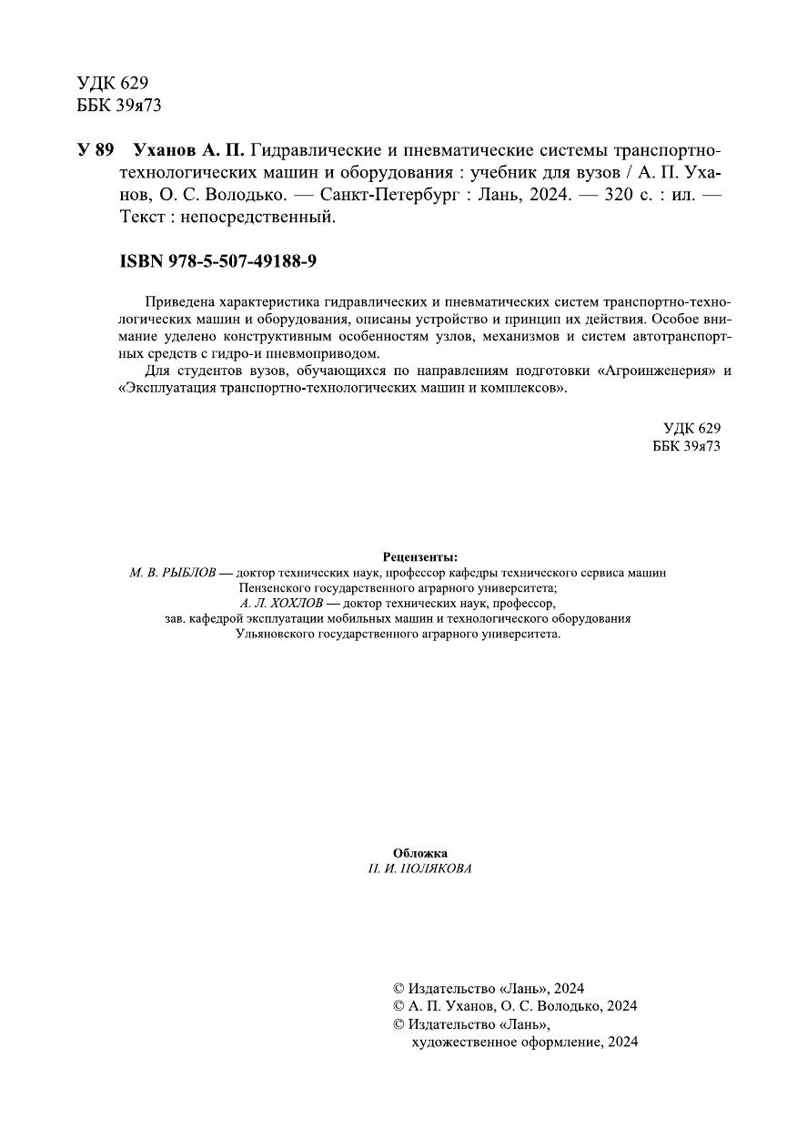 Приведена характеристика гидравлических и пневматических систем транспортно-технологических машин и оборудования, описаны устройство и принцип их действия. Особое внимание уделено конструктивным особенностям узлов, механизмов и систем автотранспорт-ных средств с гидро- и пневмоприводом. Для студентов вузов, обучающихся по направлениям подготовки «Агроинженерия» и «Эксплуатация транспортно-технологических машин и комплексов».