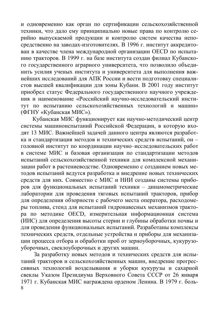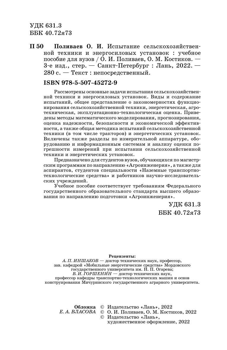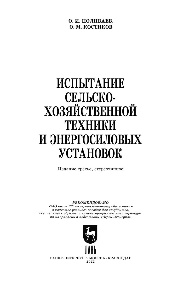 Рассмотрены основные задачи испытания сельскохозяйственной техники и энергосиловых установок. Виды и содержание испытаний, общее представление о закономерностях функционирования сельскохозяйственной техники, энергетическая, агротехническая, эксплуатационно-технологическая оценка. Приведены методы математического моделирования, прогнозирования, оценка надежности, безопасности и экономической эффективности, а также общая методика испытаний сельскохозяйственной техники (в том числе тракторов) и энергетических установок. Включены также разделы по измерительной аппаратуре, оборудованию и информационным системам и анализу оценки погрешности измерений при испытании сельскохозяйственной техники и энергетических установок.
