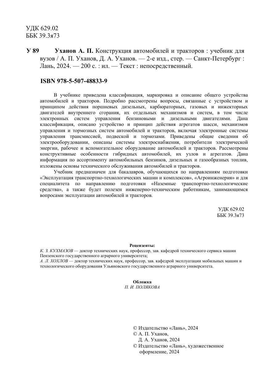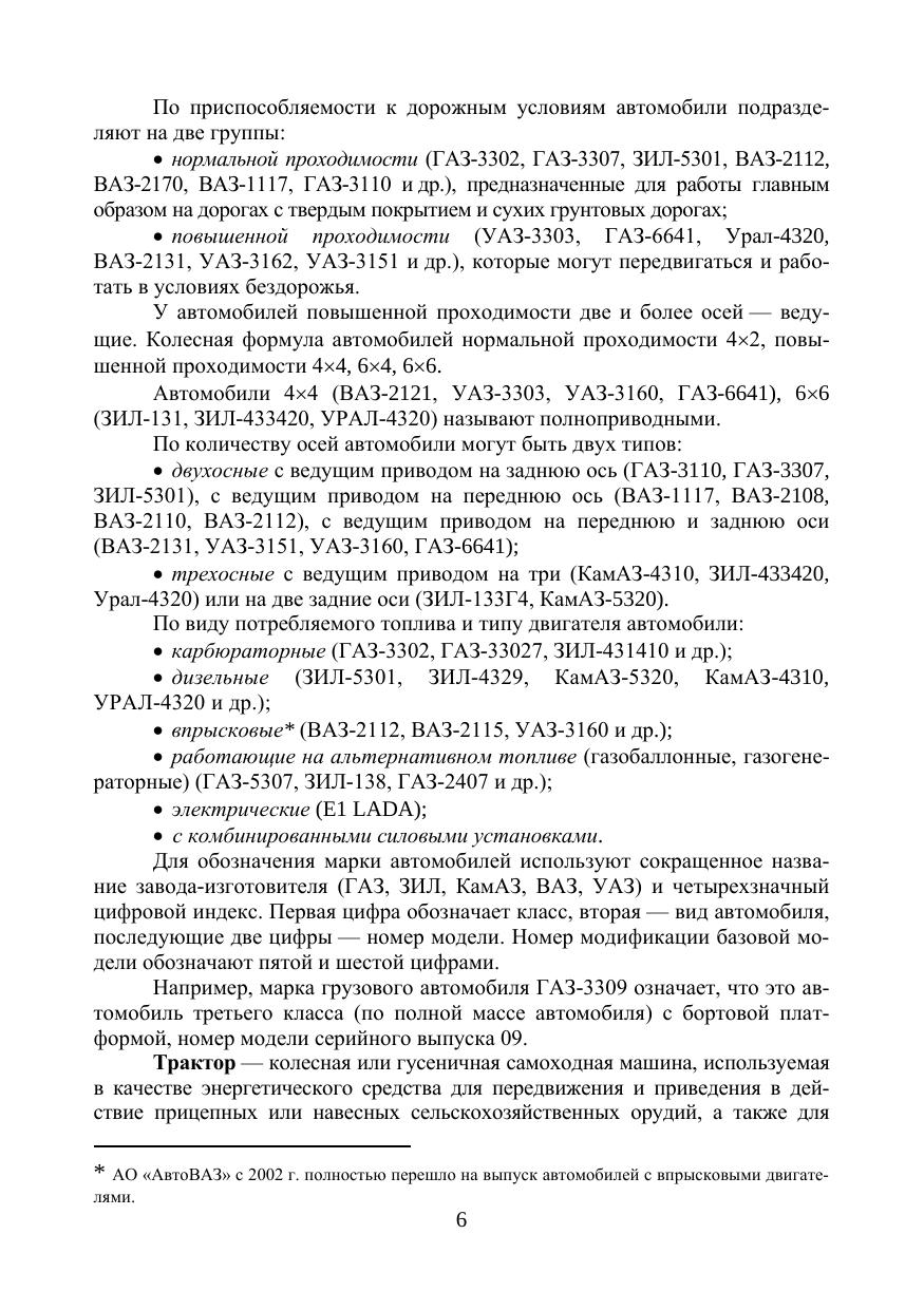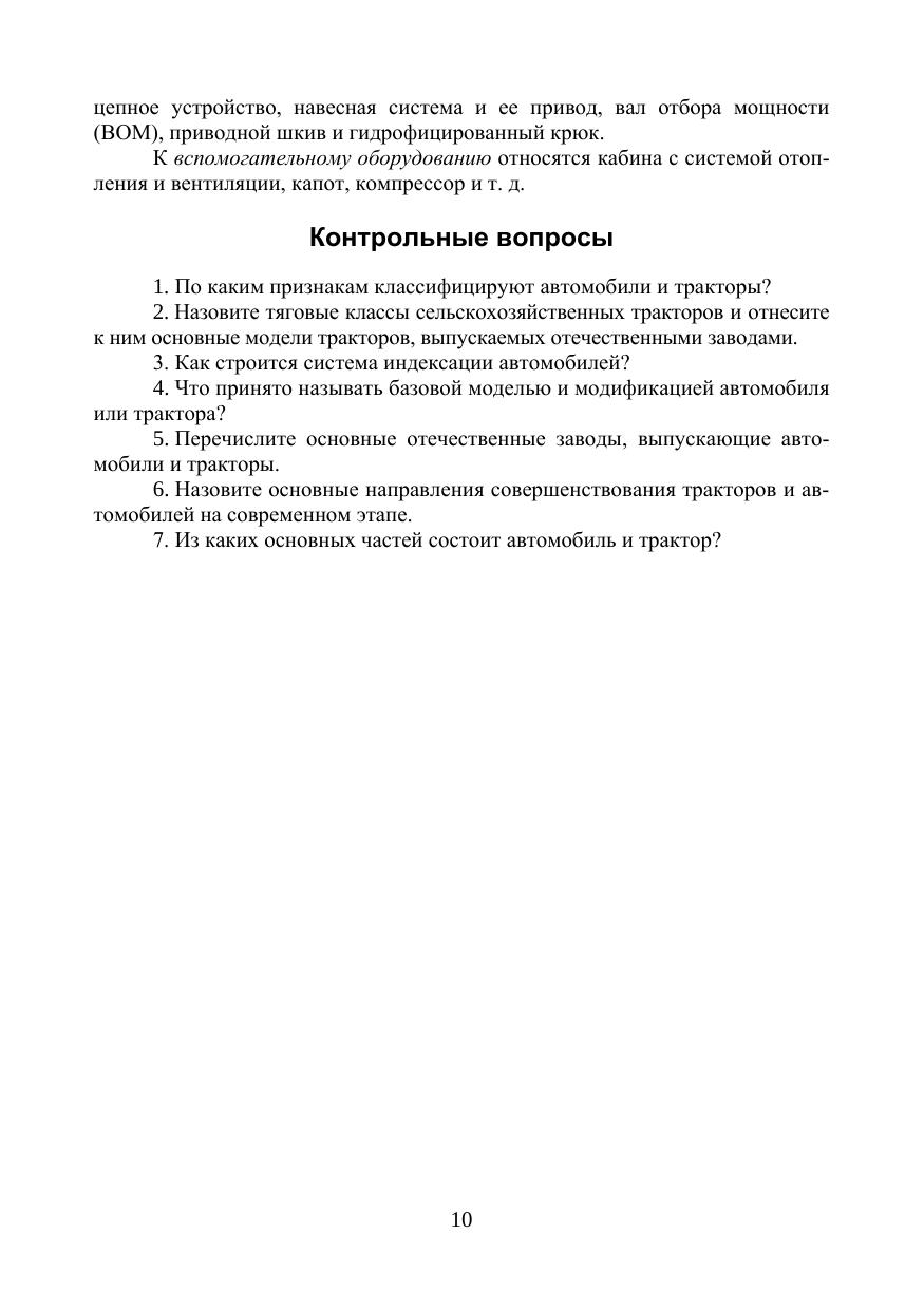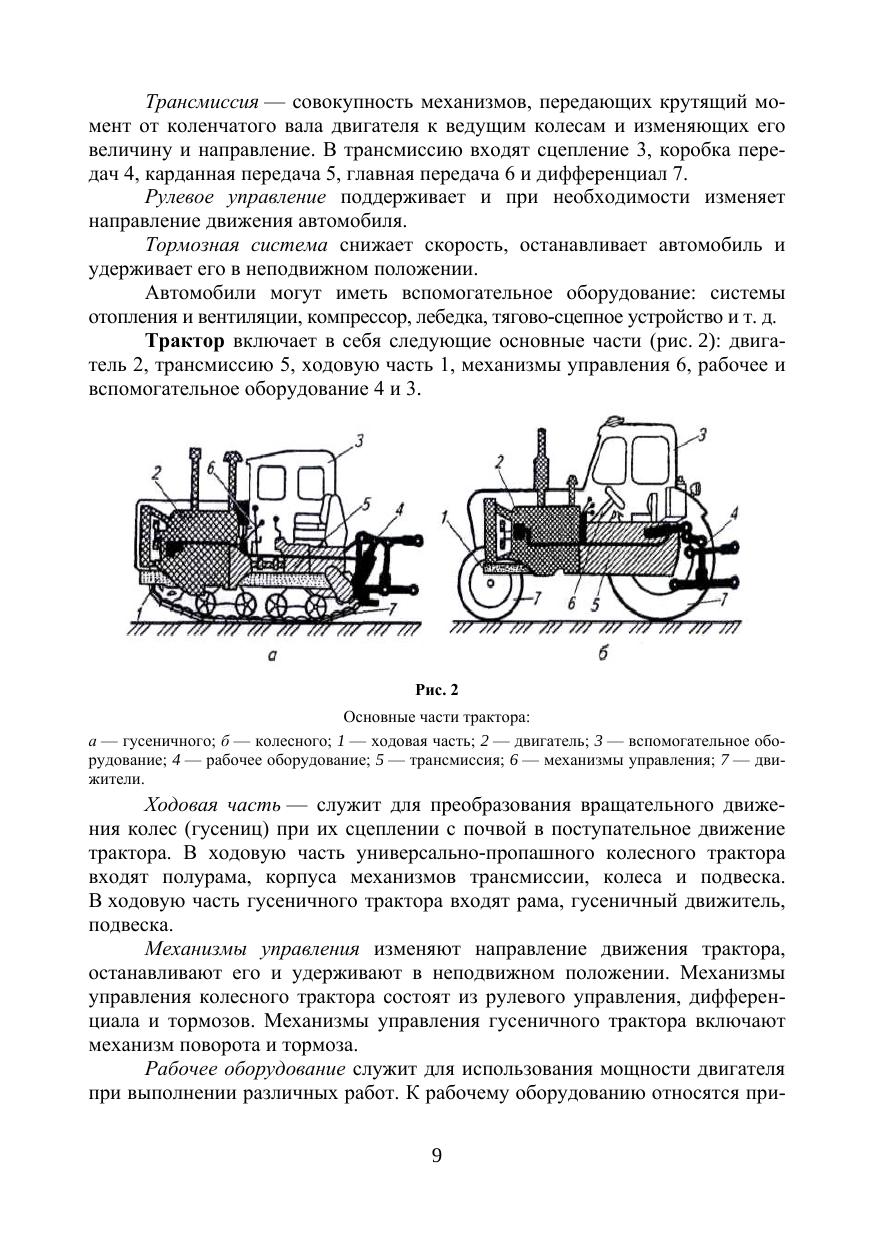 В учебнике приведена классификация, маркировка и описание общего устройства автомобилей и тракторов. Подробно рассмотрены вопросы, связанные с устройством и принципом действия поршневых дизельных, карбюраторных, газовых и инжекторных двигателей внутреннего сгорания, их отдельных механизмов и систем, в том числе электронных систем управления бензиновыми и дизельными двигателями. Дана классификация, описано устройство и принцип действия агрегатов шасси, механизмов управления и тормозных систем автомобилей и тракторов, включая электронные системы управления трансмиссией, подвеской и тормозами. Приведены общие сведения об электрооборудовании, описаны системы электроснабжения, потребители электрической энергии, рабочее и вспомогательное оборудование автомобилей и тракторов. Рассмотрены конструктивные особенности гибридных автомобилей, их узлов и агрегатов. Дана информация по ассортименту автомобильных бензинов, дизельных и газообразных топлив, изложены основы технического обслуживания автомобилей и тракторов. Учебник предназначен для бакалавров, обучающихся по направлениям подготовки «Эксплуатация транспортно-технологических машин и комплексов», «Агроинженерия» и для специалитета по направлению подготовки «Наземные транспортно-технологические средства», а также будет полезен инженерно-техническим работникам, занимающимся вопросами эксплуатации автомобилей и тракторов.