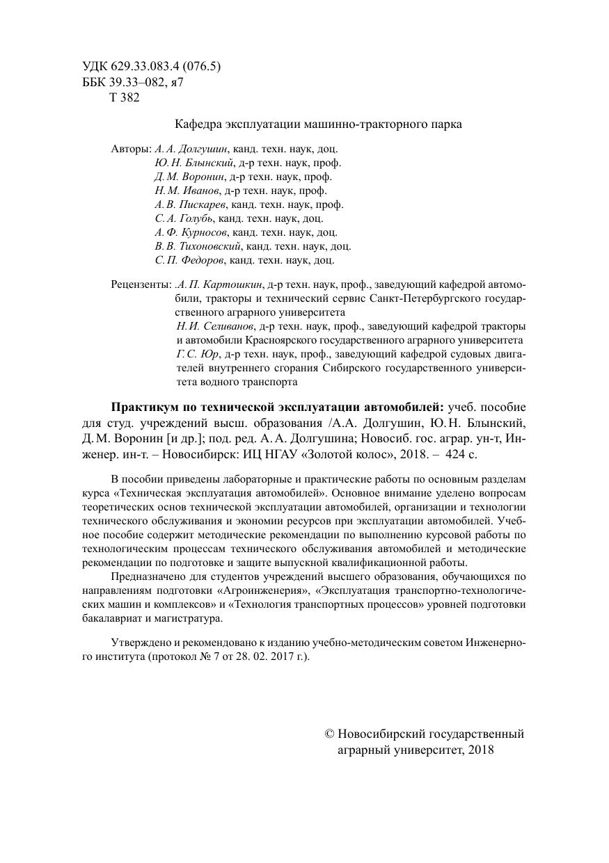 В пособии приведены лабораторные и практические работы по основным разделам курса «Техническая эксплуатация автомобилей». Основное внимание уделено вопросам теоретических основ технической эксплуатации автомобилей, организации и технологии технического обслуживания и экономии ресурсов при эксплуатации автомобилей. Учебное пособие содержит методические рекомендации по выполнению курсовой работы по технологическим процессам технического обслуживания автомобилей и методические рекомендации по подготовке и защите выпускной квалификационной работы. Предназначено для студентов учреждений высшего образования, обучающихся по направлениям подготовки «Агроинженерия», «Эксплуатация транспортно-технологических машин и комплексов» и «Технология транспортных процессов» уровней подготовки бакалавриат и магистратура. Утверждено и рекомендовано к изданию учебно-методическим советом Инженерно- го института (протокол № 7 от 28. 02. 2017 г.).