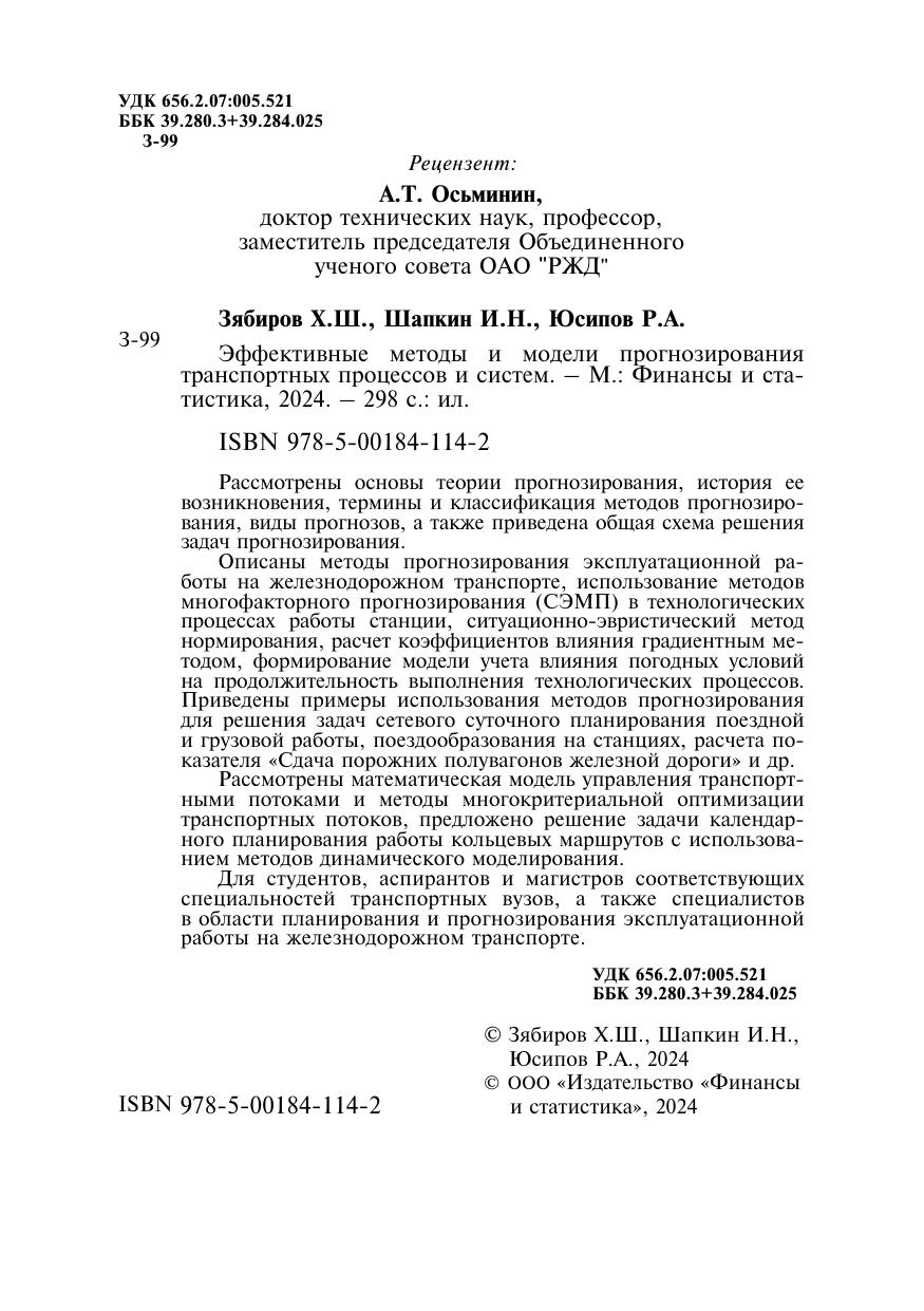 Рассмотрены основы теории прогнозирования, история ее возникновения, термины и классификация методов прогнозирования, виды прогнозов, а также приведена общая схема решения задач прогнозирования. Описаны методы прогнозирования эксплуатационной работы на железнодорожном транспорте, использование методов многофакторного прогнозирования (СЭМП) в технологических процессах работы станции, ситуационно-эвристический метод нормирования, расчет коэффициентов влияния градиентным методом, формирование модели учета влияния погодных условий на продолжительность выполнения технологических процессов. Приведены примеры использования методов прогнозирования для решения задач сетевого суточного планирования поездной и грузовой работы, поездообразования на станциях, расчета показателя «Сдача порожних полувагонов железной дороги» и др. Рассмотрены математическая модель управления транспортными потоками и методы многокритериальной оптимизации транспортных потоков, предложено решение задачи календарного планирования работы кольцевых маршрутов с использованием методов динамического моделирования. Для студентов, аспирантов и магистров соответствующих специальностей транспортных вузов, а также специалистов в области планирования и прогнозирования эксплуатационной работы на железнодорожном транспорте.