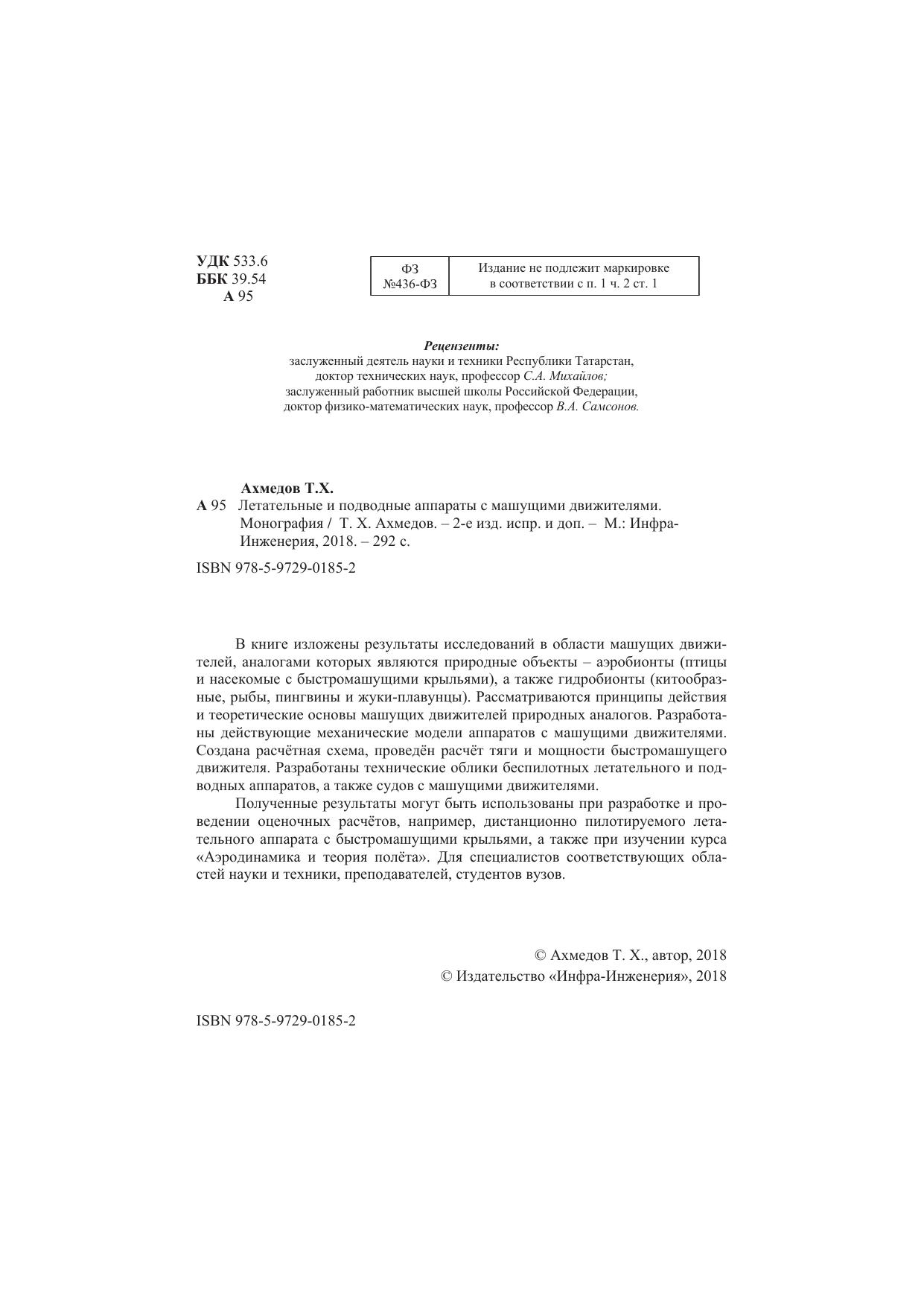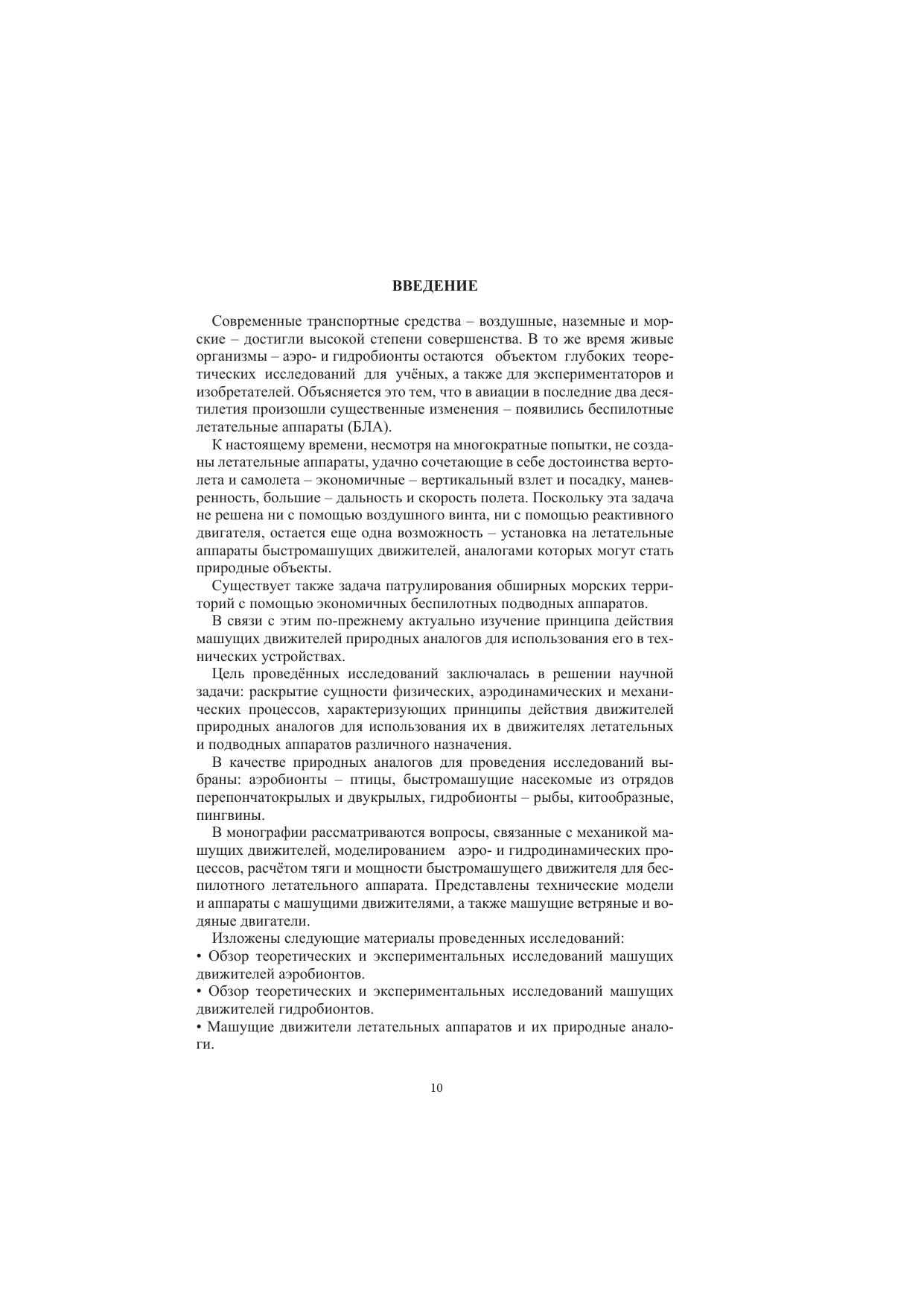 В книге изложены результаты исследований в области машущих движителей, аналогами которых являются природные объекты – аэробионты (птицы и насекомые с быстромашущими крыльями), а также гидробионты (китообразные, рыбы, пингвины и жуки-плавунцы). Рассматриваются принципы действия и теоретические основы машущих движителей природных аналогов. Разработаны действующие механические модели аппаратов с машущими движителями. Создана расчётная схема, проведён расчёт тяги и мощности быстромашущего движителя. Разработаны технические облики беспилотных летательного и подводных аппаратов, а также судов с машущими движителями.