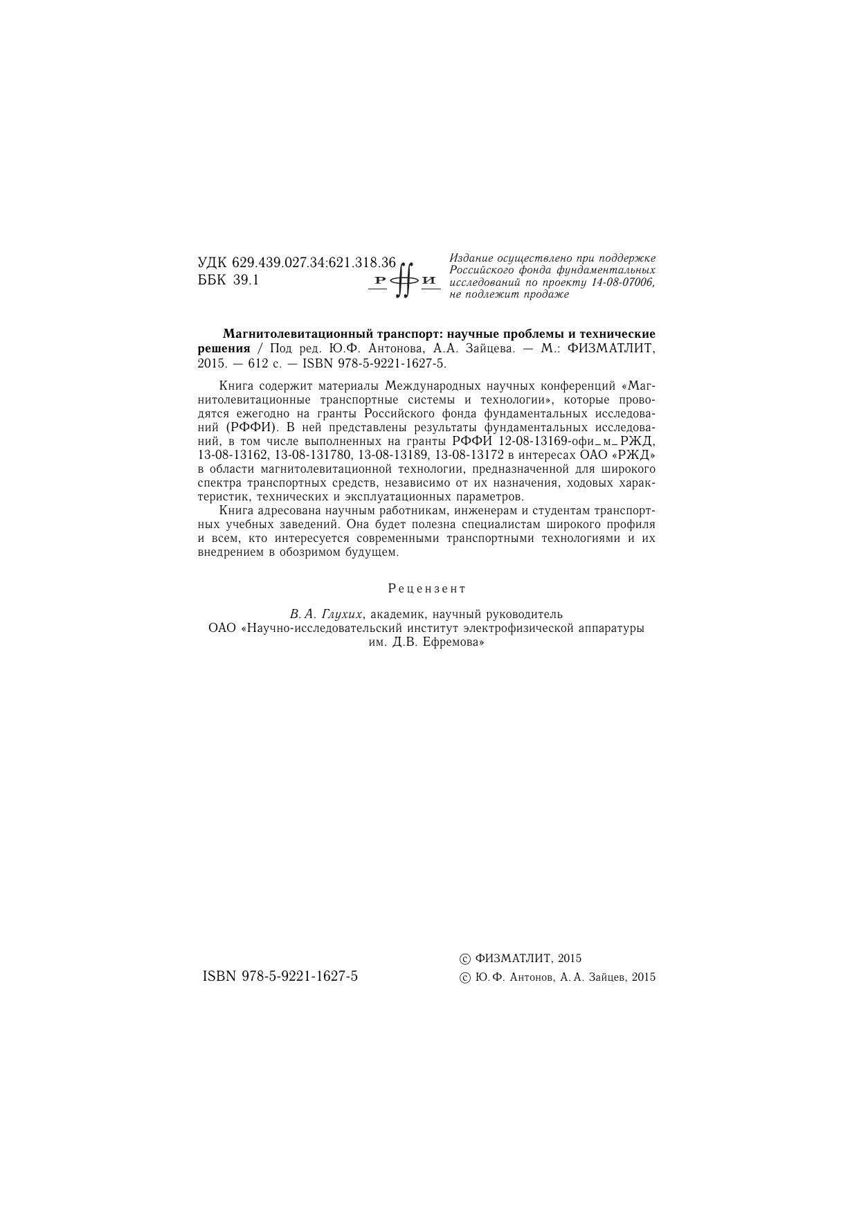 Книга содержит материалы Международных научных конференций «Магнитолевитационные транспортные системы и технологии», которые проводятся ежегодно на гранты Российского фонда фундаментальных исследований (РФФИ). В ней представлены результаты фундаментальных исследований, в том числе выполненных на гранты РФФИ 12-08-13169-офи_м_РЖД, 13-08-13162, 13-08-131780, 13-08-13189, 13-08-13172 в интересах ОАО «РЖД» в области магнитолевитационной технологии, предназначенной для широкого спектра транспортных средств, независимо от их назначения, ходовых характеристик, технических и эксплуатационных параметров.