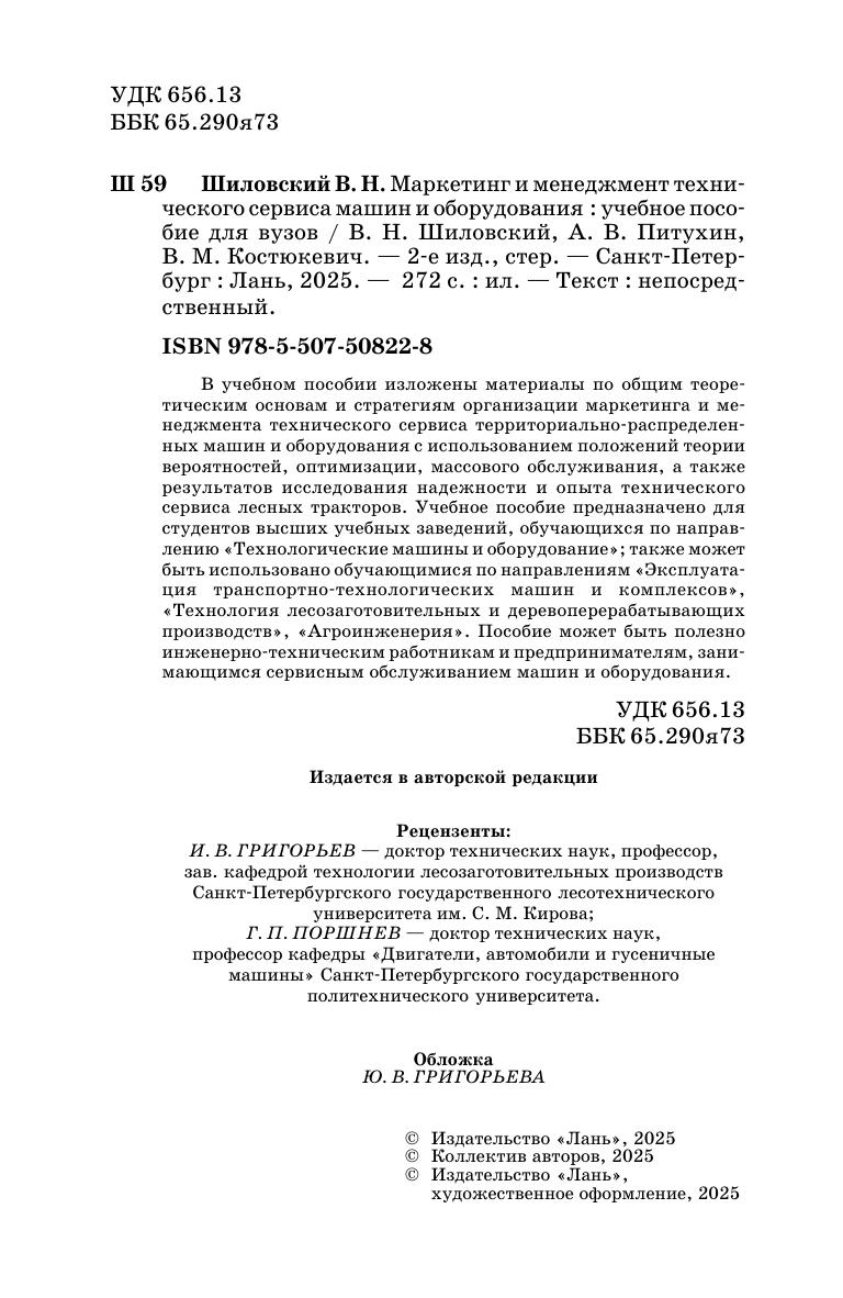 В учебном пособии изложены материалы по общим теоретическим основам и стратегиям организации маркетинга и менеджмента технического сервиса территориально-распределенных машин и оборудования с использованием положений теории вероятностей, оптимизации, массового обслуживания, а также результатов исследования надежности и опыта технического сервиса лесных тракторов.Учебное пособие предназначено для студентов высших учебных заведений, обучающихся по направлению "Технологические машины и оборудование", также может быть использовано обучающимися по направлениям "Эксплуатация транспортно-технологических машин и комплексов", "Технология лесозаготовительных и деревоперерабатывающих производств", "Агроинженерия". Пособие может быть полезно инженерно-техническим работникам и предпринимателям, занимающимся сервисным обслуживанием машин и оборудования.