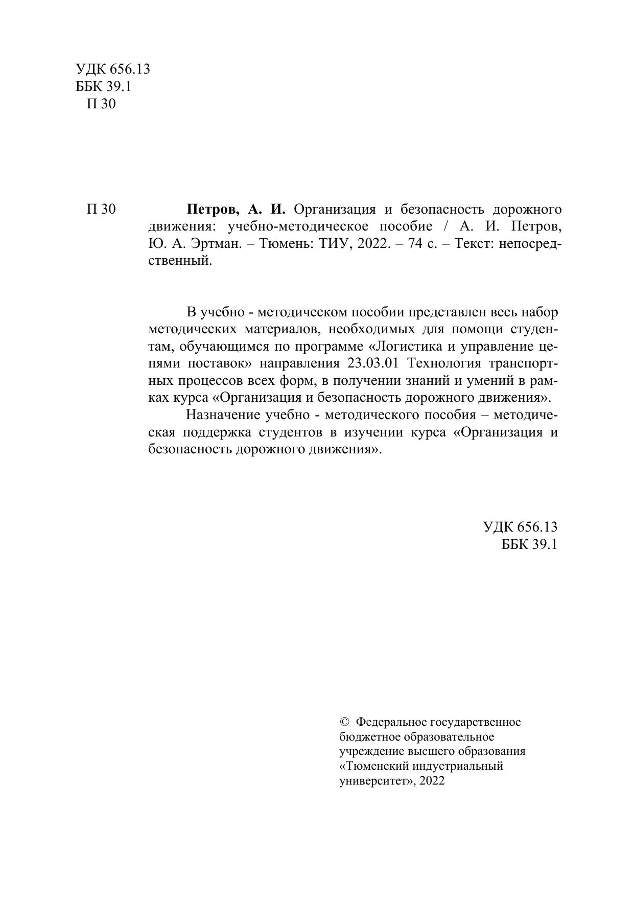 В учебно - методическом пособии представлен весь набор методических материалов, необходимых для помощи студентам, обучающимся по программе «Логистика и управление цепями поставок» направления 23.03.01 Технология транспортных процессов всех форм, в получении знаний и умений в рамках курса «Организация и безопасность дорожного движения». Назначение учебно - методического пособия – методическая поддержка студентов в изучении курса «Организация и безопасность дорожного движения».