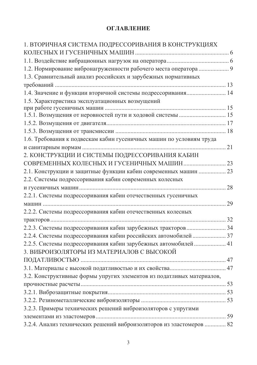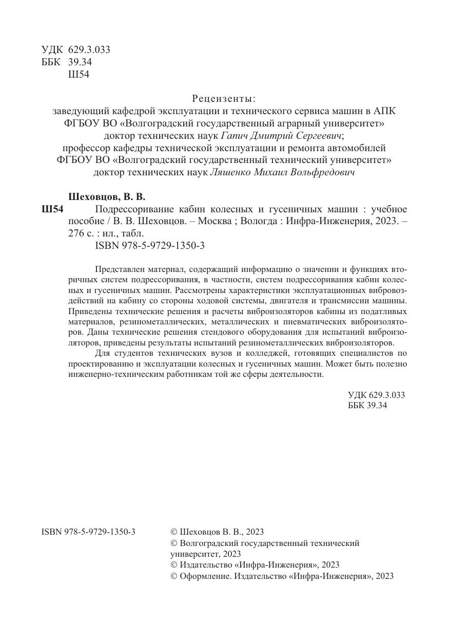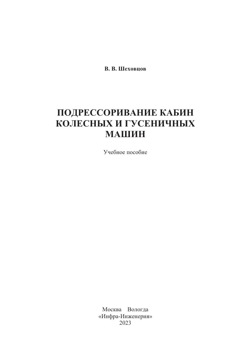 Представлен материал, содержащий информацию о значении и функциях вторичных систем подрессоривания, в частности, систем подрессоривания кабин колесных и гусеничных машин. Рассмотрены характеристики эксплуатационных вибровоздействий на кабину со стороны ходовой системы, двигателя и трансмиссии машины. Приведены технические решения и расчеты виброизоляторов кабины из податливых материалов, резинометаллических, металлических и пневматических виброизоляторов. Даны технические решения стендового оборудования для испытаний виброизоляторов, приведены результаты испытаний резинометаллических виброизоляторов.