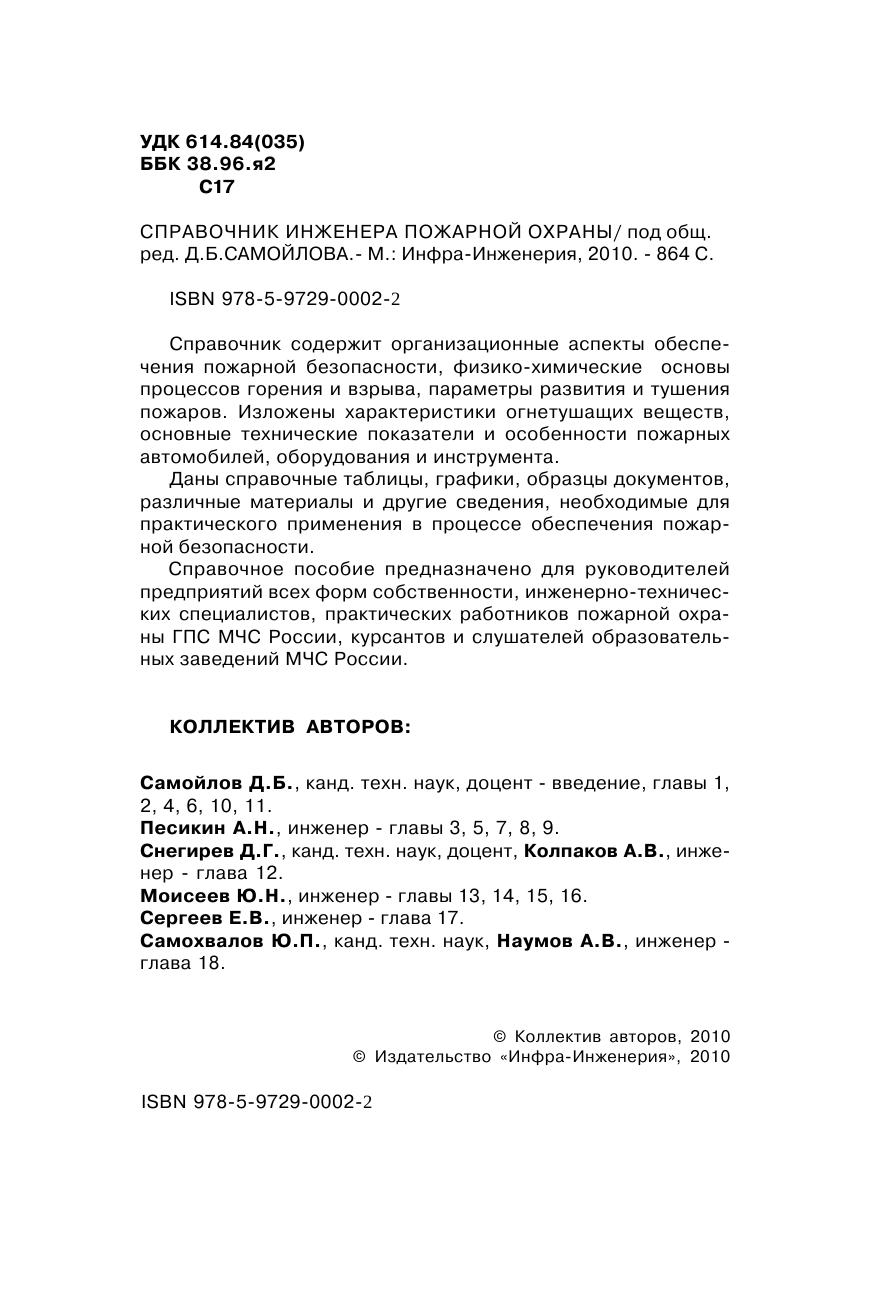 Справочник содержит организационные аспекты обеспечения пожарной безопасности, физико-химические основы процессов горения и взрыва, параметры развития и тушения пожаров. Изложены характеристики огнетушащих веществ, основные технические показатели и особенности пожарных автомобилей, оборудования и инструмента. Даны справочные таблицы, графики, образцы документов, различные материалы и другие сведения, необходимые для практического применения в процессе обеспечения пожарной безопасности. Справочное пособие предназначено для руководителей предприятий всех форм собственности, инженерно-технических специалистов, практических работников пожарной охраны ГПС МЧС России, курсантов и слушателей образовательных учреждений МЧС России.