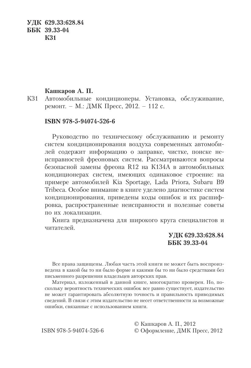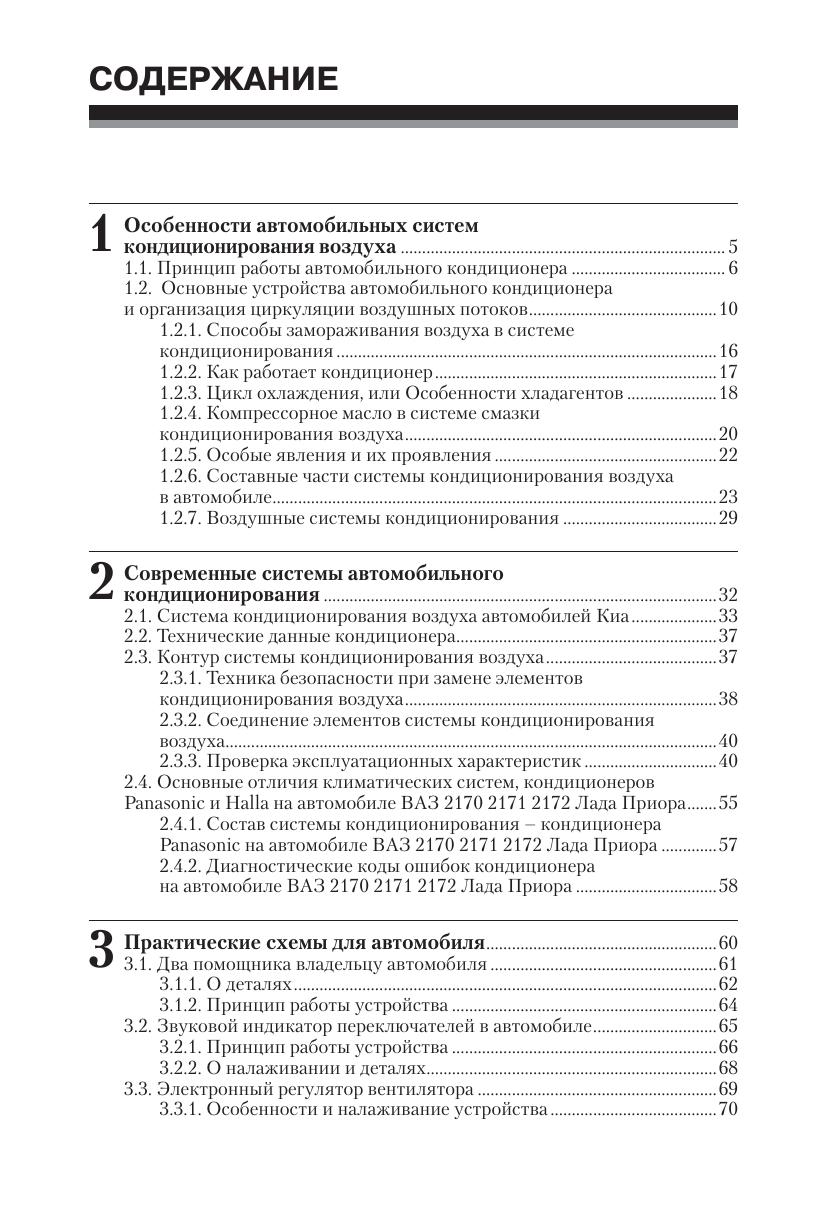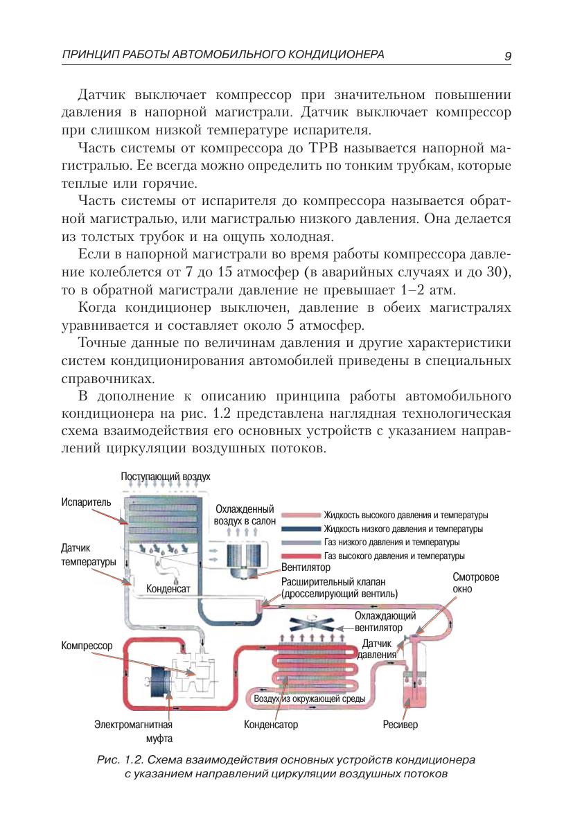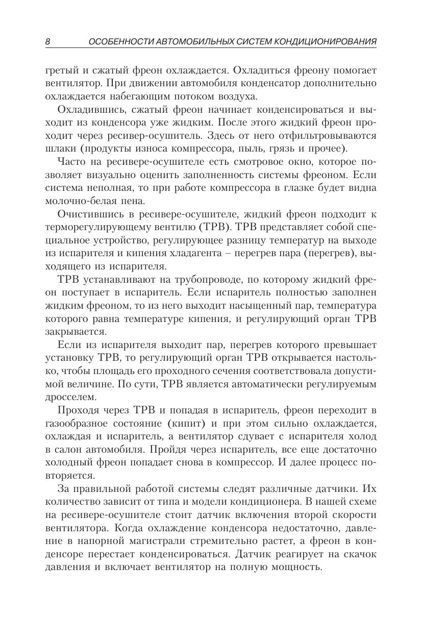 Руководство по техническому обслуживанию и ремонту систем кондиционирования воздуха современных автомобилей содержит информацию о заправке, чистке, поиске неисправностей фреоновых систем. Рассматриваются вопросы безопасной замены фреона R12 на К134А в автомобильных кондиционерах систем, имеющих одинаковое строение: на примере автомобилей Kia Sportage, Lada Priora, Subaru B9 Tribeca. Особое внимание в книге уделено диагностике систем кондиционирования, приведены коды ошибок и их расшифровка, распространенные неисправности и полезные советы по их локализации. Книга предназначена для широкого круга специалистов и читателей.