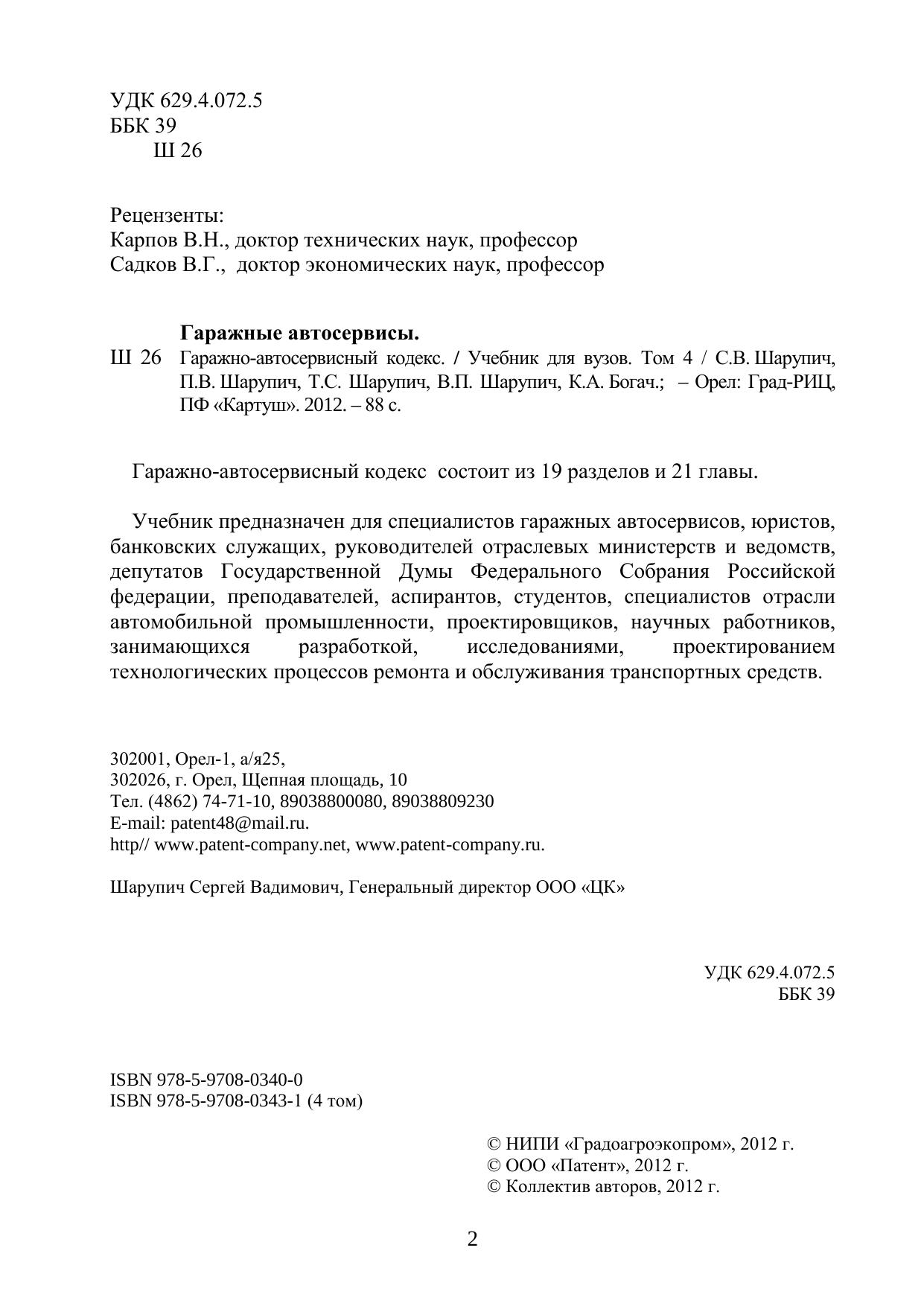Учебник предназначен для специалистов гаражных автосервисов, юристов, банковских служащих, руководителей отраслевых министерств и ведомств, депутатов Государственной Думы Федерального Собрания Российской федерации, преподавателей, аспирантов, студентов, специалистов отрасли автомобильной промышленности, проектировщиков, научных работников, занимающихся разработкой, исследованиями, проектированием технологических процессов ремонта и обслуживания транспортных средств.