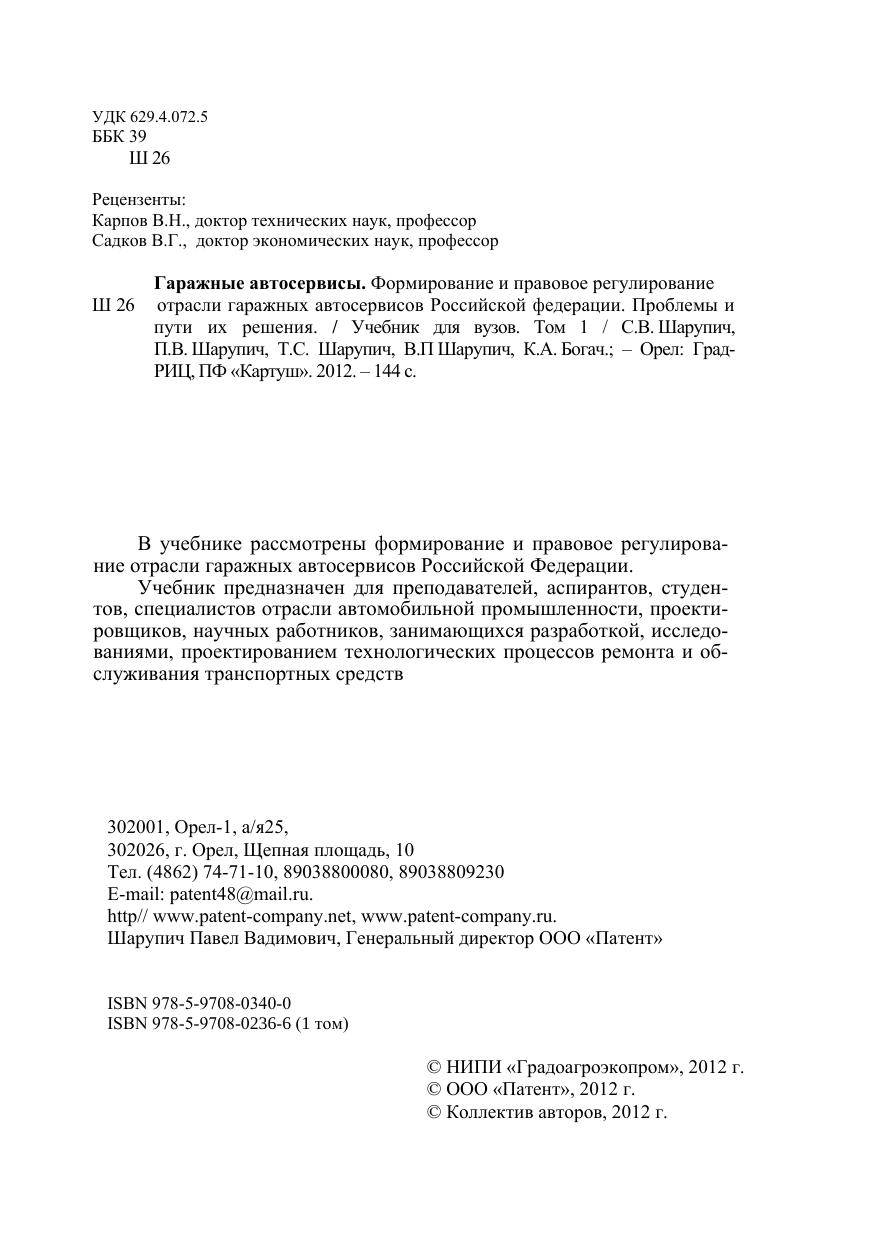В учебнике рассмотрены формирование и правовое регулирование отрасли гаражных автосервисов Российской Федерации. Учебник предназначен для преподавателей, аспирантов, студентов, специалистов отрасли автомобильной промышленности, проектировщиков, научных работников, занимающихся разработкой, исследованиями, проектированием технологических процессов ремонта и обслуживания транспортных средств