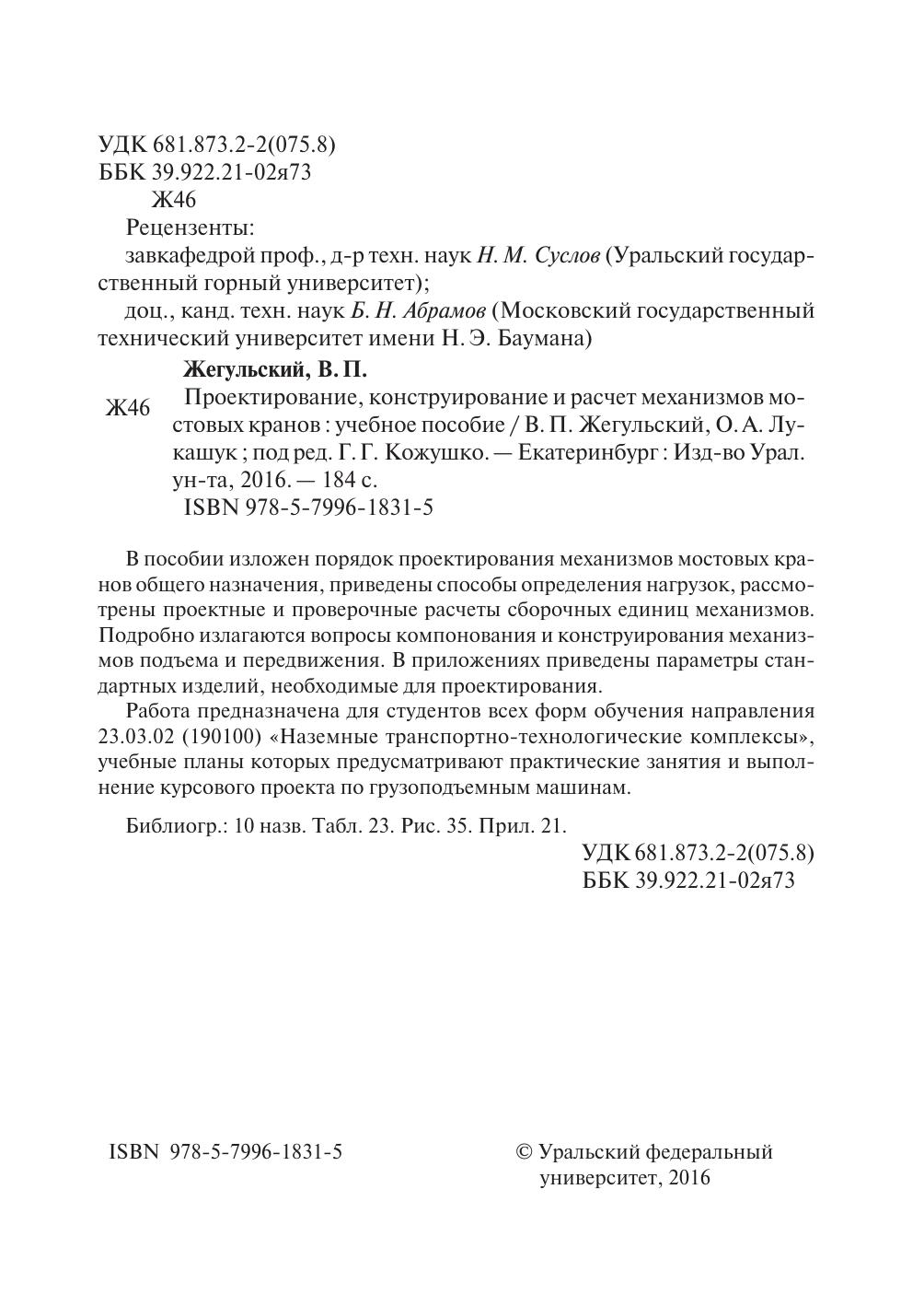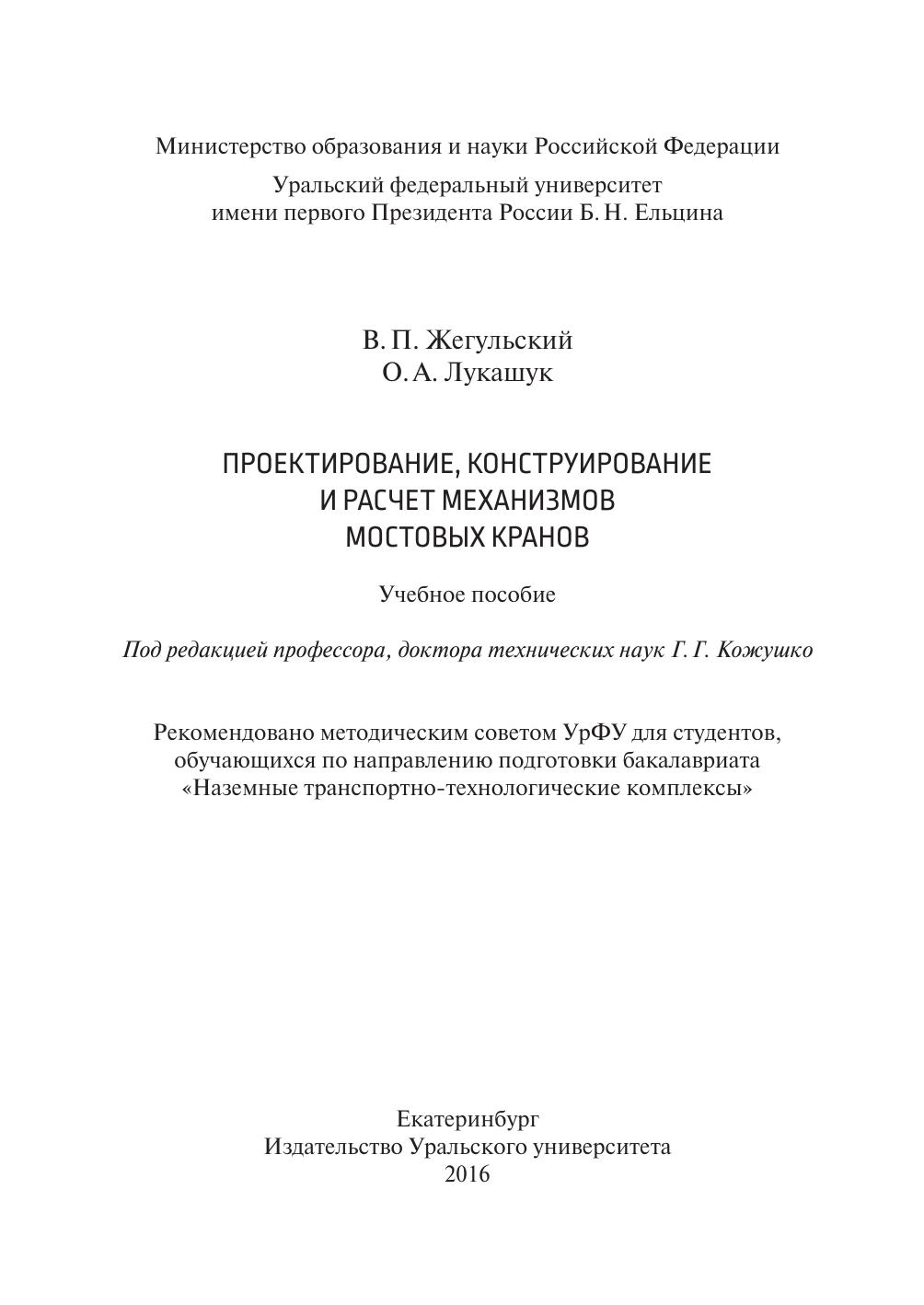 В пособии изложен порядок проектирования механизмов мостовых кранов общего назначения, приведены способы определения нагрузок, рассмотрены проектные и проверочные расчеты сборочных единиц механизмов. Подробно излагаются вопросы компонования и конструирования механизмов подъема и передвижения. В приложениях приведены параметры стандартных изделий, необходимые для проектирования. Работа предназначена для студентов всех форм обучения направления 23.03.02 (190100) «Наземные транспортно-технологические комплексы», учебные планы которых предусматривают практические занятия и выполнение курсового проекта по грузоподъемным машинам.
