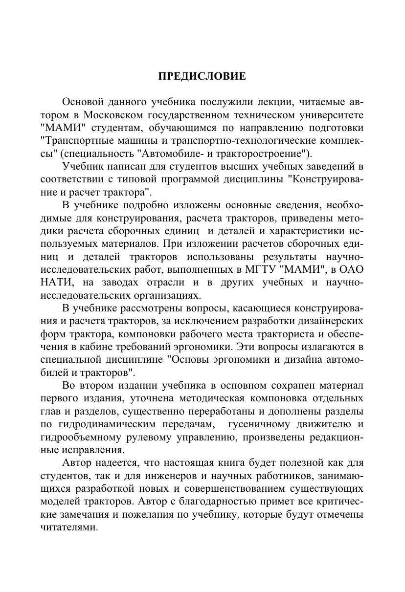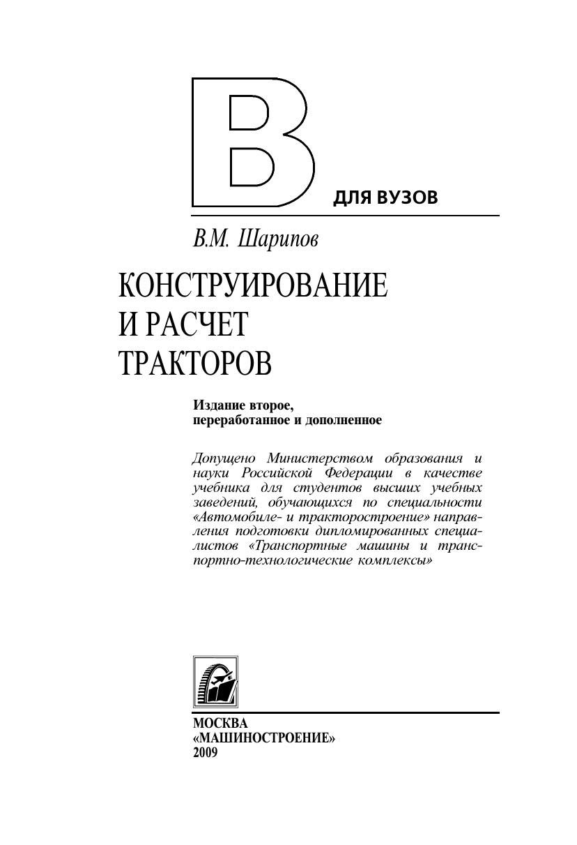 Рассмотрены основные принципы конструирования и расчета тракторов. Приведены методики расчета сборочных единиц и деталей и характеристики используемых материалов. 2-е издание (1-е изд. 2004 г.) переработано и дополнено разделами по гидродинамическим передачам, гусеничному движителю и гидрообъемному рулевому управлению. Для студентов высших учебных заведений, изучающих конструирование и расчет тракторов и автомобилей, а также для инженерно-технических работников, занимающихся разработкой новых и совершенствованием существующих моделей тракторов.