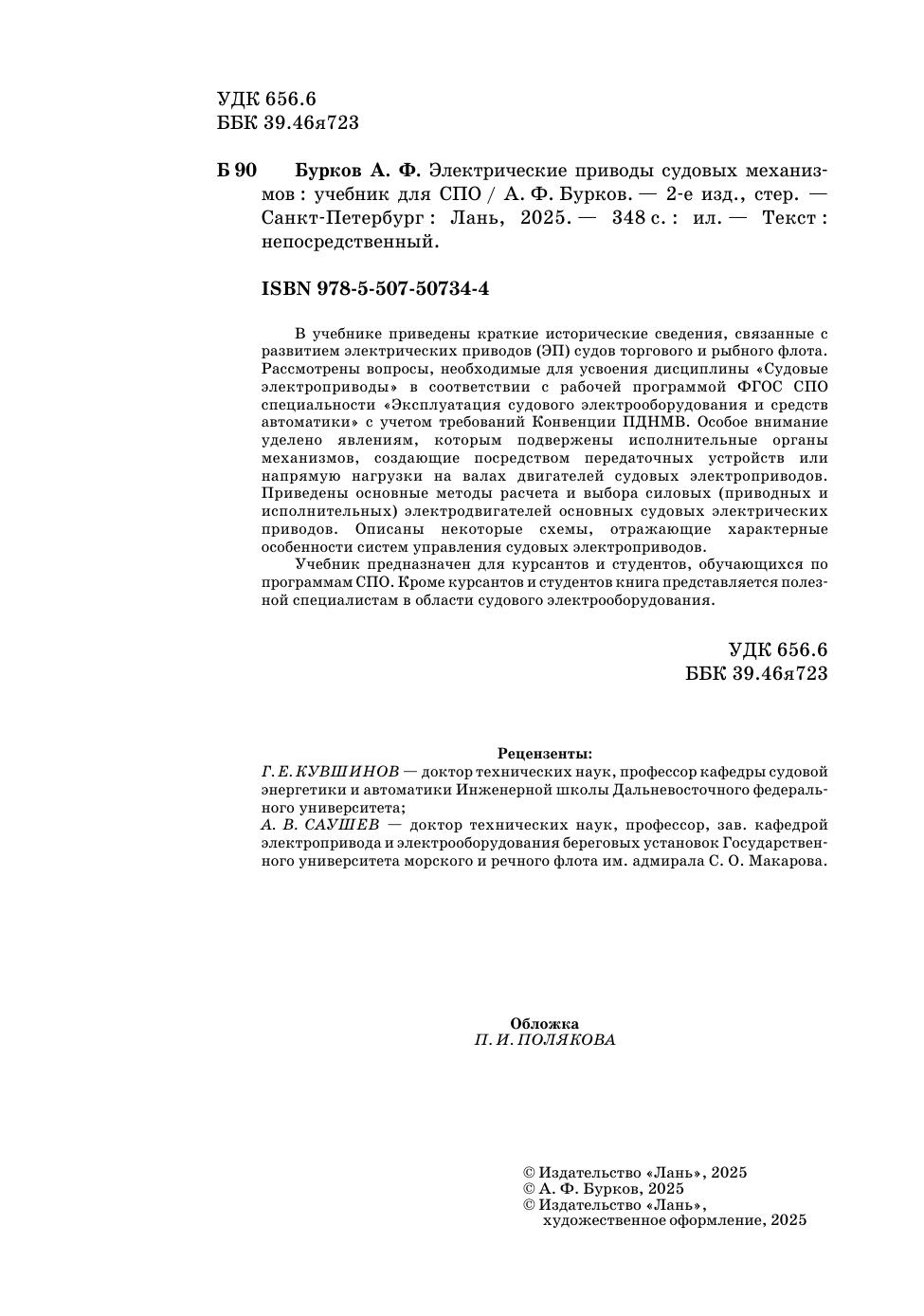 В учебнике приведены краткие исторические сведения, связанные с развитием электрических приводов (ЭП) судов торгового и рыбного флота. Рассмотрены вопросы, необходимые для усвоения дисциплины «Судовые электроприводы» в соответствии с рабочей программой ФГОС СПО специальности «Эксплуатация судового электрооборудования и средств автоматики» с учетом требований Конвенции ПДНМВ. Особое внимание уделено явлениям, которым подвержены исполнительные органы механизмов, создающие посредством передаточных устройств или напрямую нагрузки на валах двигателей судовых электроприводов. Приведены основные методы расчета и выбора силовых (приводных и исполнительных) электродвигателей основных судовых электрических приводов. Описаны некоторые схемы, отражающие характерные особенности систем управления судовых электроприводов. Учебник предназначен для курсантов/студентов, обучающихся по программам СПО. Кроме курсантов и студентов книга представляется полезной специалистам в области судового электрооборудования.