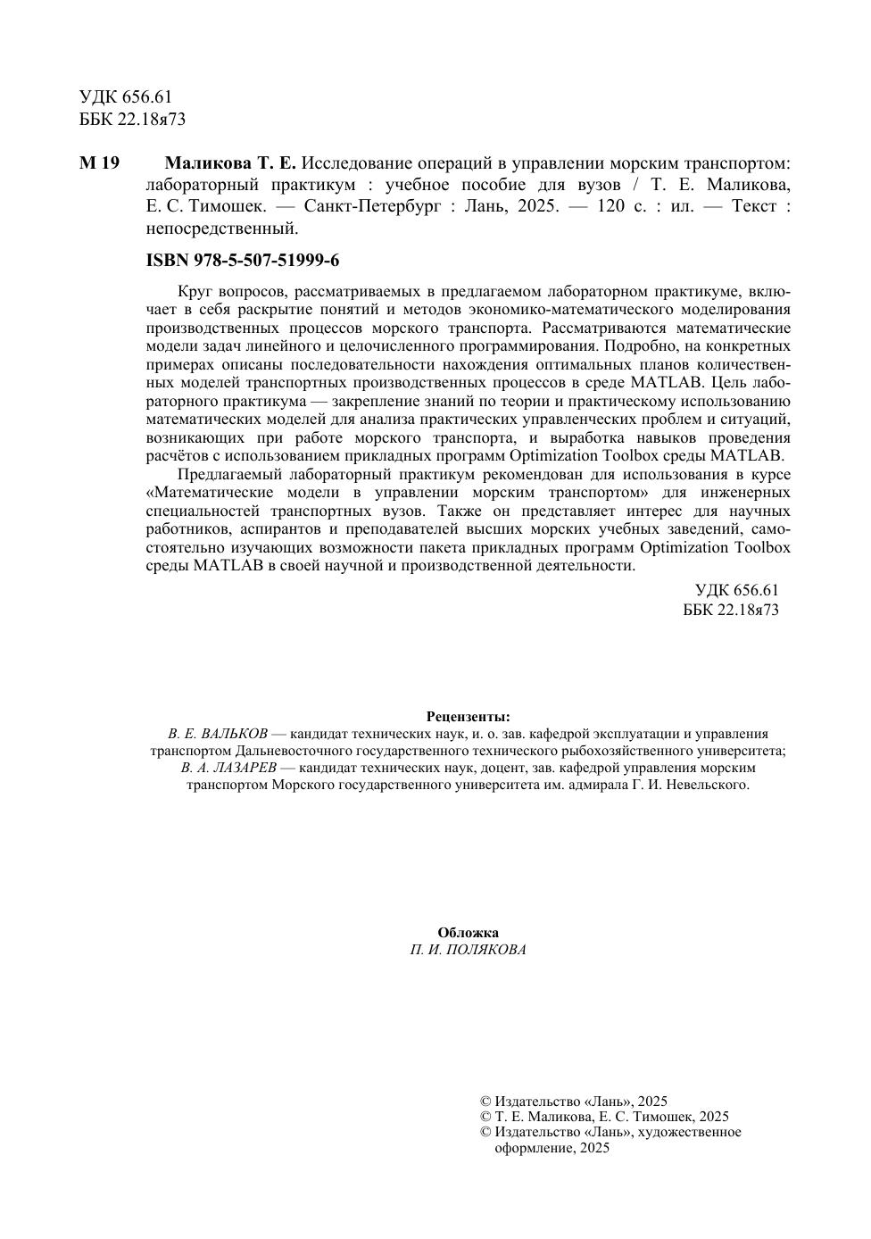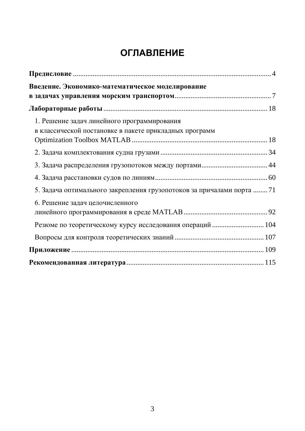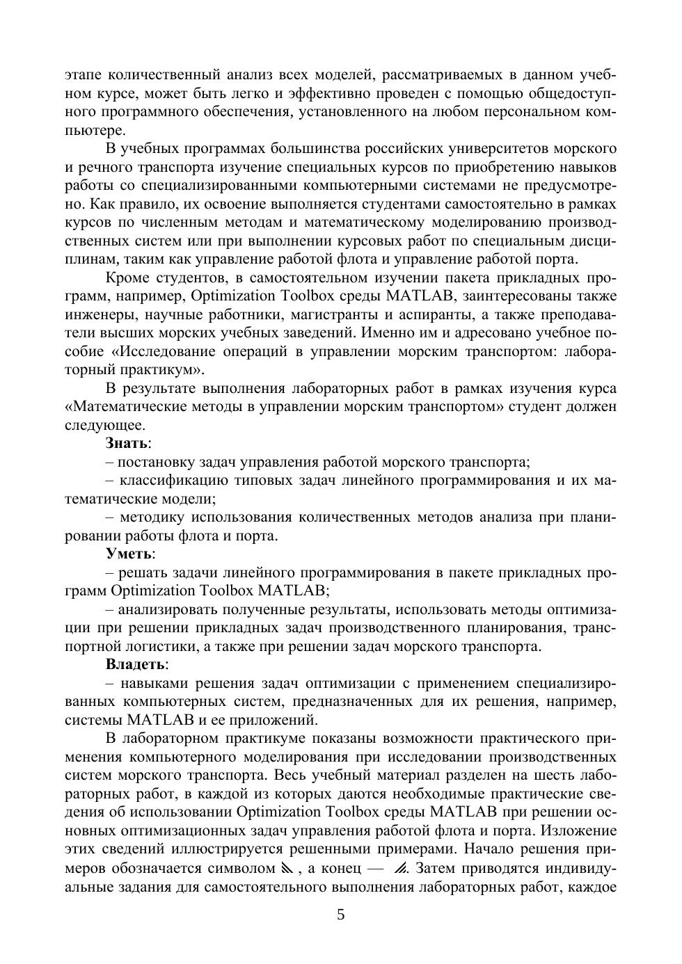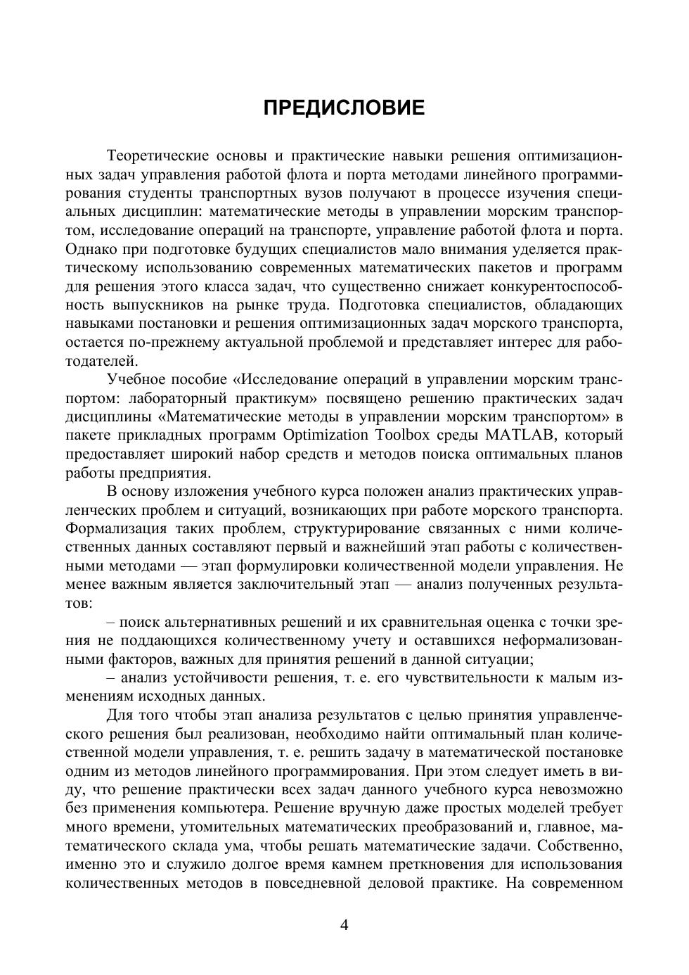 Круг вопросов, рассматриваемых в предлагаемом лабораторном практикуме, включает в себя раскрытие понятий и методов экономико-математического моделирования производственных процессов морского транспорта. Рассматриваются математические модели задач линейного и целочисленного программирования. Подробно, на конкретных примерах описаны последовательности нахождения оптимальных планов количественных моделей транспортных производственных процессов в среде MATLAB. Цель лабо-раторного практикума — закрепление знаний по теории и практическому использованию математических моделей для анализа практических управленческих проблем и ситуаций, возникающих при работе морского транспорта, и выработка навыков проведения расчётов с использованием прикладных программ Optimization Toolbox среды MATLAB. Предлагаемый лабораторный практикум рекомендован для использования в курсе «Математические модели в управлении морским транспортом» для инженерных специальностей транспортных вузов. Также он представляет интерес для научных работников, аспирантов и преподавателей высших морских учебных заведений, самостоятельно изучающих возможности пакета прикладных программ Optimization Toolbox среды MATLAB в своей научной и производственной деятельности