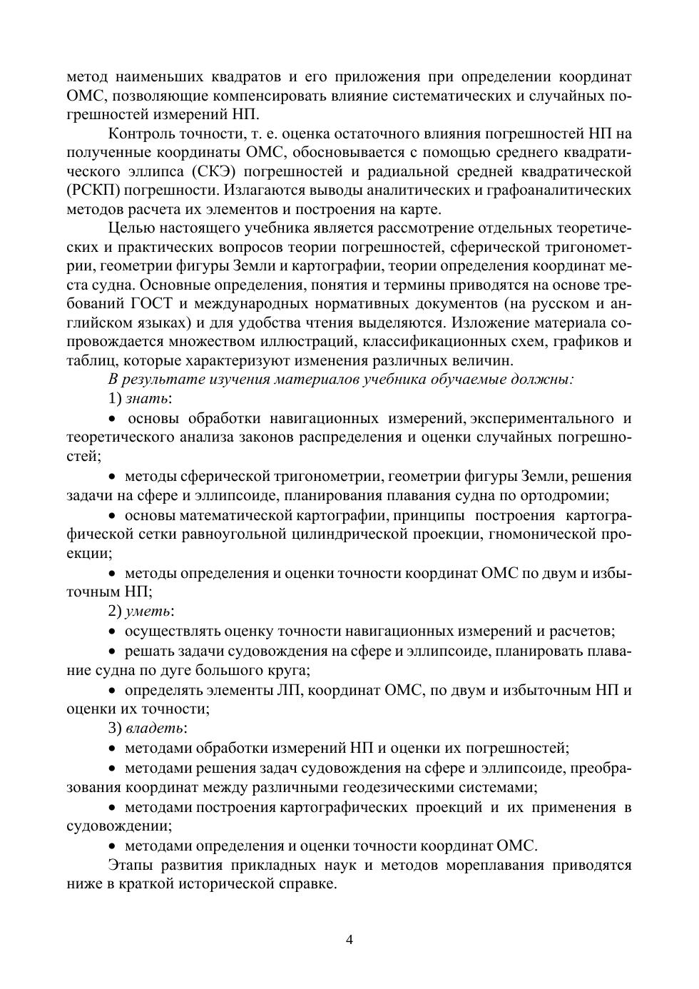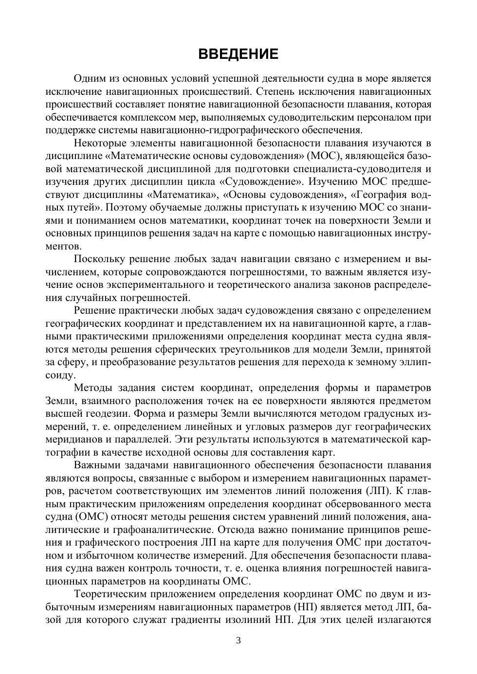 Излагаются теоретические основы обработки навигационных измерений, анализа законов распределения случайных погрешностей, методов их компенсации, сферической тригонометрии, свойства, типы и методы решения сферических треугольников. Рассматриваются теория фигуры Земли, геодезии и картографии, геометрические элементы земного эллипсоида, системы координат на поверхностях сравнения Земли, их взаимосвязь и преобразование, изображение земного эллипсоида на сфере и решения задач судовождения. Приводятся понятия навигационного параметра, навигационной функции (изолиний), выводы уравнений изолиний и градиентов, применяемых в судовождении, на поверхности Земли, принятой за сферу и плоскость, методы линеаризации навигационных функций (изолиний) для получения уравнений линий положения и расчетов их элементов. Излагаются теория определения и оценки точности координат обсервованного места судна (ОМС) по двум и избыточным навигационным параметрам методом наименьших квадратов, компенсации влияния систематических и случайных погрешностей, принципы оценки точности ОМС с помощью среднего квадратического эллипса и радиальной средней квадратической погрешности, аналитические и графоаналитические методы расчета их элементов и построения. Основные определения, понятия и термины приводятся на основе требований ГОСТ и международных нормативных документов. Рассматриваются типовые примеры для приобретения умений и навыков. Рекомендуется в качестве учебника по дисциплине «Математические основы судовождения» специальности «Судовождение».