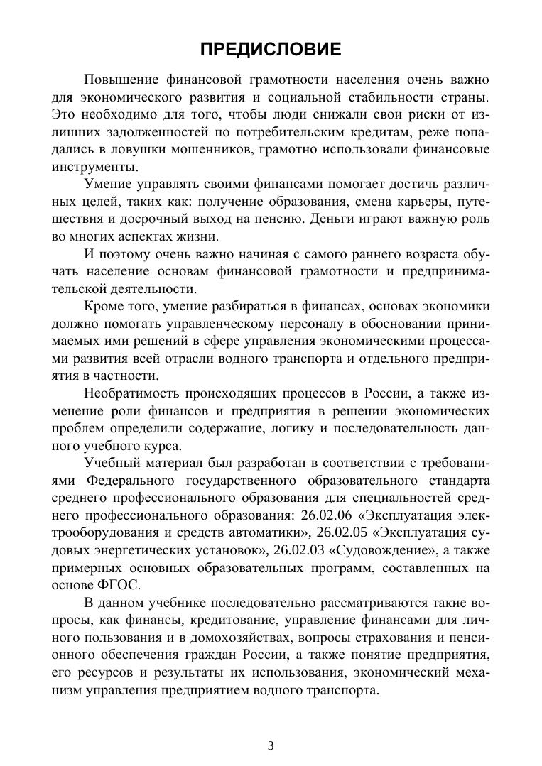 Рассмотрены понятия финансов, вопросы кредитования, управления финансами для личного пользования и в домохозяйствах, страхования и пенсионного обеспечения, понятие предприятия, его ресурсов и результаты их использования, экономический механизм управления предприятием водного транспорта. Соответствует современным требованиям ФГОС СПО и профессиональным квалификационным требованиям. Предназначен для студентов колледжей, обучающихся по УГС «Техника и технологии кораблестроения и водного транспорта».