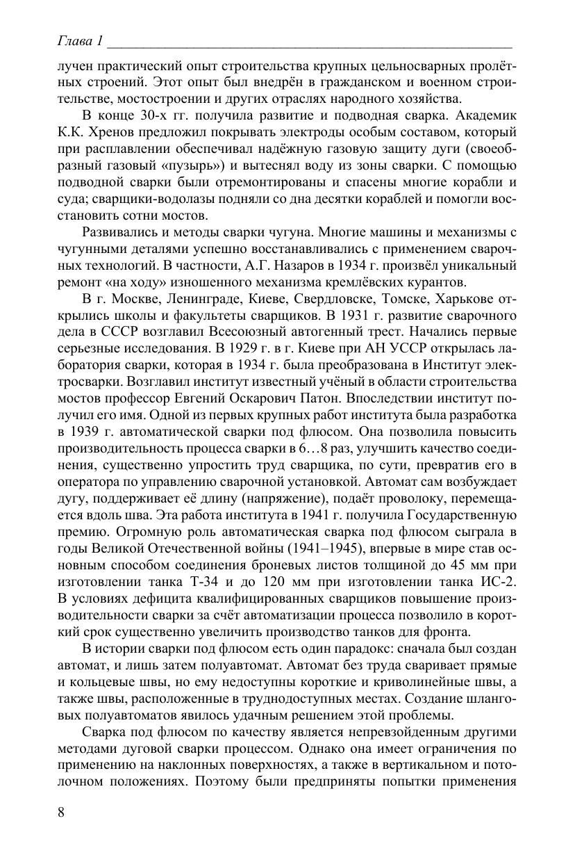 Дан ретроспективный обзор становления и развития сварки и газо-термических процессов. Приведена их классификация и рассмотрена физическая сущность. Изложены физико-металлургические основы сварки плавлением, давлением, пайки, термической резки, наплавки, напыления, металлизации. Дана характеристика сварочных, наплавочных и напыляемых материалов и оборудования. Описаны особенности технологии сварки, термической резки, пайки, наплавки, напыления, металлизации. Рассмотрены механизмы образования дефектов сварных швов и соединений, сварочных деформаций и напряжений, способы их уменьшения и предотвращения, а также вопросы обеспечения прочности и коррозионной стойкости сварных соединений, контроля качества, экономики и организации огневых работ, техники безопасности и экологической безопасности сварочных и газотермических процессов.
