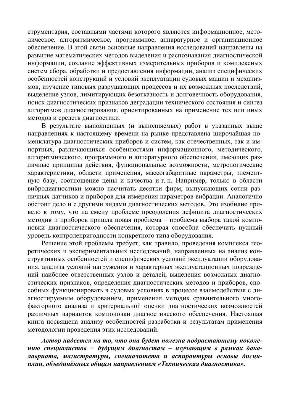 В учебном пособии рассматриваются вопросы технической диагностики судового энергетического оборудования. Техническая диагностика — это область науки и техники, изучающая и разрабатывающая методы и средства определения и прогнозирования технического состояния различных механизмов, машин и оборудования без их разборки. Достоверная оценка состояния оборудования на стадии эксплуатации предполагает использование соответствующего диагностического инструментария, составными частями которого являются информационное, методическое, алгоритмическое, программное, аппаратурное и организационное обеспечение. Учебное пособие предназначено для студентов, обучающихся по направлениям подготовки бакалавриата и магистратуры «Управление водным транспортом и гидрографическое обеспечение судоходства», «Кораблестроение, океанотехника и системотехника объектов морской инфраструктуры», и специалитета «Проектирование, изготовление и ремонт энергетических установок и систем автоматизации кораблей и судов», «Эксплуатация судовых энергетических установок». Книга также представляет научный и практический интерес для широкого круга специалистов, занимающихся эксплуатацией и обслуживанием судового оборудования и других энергомеханических объектов.
