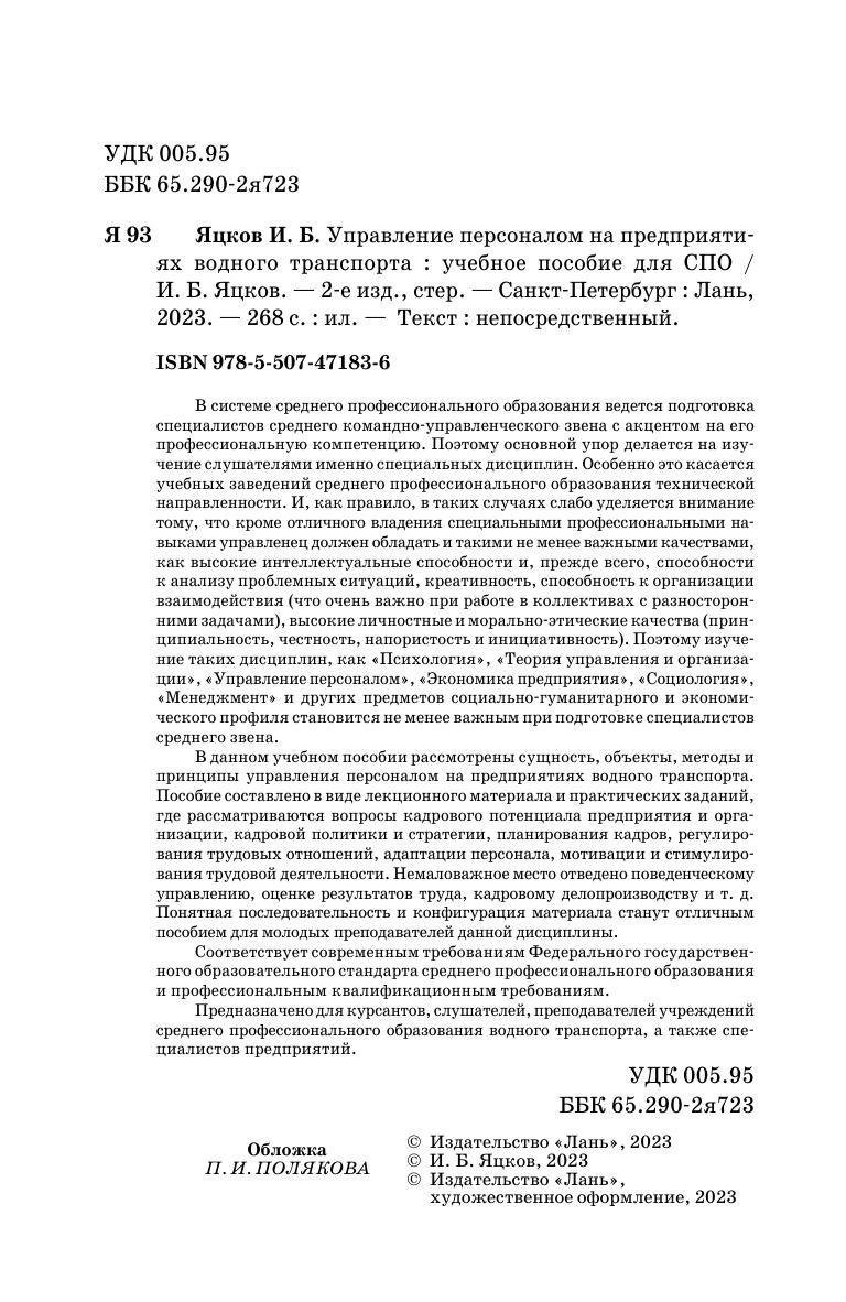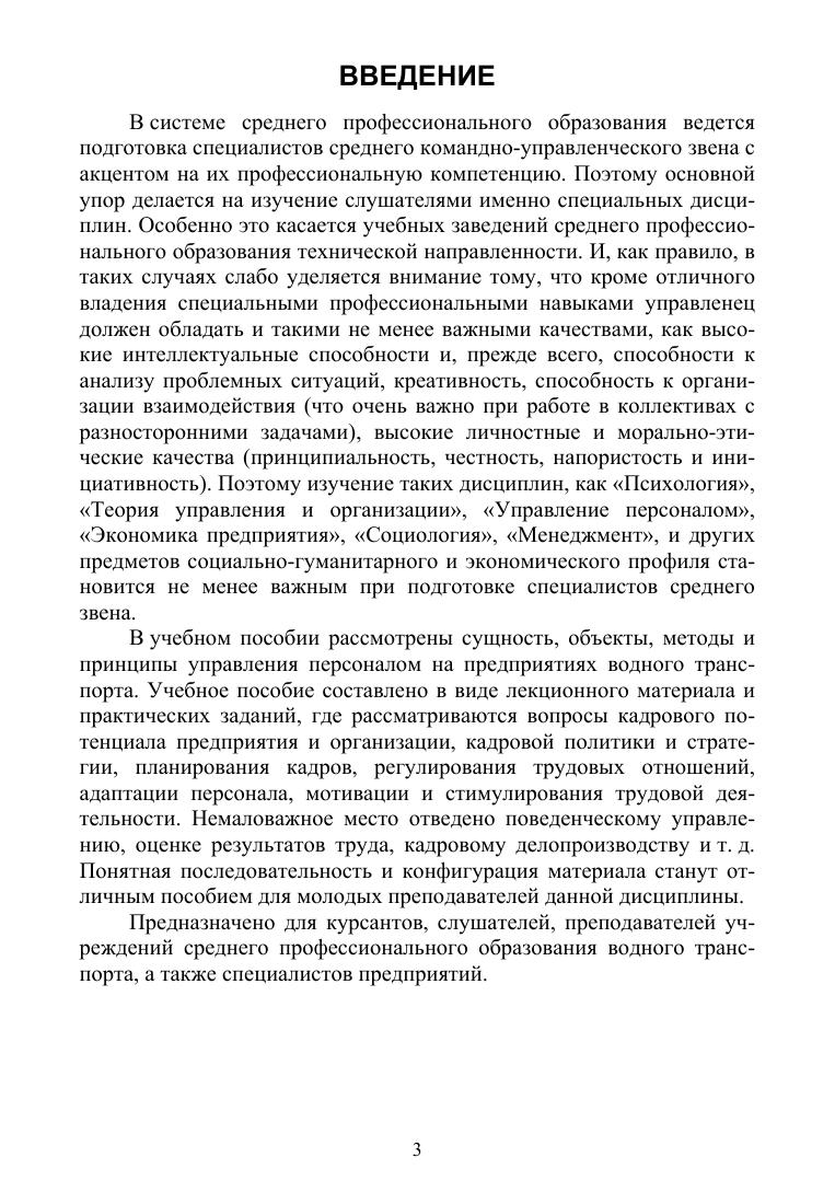 В системе среднего профессионального образования ведется подготовка специалистов среднего командно-управленческого звена с акцентом на его профессиональную компетенцию. Поэтому основной упор делается на изучение слушателями именно специальных дисциплин. Особенно это касается учебных заведений среднего профессионального образования технической направленности. И, как правило, в таких случаях слабо уделяется внимание тому, что кроме отличного владения специальными профессиональными навыками управленец должен обладать и такими не менее важными качествами, как высокие интеллектуальные способности и, прежде всего, способности к анализу проблемных ситуаций, креативность, способность к организации взаимодействия (что очень важно при работе в коллективах с разносторонними задачами), высокие личностные и морально-этические качества (принципиальность, честность, напористость и инициативность). Поэтому изучение таких дисциплин, как «Психология», «Теория управления и организации», «Управление персоналом», «Экономика предприятия», «Социология», «Менеджмент», и других предметов социально-гуманитарного и экономического профиля становится не менее важным при подготовке специалистов среднего звена. В данном учебном пособии рассмотрены сущность, объекты, методы и принципы управления персоналом на предприятиях водного транспорта. Пособие составлено в виде лекционного материала и практических заданий, где рассматриваются вопросы кадрового потенциала предприятия и организации, кадровой политики и стратегии, планирования кадров, регулирования трудовых отношений, адаптации персонала, мотивации и стимулирования трудовой деятельности. Немаловажное место отведено поведенческому управлению, оценке результатов труда, кадровому делопроизводству и т. д. Понятная последовательность и конфигурация материала станут отличным пособием для молодых преподавателей данной дисциплины. Соответствует современным требованиям Федерального государственного образовательного стандарта среднего профессионального образования и профессиональным квалификационным требованиям. Предназначено для курсантов, слушателей, преподавателей учреждений среднего профессионального образования водного транспорта, а также специалистов предприятий.