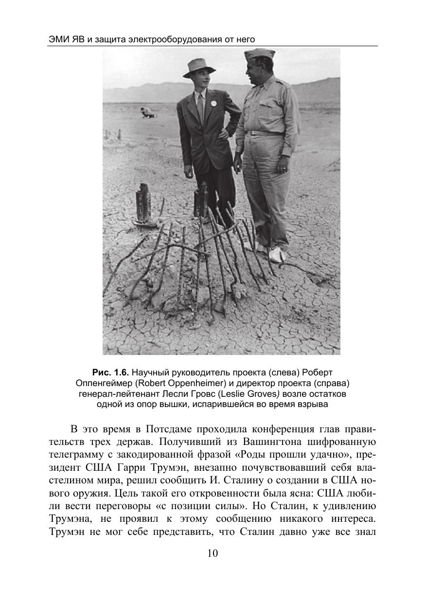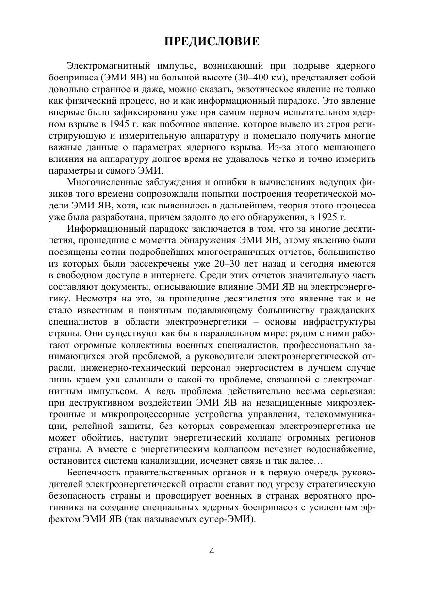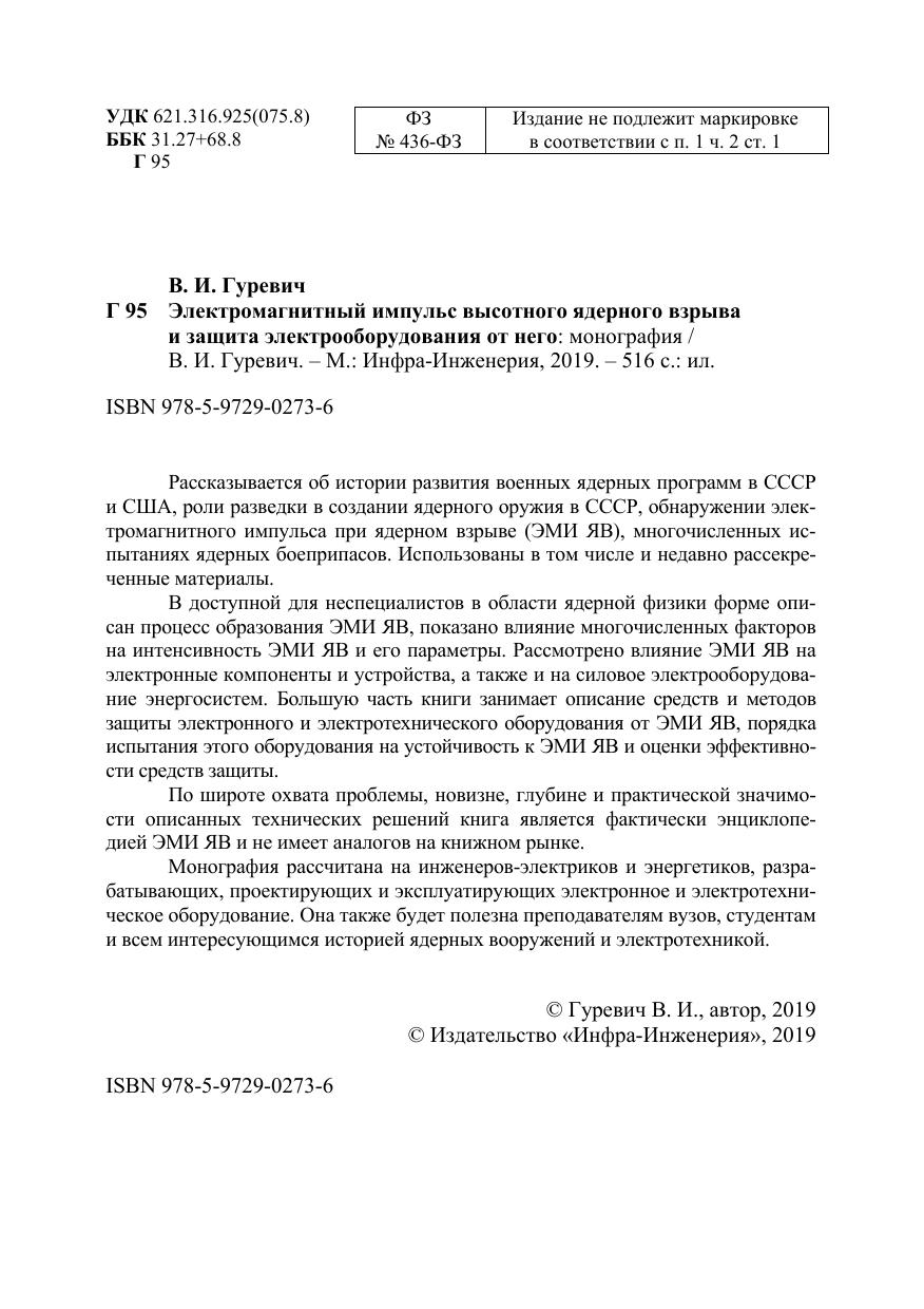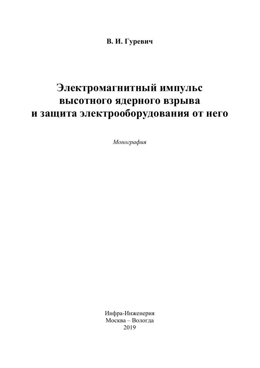 Рассказывается об истории развития военных ядерных программ в СССР и США, роли разведки в создании ядерного оружия в СССР, обнаружении электромагнитного импульса при ядерном взрыве (ЭМИ ЯВ), многочисленных испытаниях ядерных боеприпасов. Использованы в том числе и недавно рассекреченные материалы. В доступной для неспециалистов в области ядерной физики форме описан процесс образования ЭМИ ЯВ, показано влияние многочисленных факторов на интенсивность ЭМИ ЯВ и его параметры. Рассмотрено влияние ЭМИ ЯВ на электронные компоненты и устройства, а также и на силовое электрооборудование энергосистем. Большую часть книги занимает описание средств и методов защиты электронного и электротехнического оборудования от ЭМИ ЯВ, порядка испытания этого оборудования на устойчивость к ЭМИ ЯВ и оценки эффективности средств защиты. По широте охвата проблемы, новизне, глубине и практической значимости описанных технических решений книга является фактически энциклопедией ЭМИ ЯВ и не имеет аналогов на книжном рынке. Монография рассчитана на инженеров-электриков и энергетиков, разрабатывающих, проектирующих и эксплуатирующих электронное и электротехническое оборудование. Она также будет полезна преподавателям вузов, студентам и всем интересующимся историей ядерных вооружений и электротехникой.