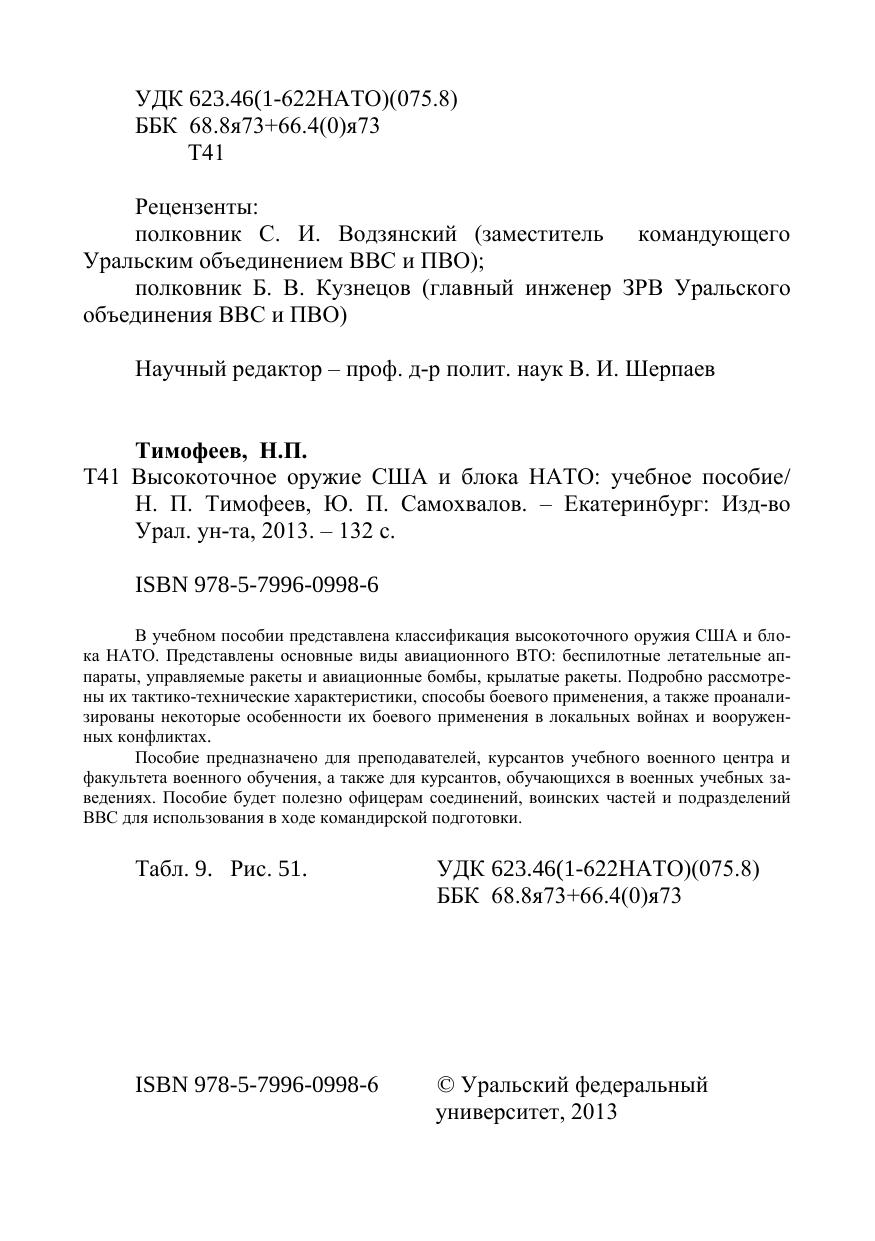 В учебном пособии представлена классификация высокоточного оружия США и блока НАТО. Представлены основные виды авиационного ВТО: беспилотные летательные аппараты, управляемые ракеты и авиационные бомбы, крылатые ракеты. Подробно рассмотрены их тактико-технические характеристики, способы боевого применения, а также проанализированы некоторые особенности их боевого применения в локальных войнах и вооруженных конфликтах. Пособие предназначено для преподавателей, курсантов учебного военного центра и факультета военного обучения, а также для курсантов, обучающихся в военных учебных заведениях. Пособие будет полезно офицерам соединений, воинских частей и подразделений ВВС для использования в ходе командирской подготовки.
