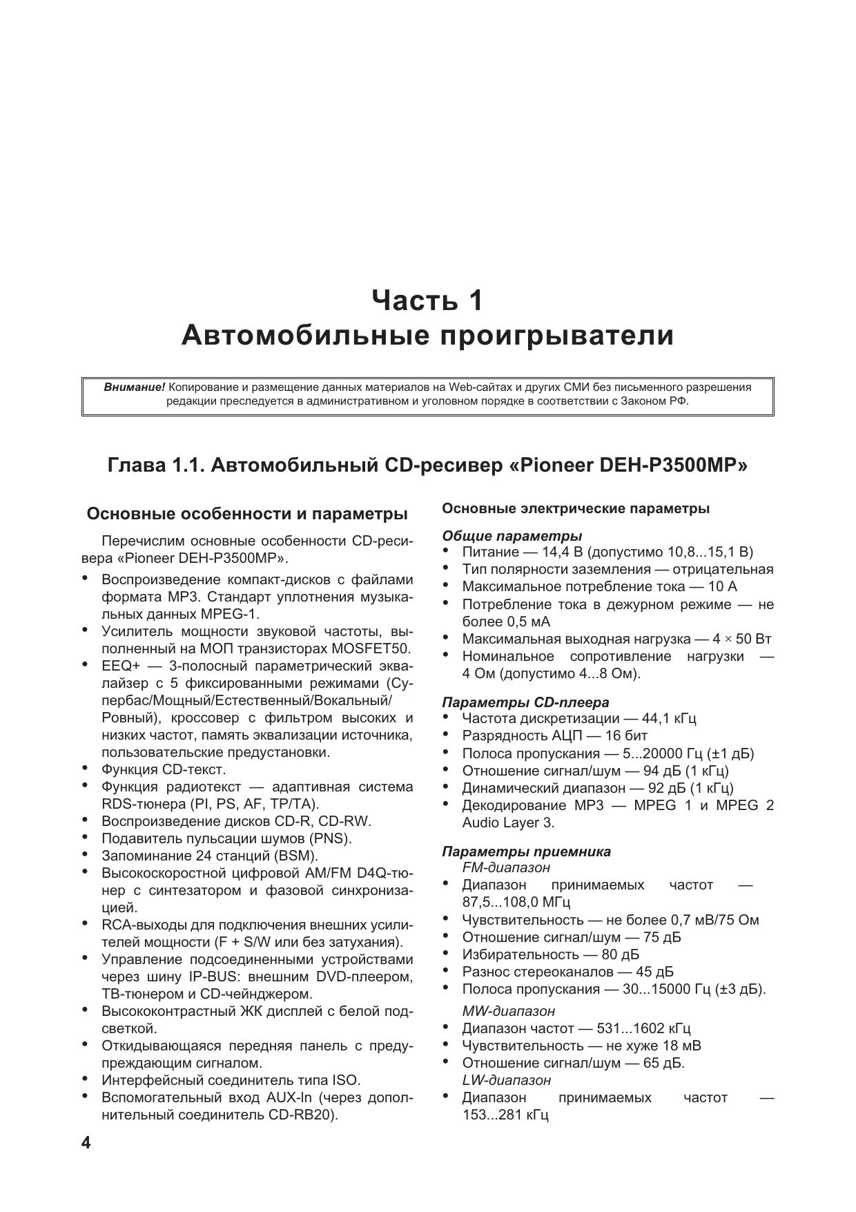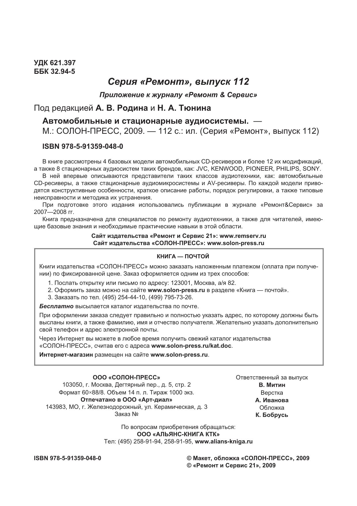 В книге рассмотрены 4 базовых модели автомобильных СD-ресиверов и более 12 их модификаций, а также 8 стационарных аудиосистем таких брендов, как: JVC, KENWOOD, PIONEER, PHILIPS, SONY. В ней впервые описываются представители таких классов аудиотехники, как: автомобильные CD-ресиверы, а также стационарные аудиомикросистемы и AV-ресиверы. По каждой модели приводятся конструктивные особенности, краткое описание работы, порядок регулировки, а также типовые неисправности и методика их устранения. При подготовке этого издания использовались публикации в журнале «Ремонт&Сервис» за 2007—2008 гг. Книга предназначена для специалистов по ремонту аудиотехники, а также для читателей, имеющие базовые знания и необходимые практические навыки в этой области.