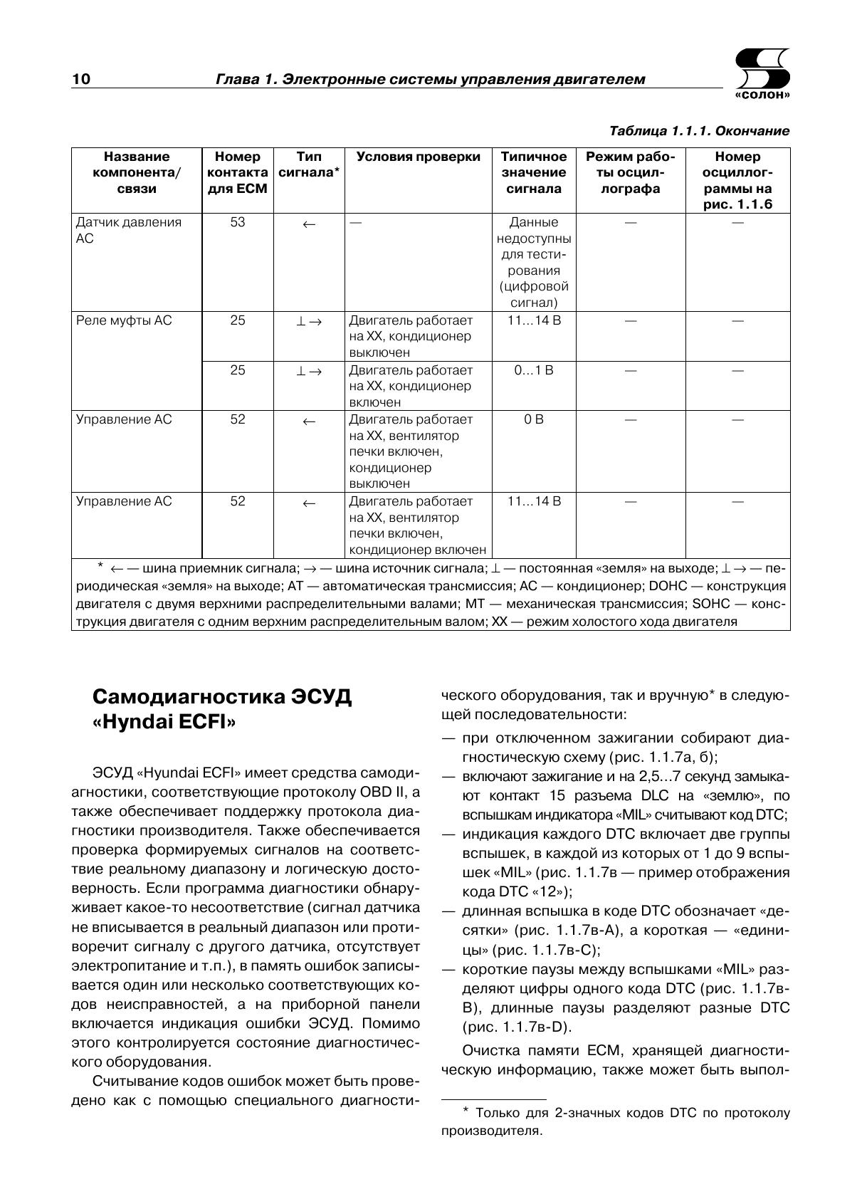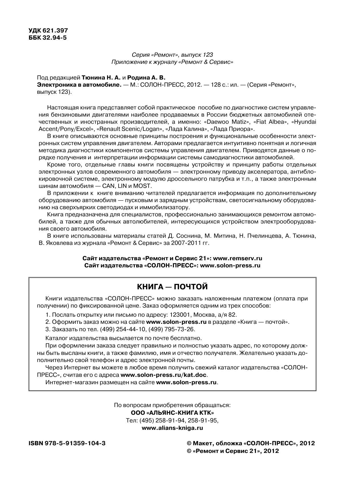 Настоящая книга представляет собой практическое пособие по диагностике систем управления бензиновыми двигателями наиболее продаваемых в России бюджетных автомобилей отечественных и иностранных производителей, а именно: «Daewoo Matiz», «Fiat Albea», «Hyundai Accent/Pony/Excel», «Renault Scenic/Logan», «Лада Калина», «Лада Приора». В книге описываются основные принципы построения и функциональные особенности электронных систем управления двигателем. Авторами предлагается интуитивно понятная и логичная методика диагностики компонентов системы управления двигателем. Приводятся данные о порядке получения и интерпретации информации системы самодиагностики автомобилей. Кроме того, отдельные главы книги посвящены устройству и принципу работы отдельных электронных узлов современного автомобиля — электронному приводу акселератора, антиблокировочной системе, электронному модулю дроссельного патрубка и т.п., а также электронным шинам автомобиля — CAN, LIN и MOST. В приложении к книге вниманию читателей предлагается информация по дополнительному оборудованию автомобиля — пусковым и зарядным устройствам, светосигнальному оборудованию на сверхъярких светодиодах и иммобилизатору. Книга предназначена для специалистов, профессионально занимающихся ремонтом автомобилей, а также для обычных автолюбителей, интересующихся устройством электрооборудования своего автомобиля. В книге использованы материалы статей Д. Соснина, М. Митина, Н. Пчелинцева, А. Тюнина, В. Яковлева из журнала «Ремонт & Сервис» за 2007-2011 гг.