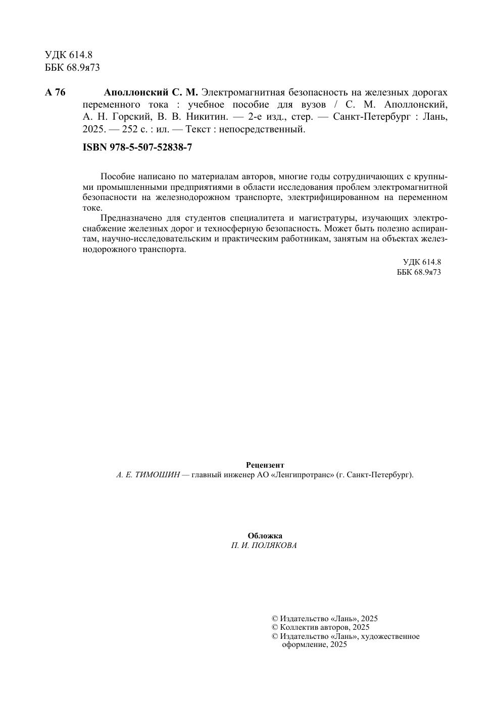 Пособие написано по материалам авторов, многие годы сотрудничающих с круп-ными промышленными предприятиями в области исследования проблем электромаг-нитной безопасности на железнодорожном транспорте, электрифицированном на пе-ременном токе. Предназначено для студентов специалитета и магистратуры, изучающих электро-снабжение железных дорог и техносферную безопасность. Может быть полезно аспи-рантам, научно-исследовательским и практическим работникам, занятым на объектах железнодорожного транспорта.