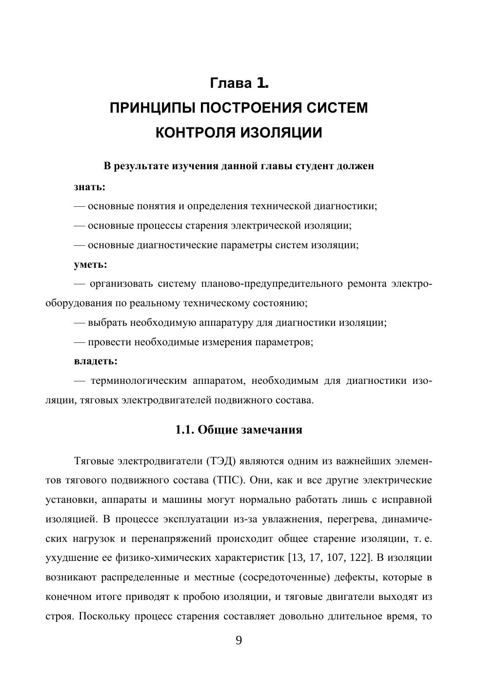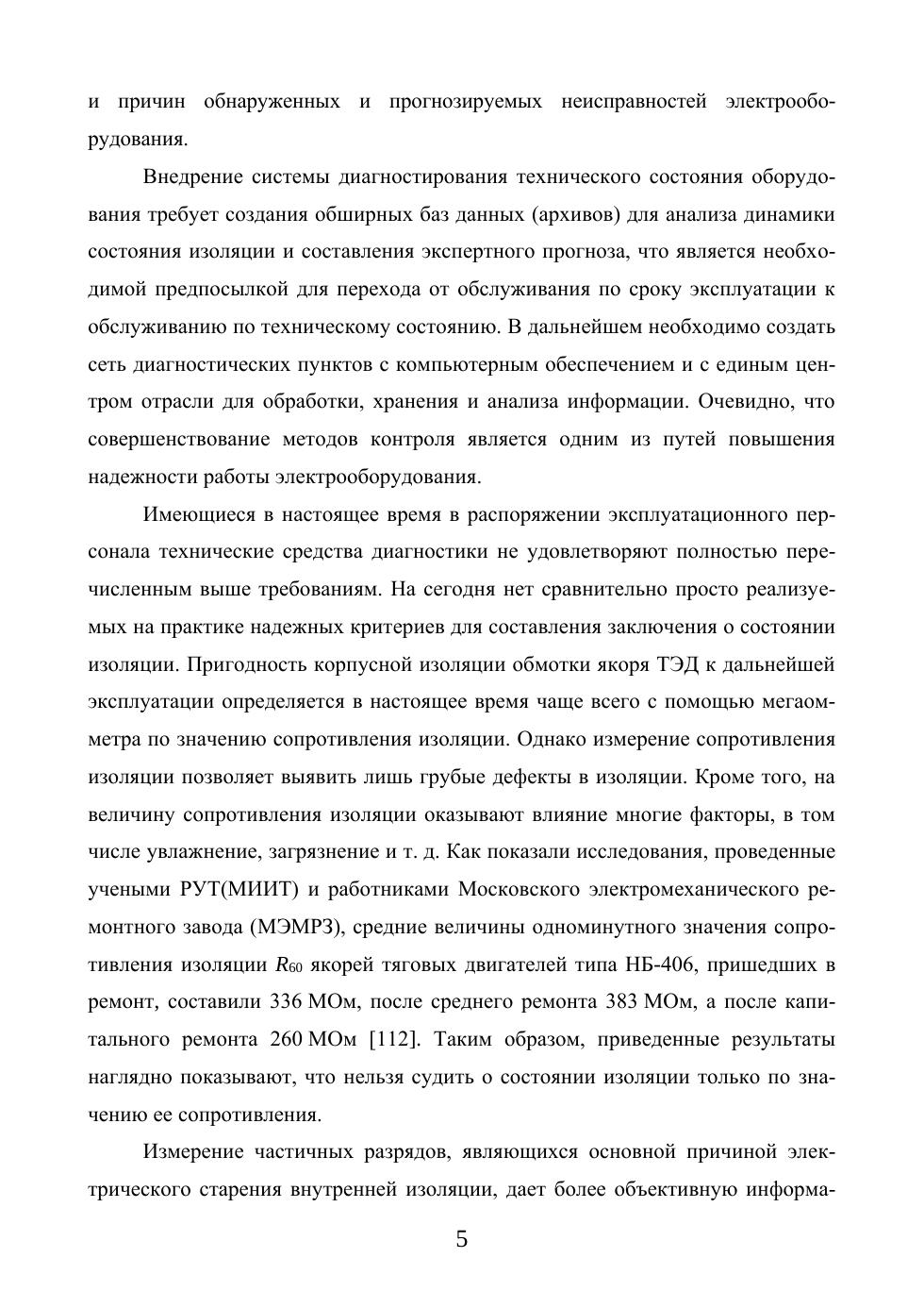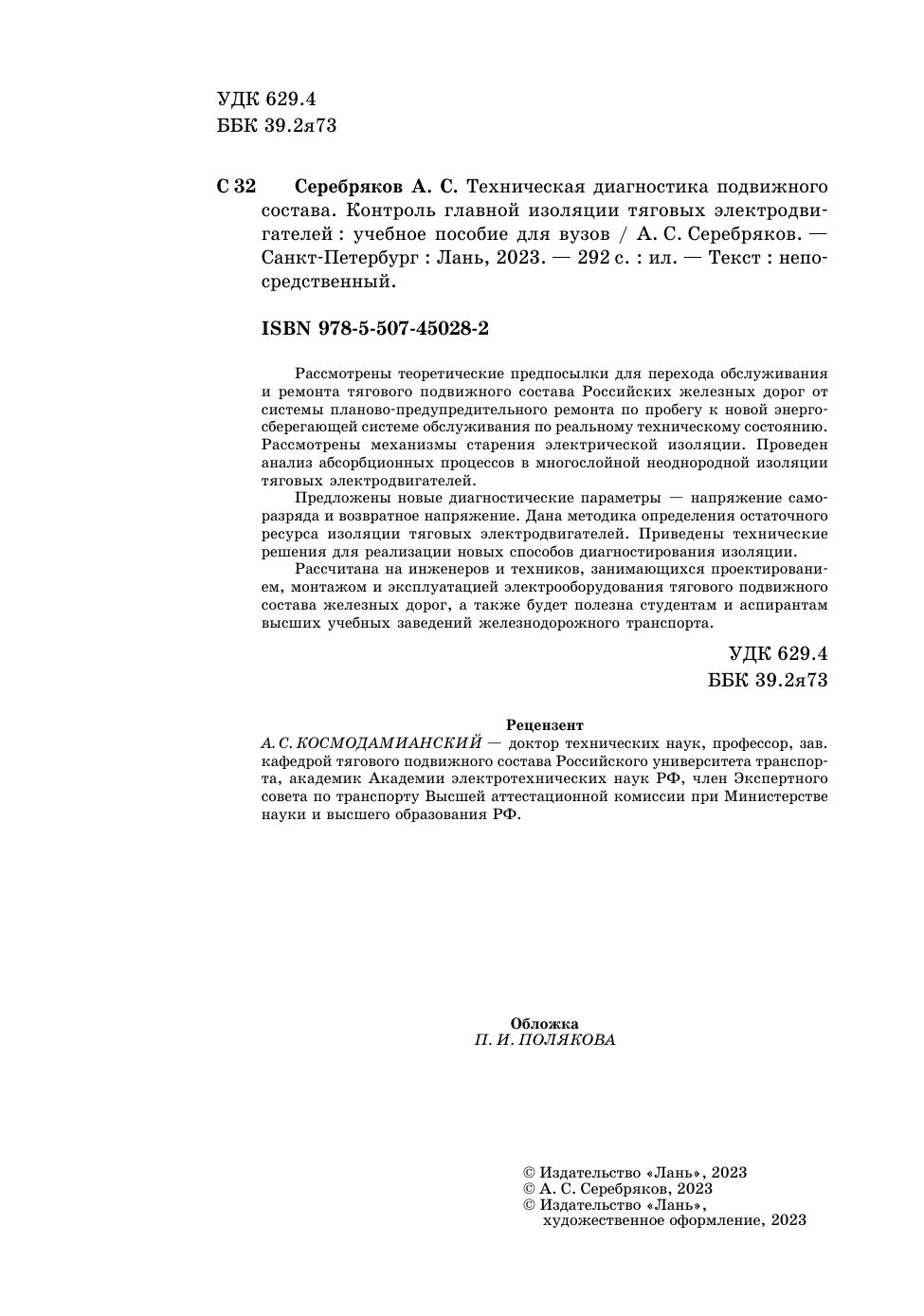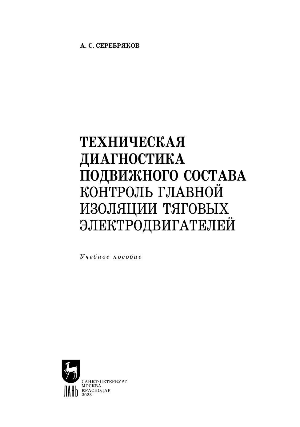 Рассмотрены теоретические предпосылки для перехода обслуживания и ремонта тягового подвижного состава Российских железных дорог от системы планово-предупредительного ремонта по пробегу к новой энергосберегающей системе обслуживания по реальному техническому состоянию. Рассмотрены механизмы старения электрической изоляции. Проведен анализ абсорбционных процессов в многослойной неоднородной изоляции тяговых электродвигателей. Предложены новые диагностические параметры – напряжение саморазряда и возвратное напряжение. Дана методика определения остаточного ресурса изоляции тяговых электродвигателей. Приведены технические решения для реализации новых способов диагностирования изоляции. Рассчитана на инженеров и техников, занимающихся проектированием, монтажом и эксплуатацией электрооборудования тягового подвижного состава железных дорог, а также будет полезна студентам и аспирантам высших учебных заведений железнодорожного транспорта.