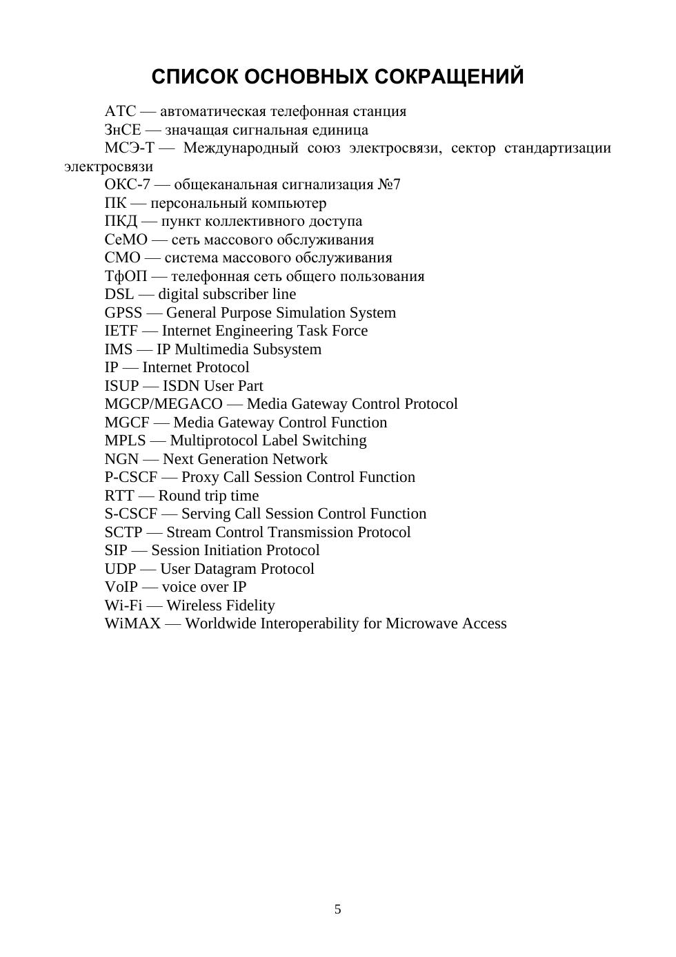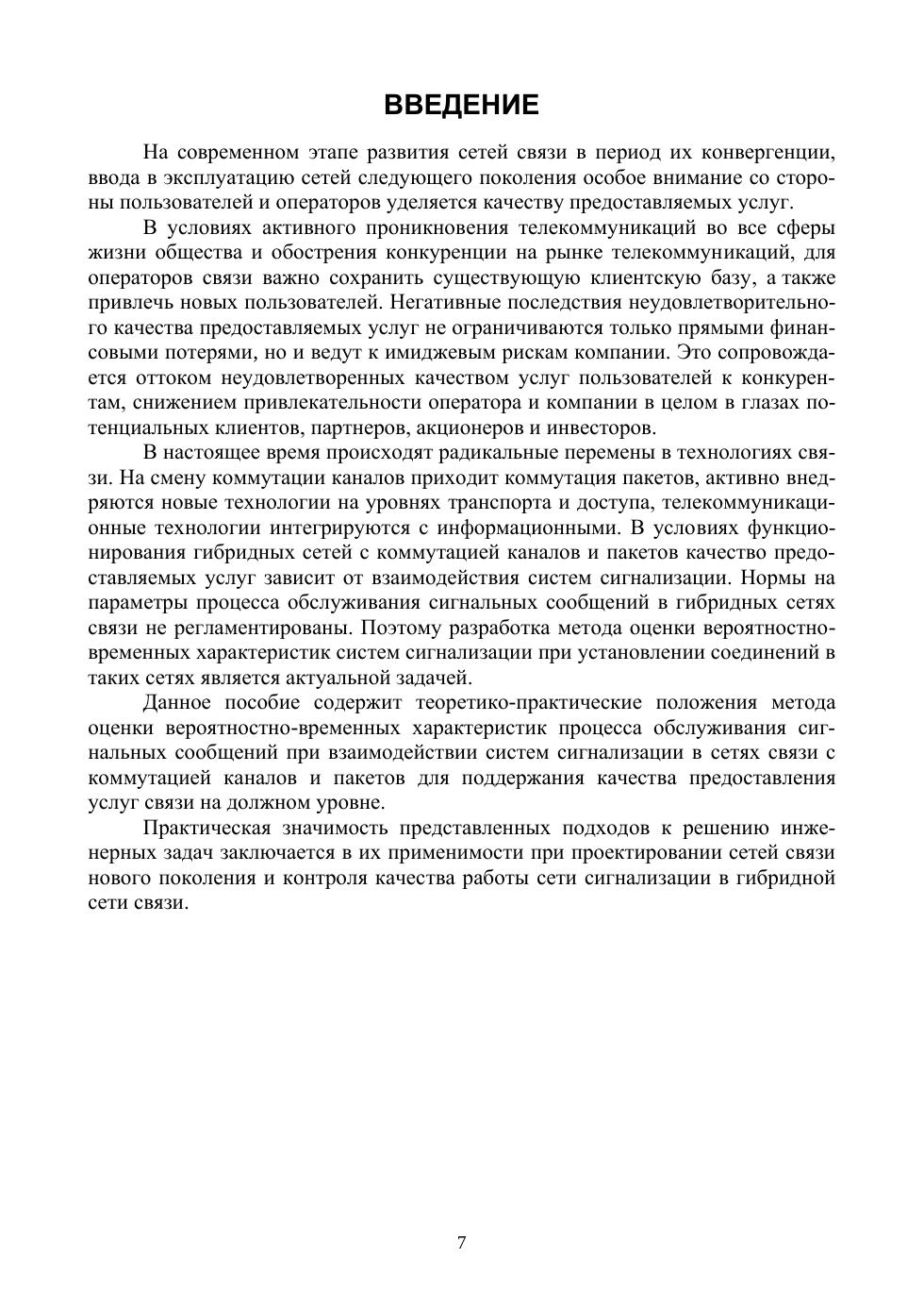 В учебном пособии представлен анализ условий перехода к сетям следующего поколения в РФ и обоснована необходимость разработки методов оценки характеристик качества функционирования гибридной сети связи при взаимодействии систем и протоколов сигнализации различных технологий. Изложена методика и дан пример численного анализа существующих методов расчета интенсивности сигнальной нагрузки в гибридных сетях связи при взаимодействии протоколов сигнализаций ОКС-7, SIGTRAN и SIP. Описаны методы разработки функциональной и математической моделей установления сигнальных соединений из цифровой сети ТфОП в сеть IP/MPLS и обратно в виде сети массового обслуживания. Предложен метод расчета показателей качества обслуживания сигнальных сообщений при взаимодействии протоколов сигнализации ОКС-7, SIGTRAN и SIP в сетях с коммутацией каналов и пакетов.