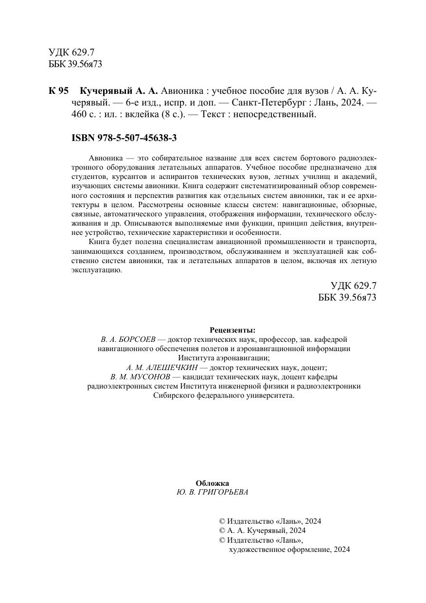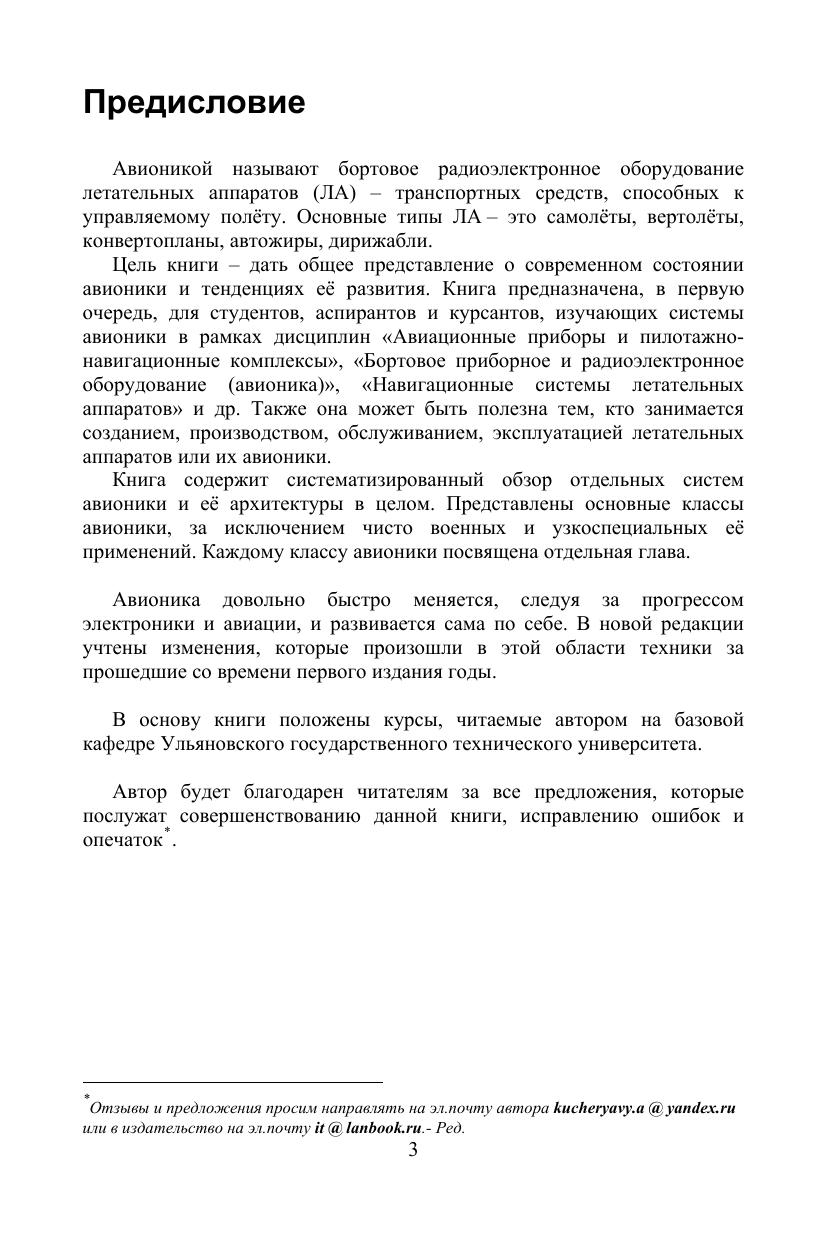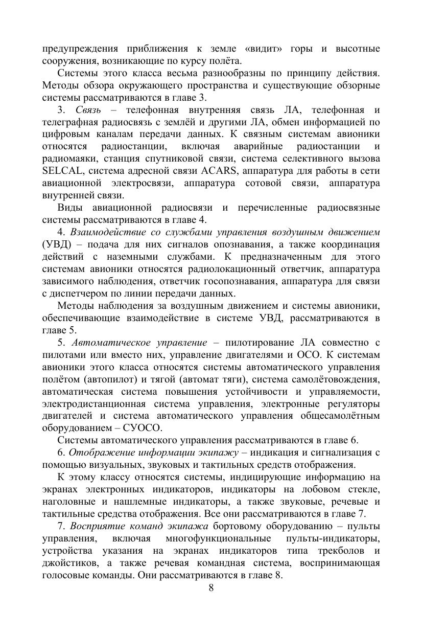 Авионика — это собирательное название для всех систем бортового радиоэлектронного оборудования летательных аппаратов. Учебное пособие предназначено для студентов, курсантов и аспирантов технических вузов, летных училищ и академий, изучающих системы авионики. Книга содержит систематизированный обзор современного состояния и перспектив развития как отдельных систем авионики, так и ее архитектуры в целом. Рассмотрены основные классы систем: навигационные, обзорные, связные, автоматического управления, отображения информации, технического обслуживания и др. Описываются выполняемые ими функции, принцип действия, внутреннее устройство, технические характеристики и особенности. Книга будет полезна специалистам авиационной промышленности и транспорта, занимающихся созданием, производством, обслуживанием и эксплуатацией как собственно систем авионики, так и летательных аппаратов в целом, включая их летную эксплуатацию.