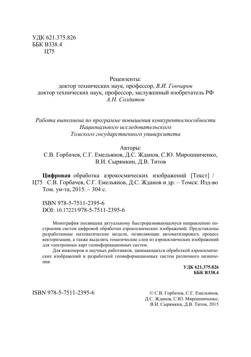 Монография посвящена актуальному быстроразвивающемуся направлению построения систем цифровой обработки аэрокосмических изображений. Представлены разработанные математические модели, позволяющие автоматизировать процесс векторизации, а также выделять тематические слои из аэрокосмических изображений для электронных карт геоинформационных систем. Для инженеров и научных работников, занимающихся обработкой аэрокосмичех изображений и разработкой геоинформационных систем различного назначения.